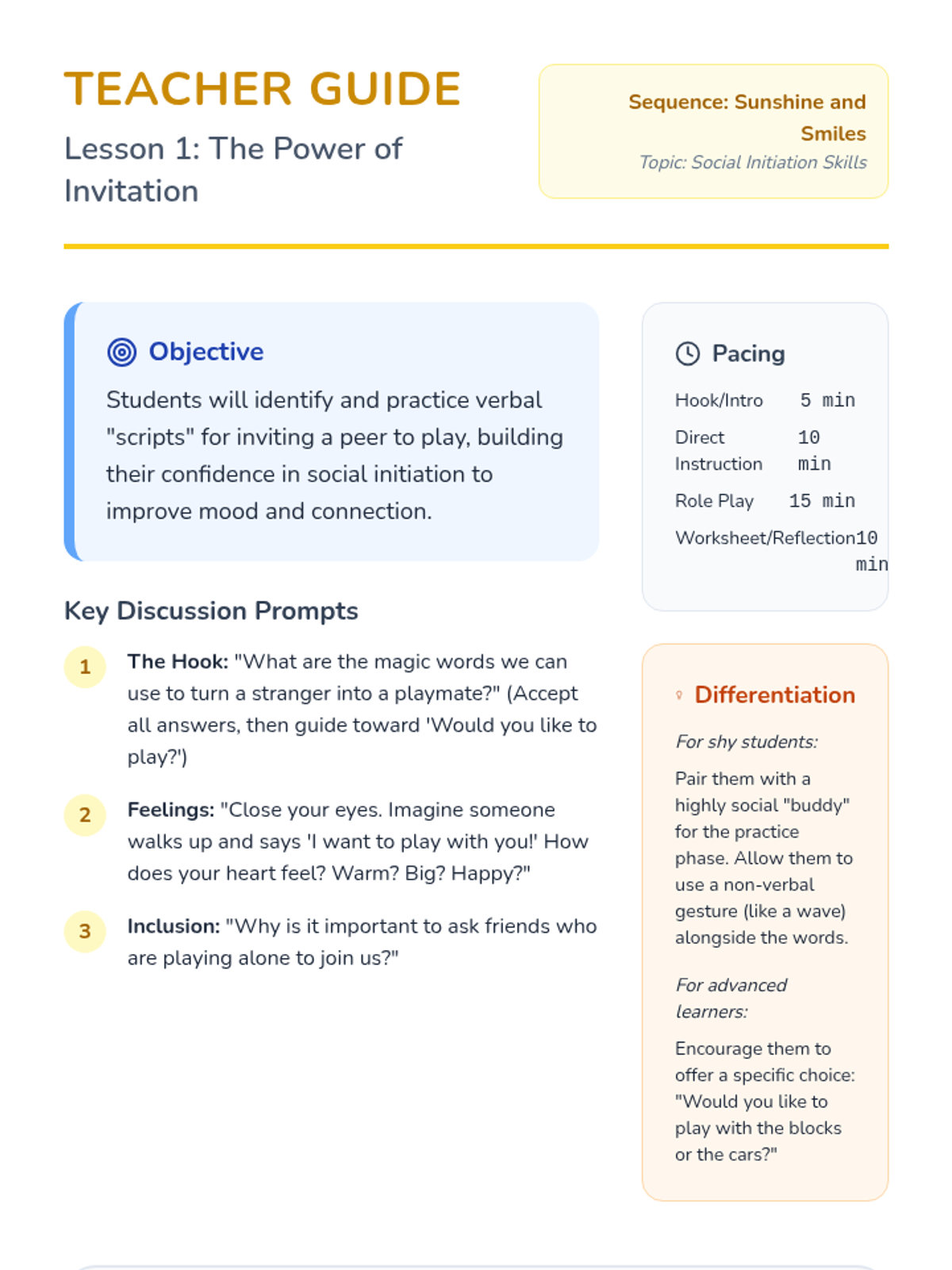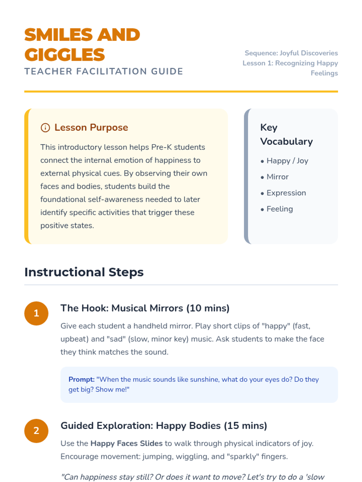 A Pre-K sequence focused on moving from individual joy to shared happiness through social connection, invitations, collaboration, and celebration. Students learn how community and play amplify positive emotions and build resilience.