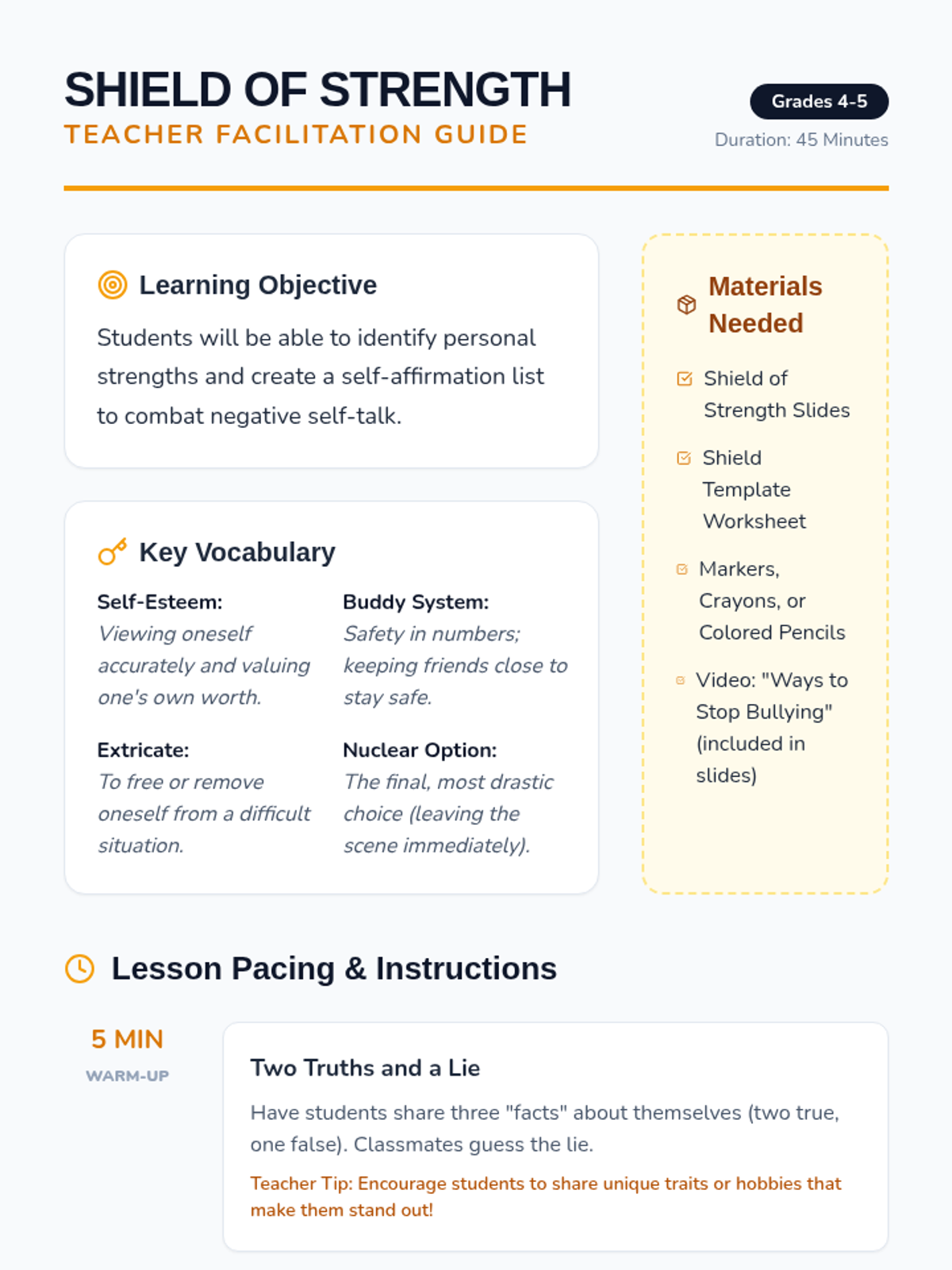 A social-emotional learning unit focused on building self-esteem, identifying personal strengths, and developing strategies to combat bullying and negative self-talk.