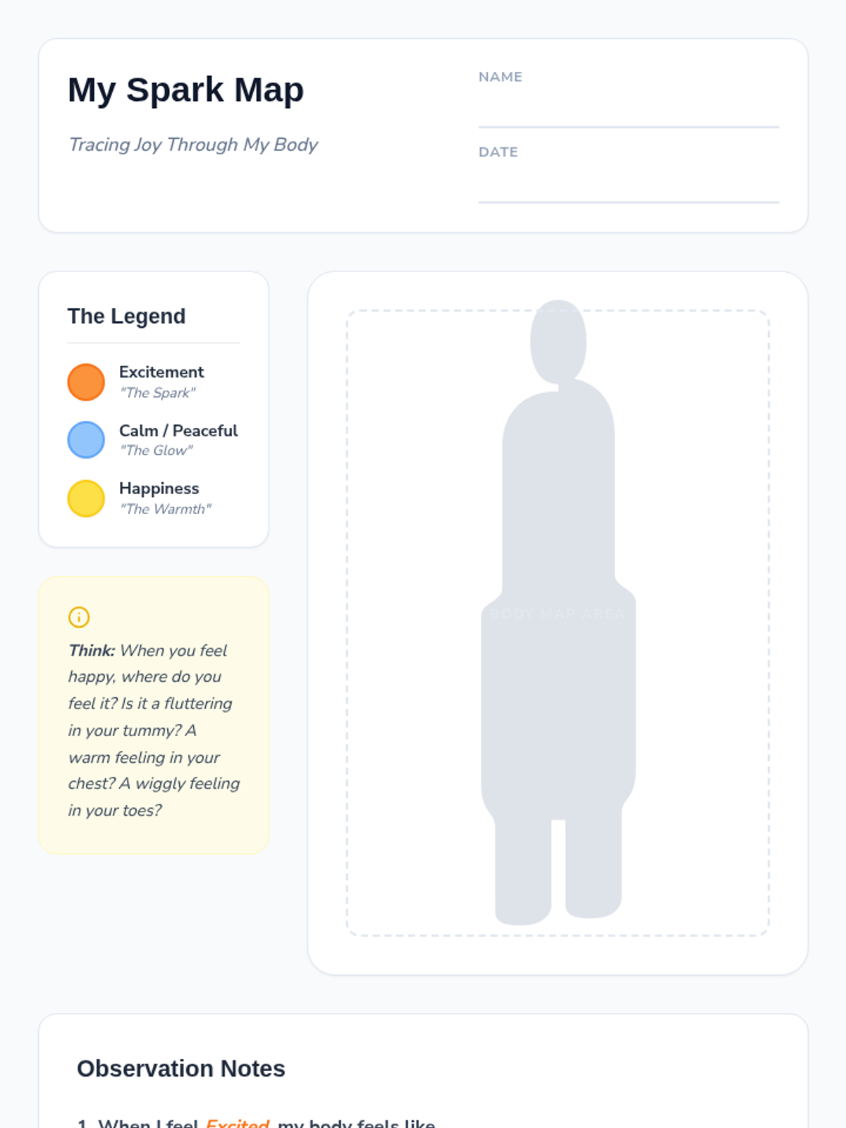 This sequence introduces 3rd-grade students to identifying personal sources of joy and satisfaction. It guides them through recognizing physical emotional shifts, inventorying interests, exploring sensory joy, categorizing activities by energy levels, and creating a personalized 'menu' of coping strategies for emotional regulation.