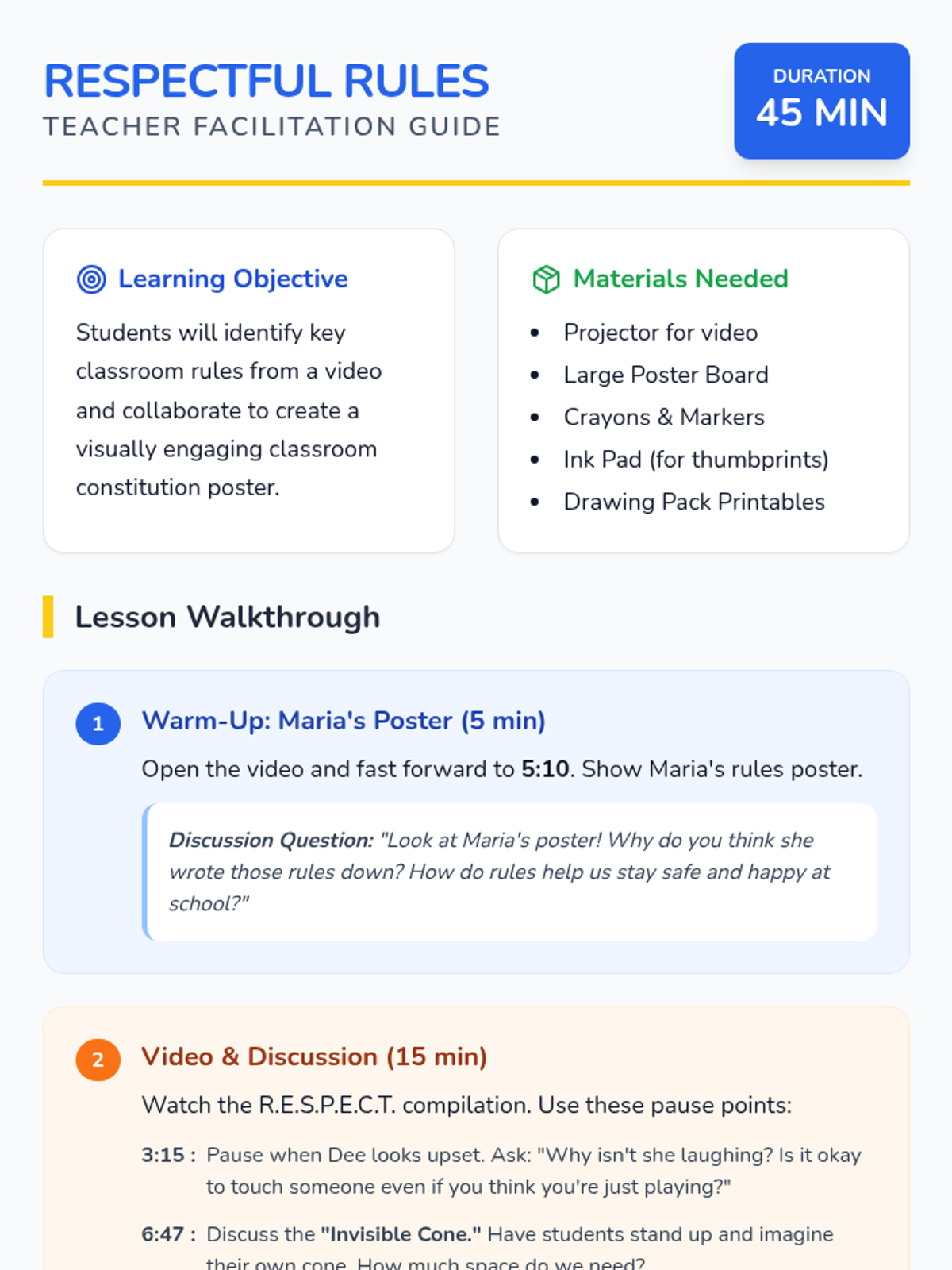 A series of activities focused on building a respectful classroom community through understanding personal boundaries, communication, and shared expectations.