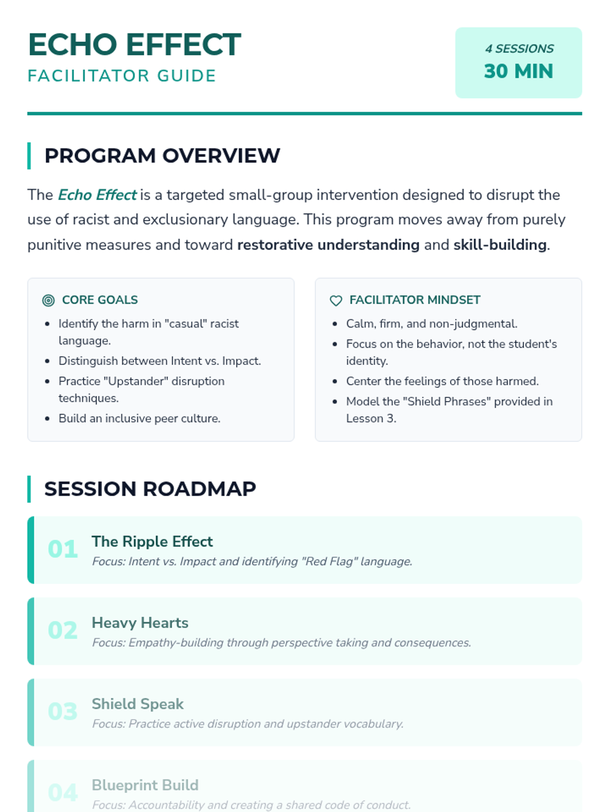 A 4-session small group series designed to help students understand the impact of harmful language, develop empathy, and practice upstander strategies to build an inclusive environment. The series uses the 'Echo Effect' metaphor to illustrate how words ripple through a community.