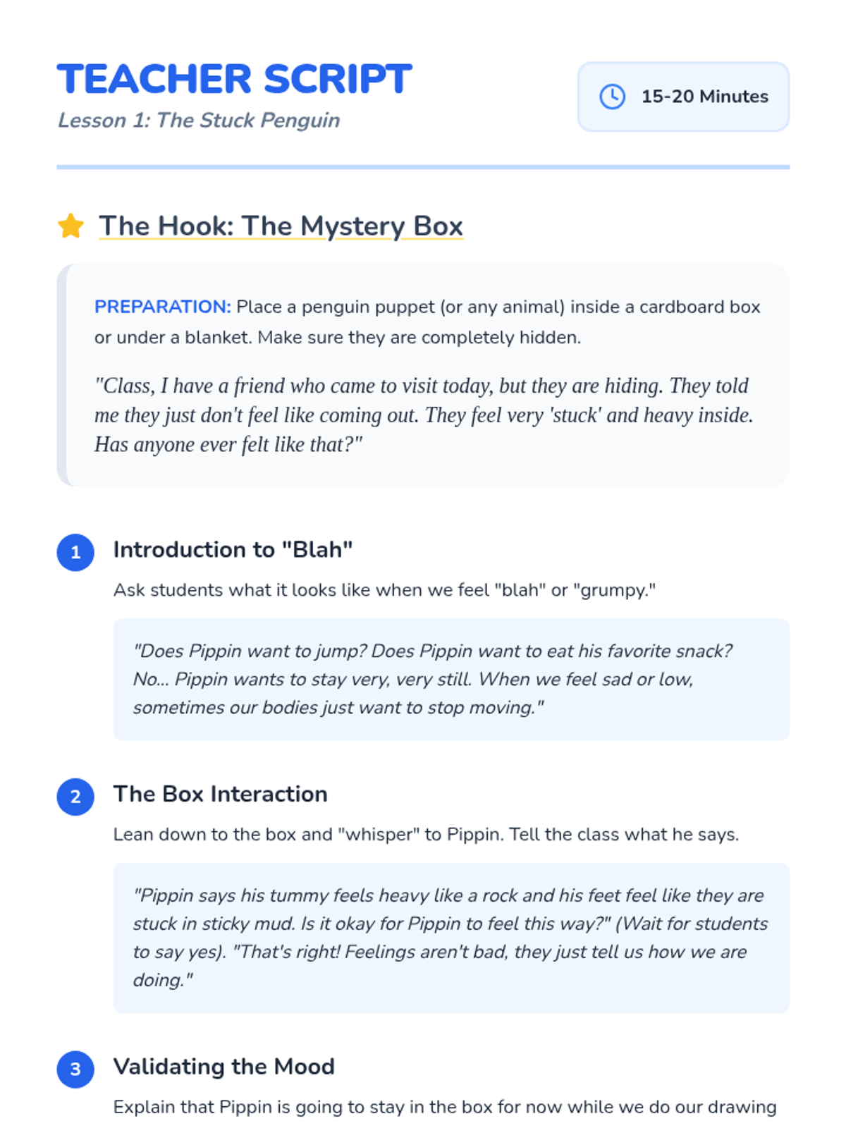 A Pre-K sequence introducing behavioral activation concepts by helping a puppet character navigate low moods through small, physical actions and kindness. Students learn that 'doing' can change 'feeling' in a developmentally appropriate, narrative-driven way.