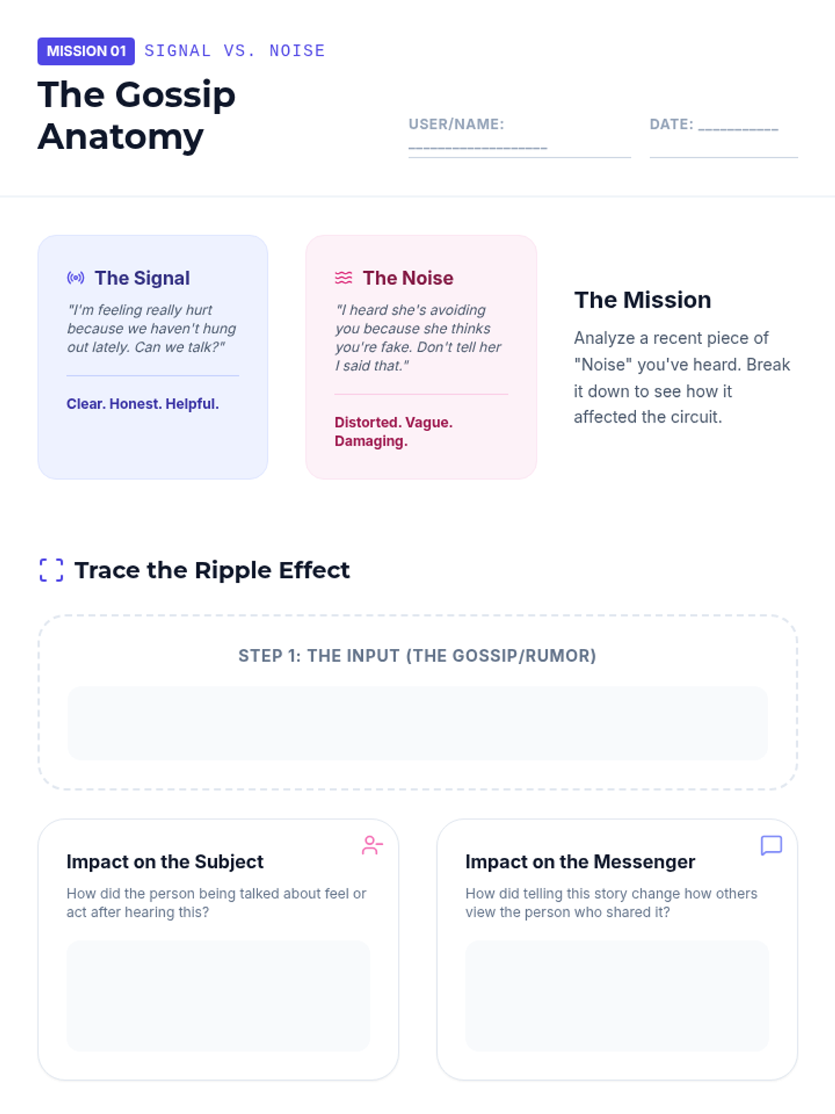 A 5-day communication and emotional intelligence unit for 8th graders. Using the metaphor of radio signals, students learn to identify emotional "static," regulate their "frequency," and broadcast "clear signals" in collaborative environments.