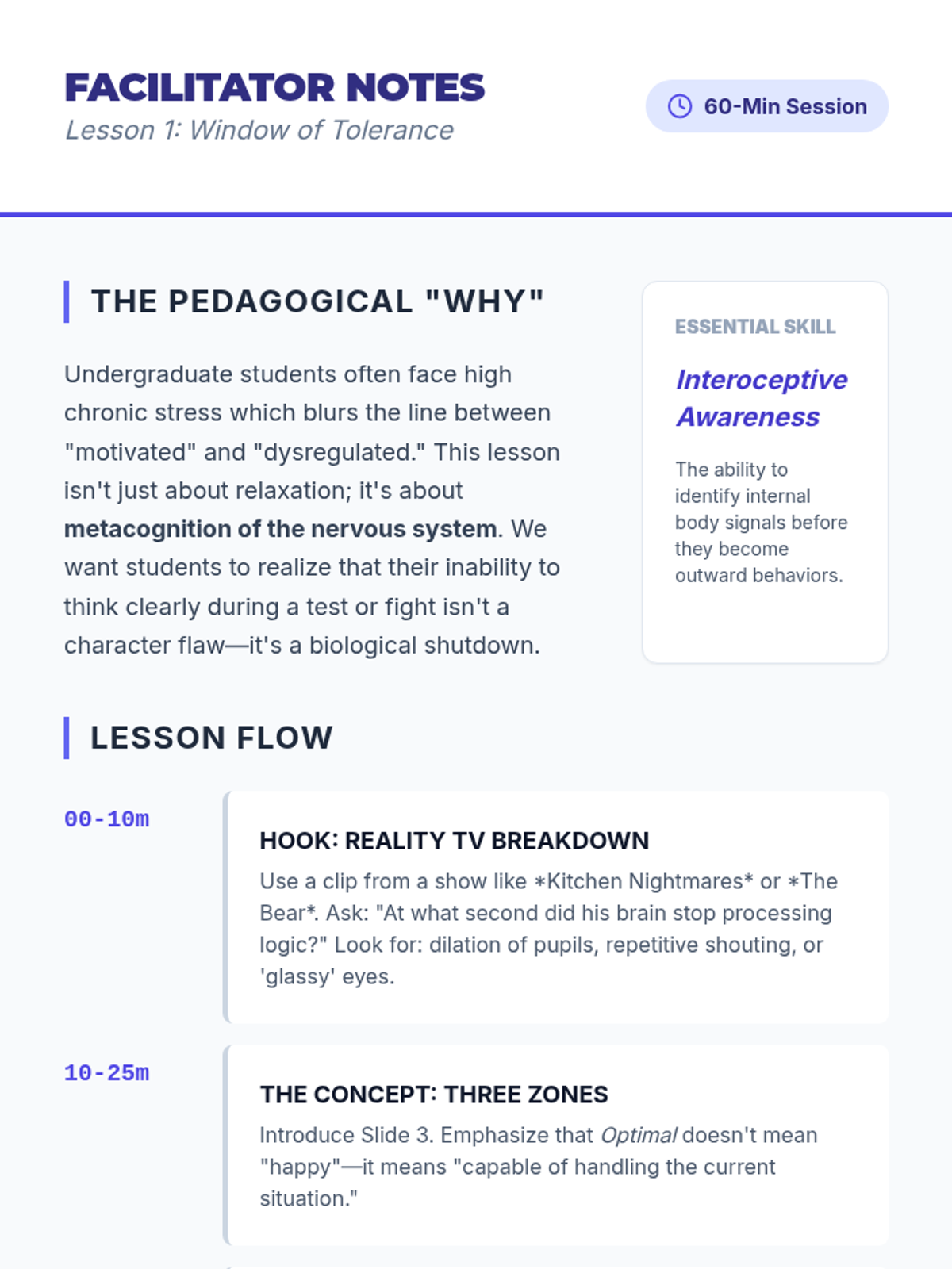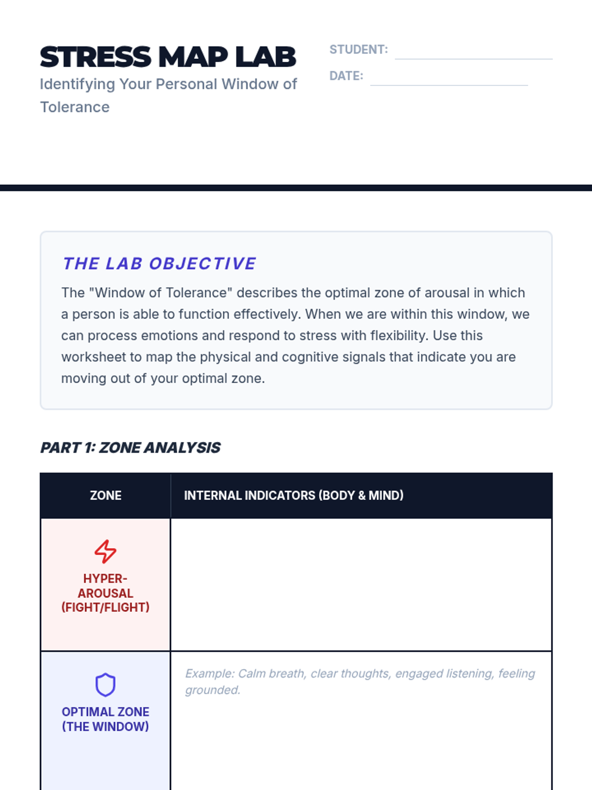 A mastery-focused sequence where undergraduate students audit their current stress responses and design a personalized, tiered emotional regulation protocol. Students use systems thinking to build resilient habits and prepare for future distress.