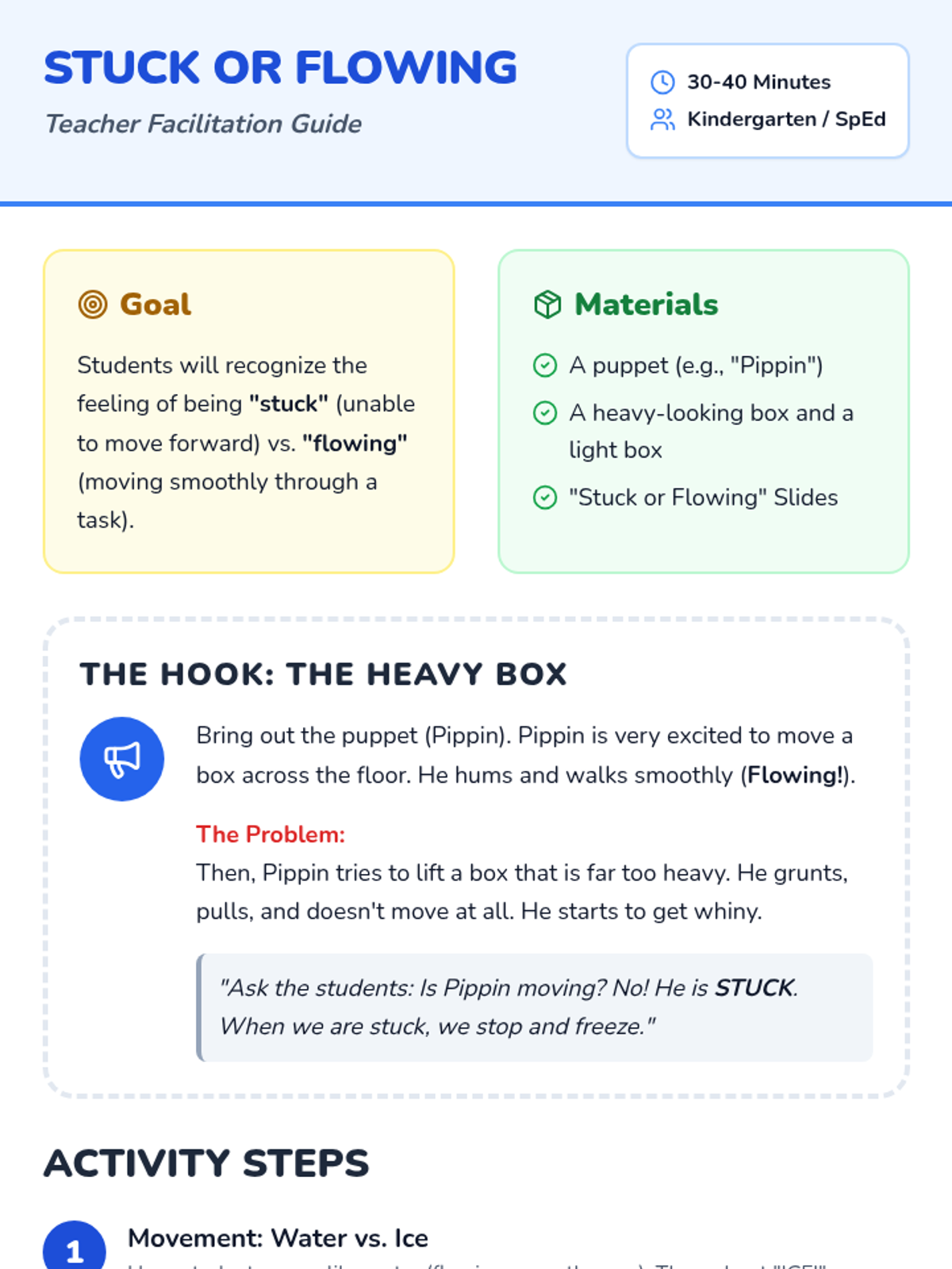 A Kindergarten sequence focused on identifying obstacles and naming barriers to task completion. Students learn to recognize the feeling of being 'stuck', differentiate between small glitches and big blockers, and use visual tools to communicate problems before frustration escalates.