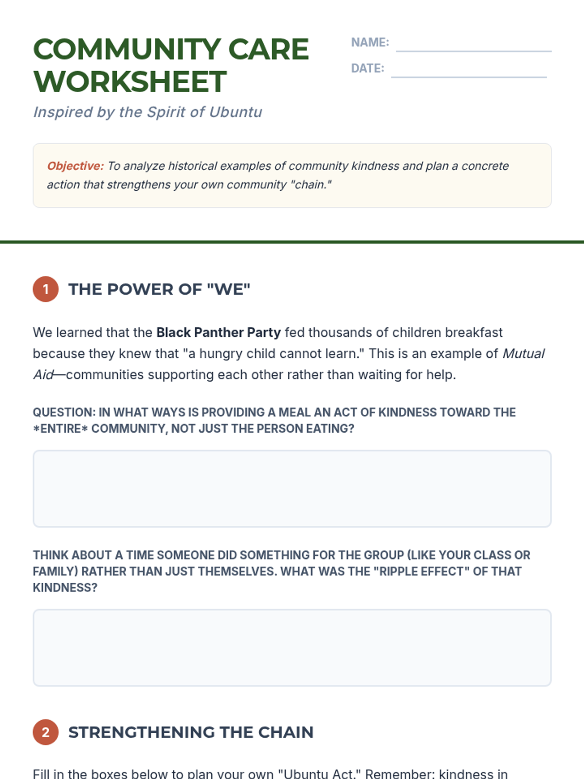 A Black History Month unit for 6th graders focusing on the intersection of kindness, community care, and civil rights legacies. Students explore the concept of Ubuntu and historical examples of mutual aid to develop empathy and social responsibility.