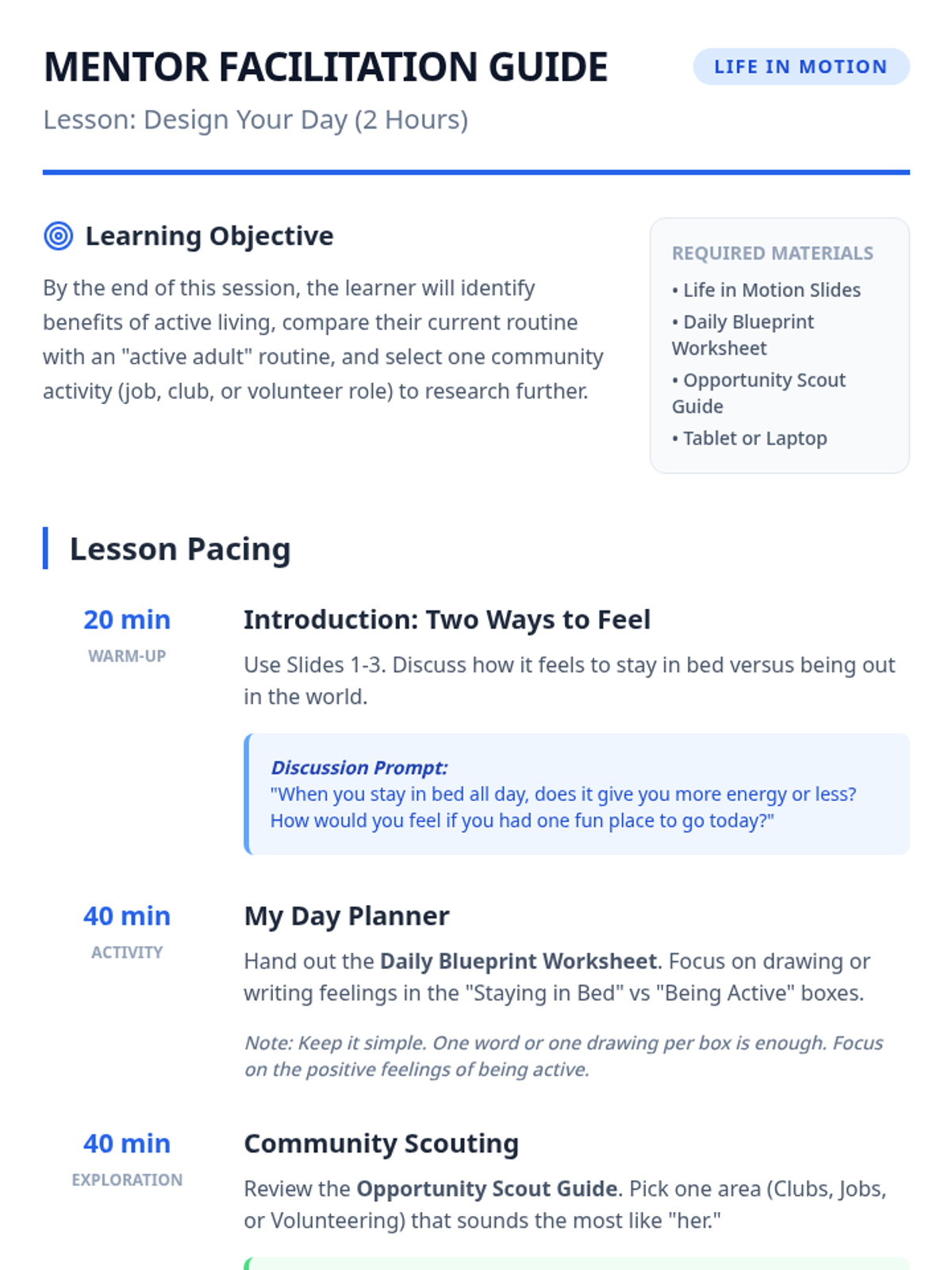 A comprehensive sequence designed to help adults with disabilities develop time management skills and engage in meaningful community activities like work, volunteering, and hobbies.