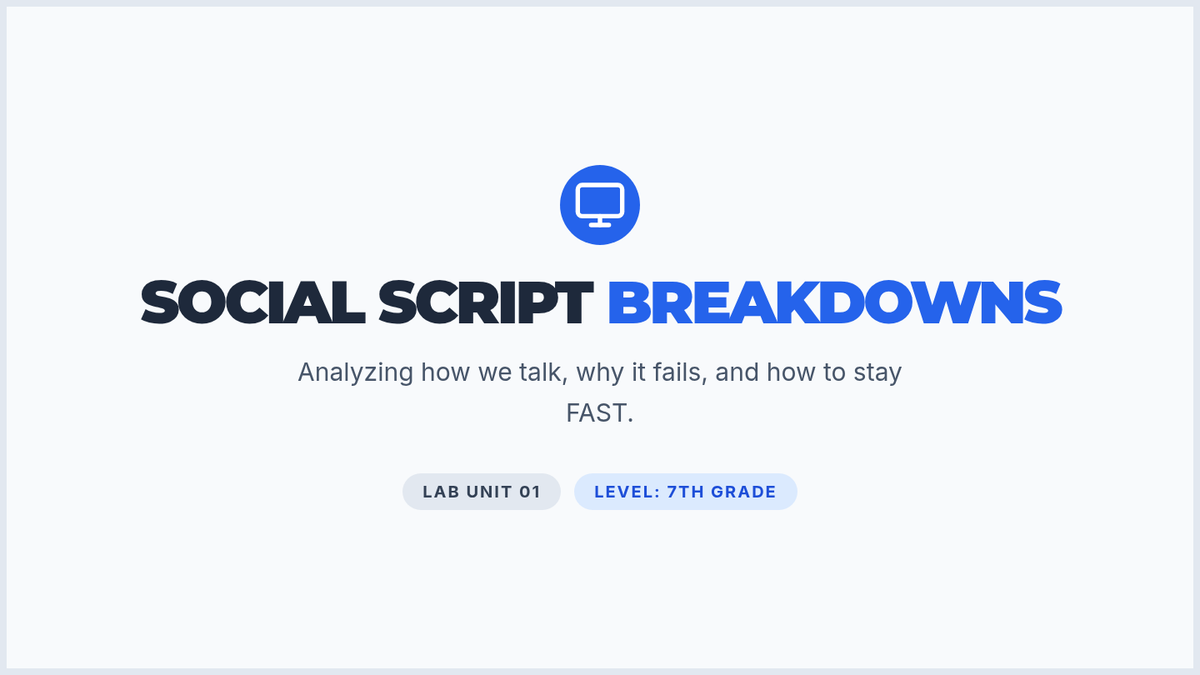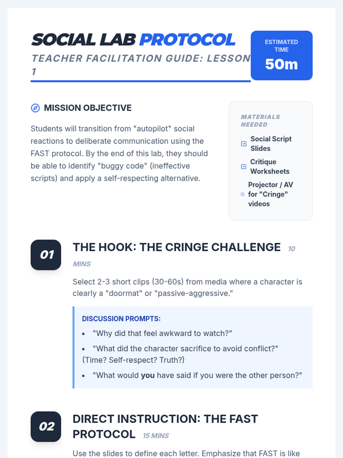 A simulation-heavy sequence for 7th graders to master FAST skills (Fair, Apologies, Stick to values, Truthful) through social labs, role-plays, and pattern recognition.
