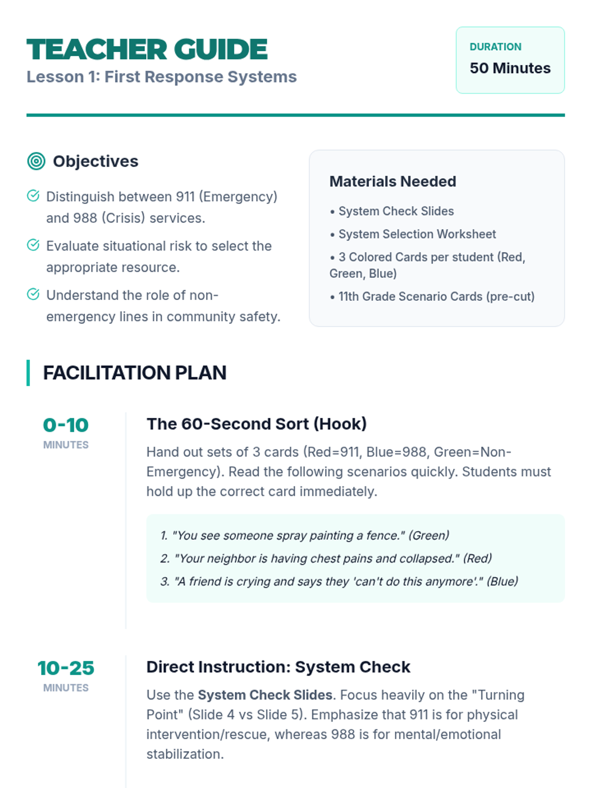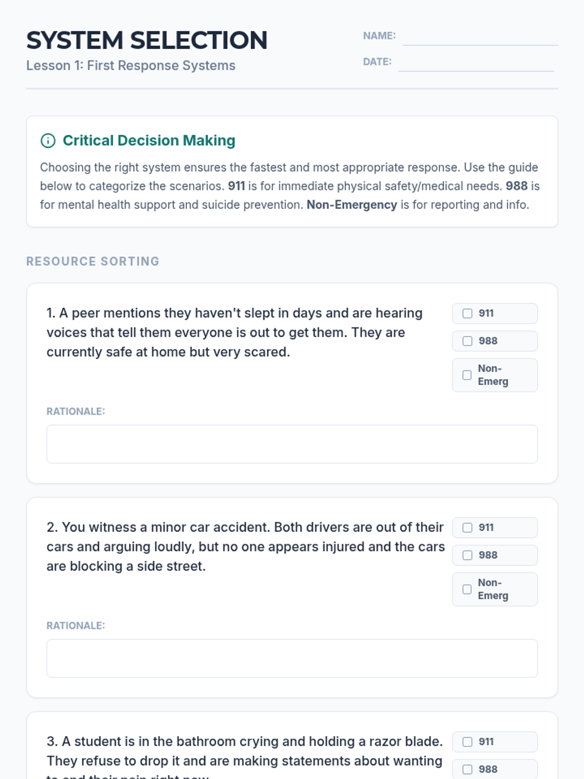 This sequence guides 11th-grade students through the logistical and procedural aspects of crisis intervention. Students learn to distinguish between 911 and 988, understand hotline intake protocols, navigate the ethics of confidentiality, explore specialized digital tools, and practice referring peers to appropriate professional resources.