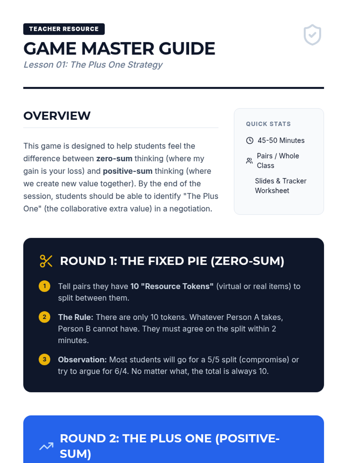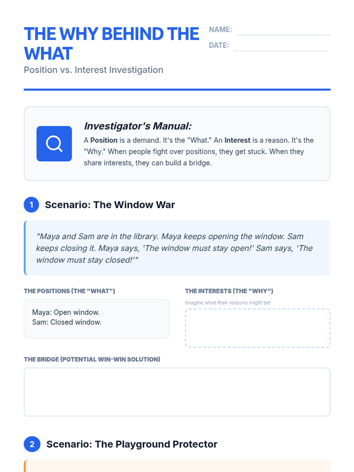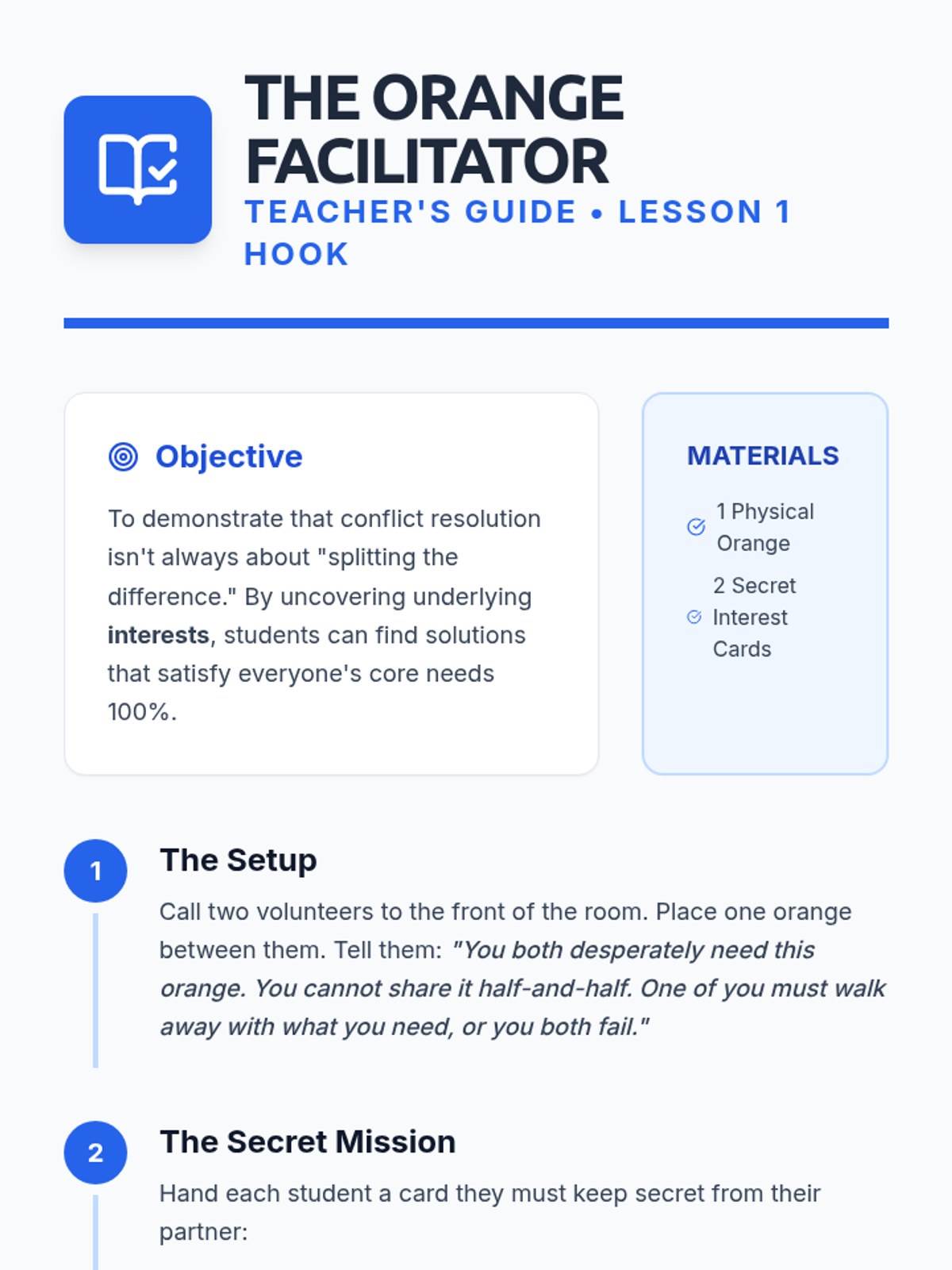 A 5-lesson sequence for 6th graders focusing on Interests-Based Negotiation. Students move from rigid positions to understanding underlying needs, brainstorming creative solutions, and evaluating fairness, culminating in a complex negotiation simulation.