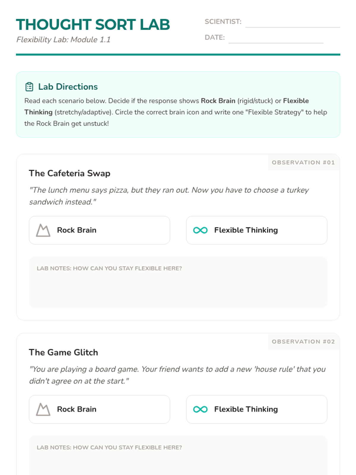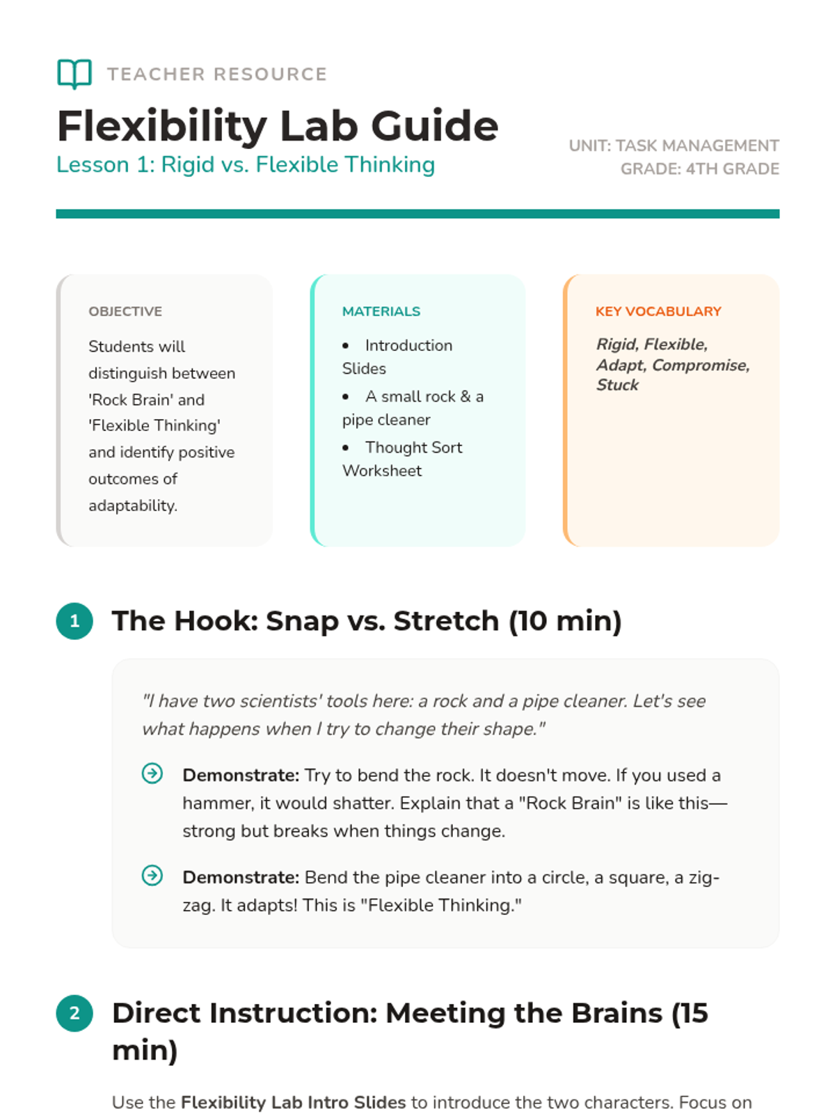 A 5-lesson sequence designed for 4th-grade students to build cognitive flexibility. Students learn to identify rigid versus flexible thinking, recognize physical stress responses to change, practice rapid task-switching, and apply emotional regulation strategies through role-play and a final 'flexibility obstacle course'.