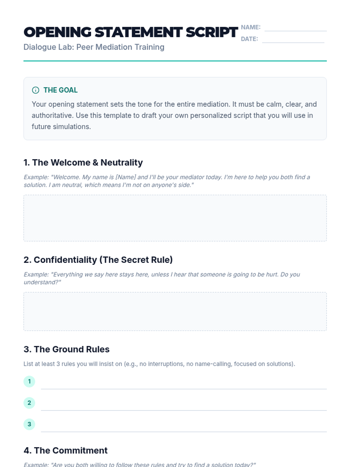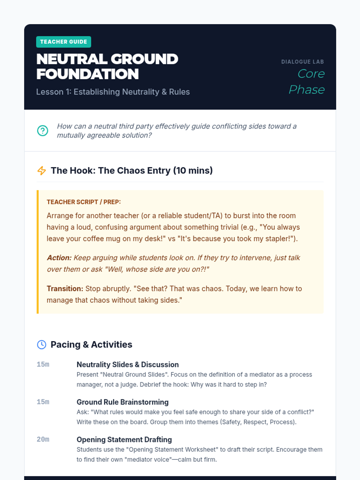 This sequence trains 9th-grade students to facilitate peer mediation. It covers the ethics of neutrality, the structural stages of a mediation session, summarizing complex issues into actionable agendas, and drafting sustainable, SMART agreements, culminating in a mock mediation certification.