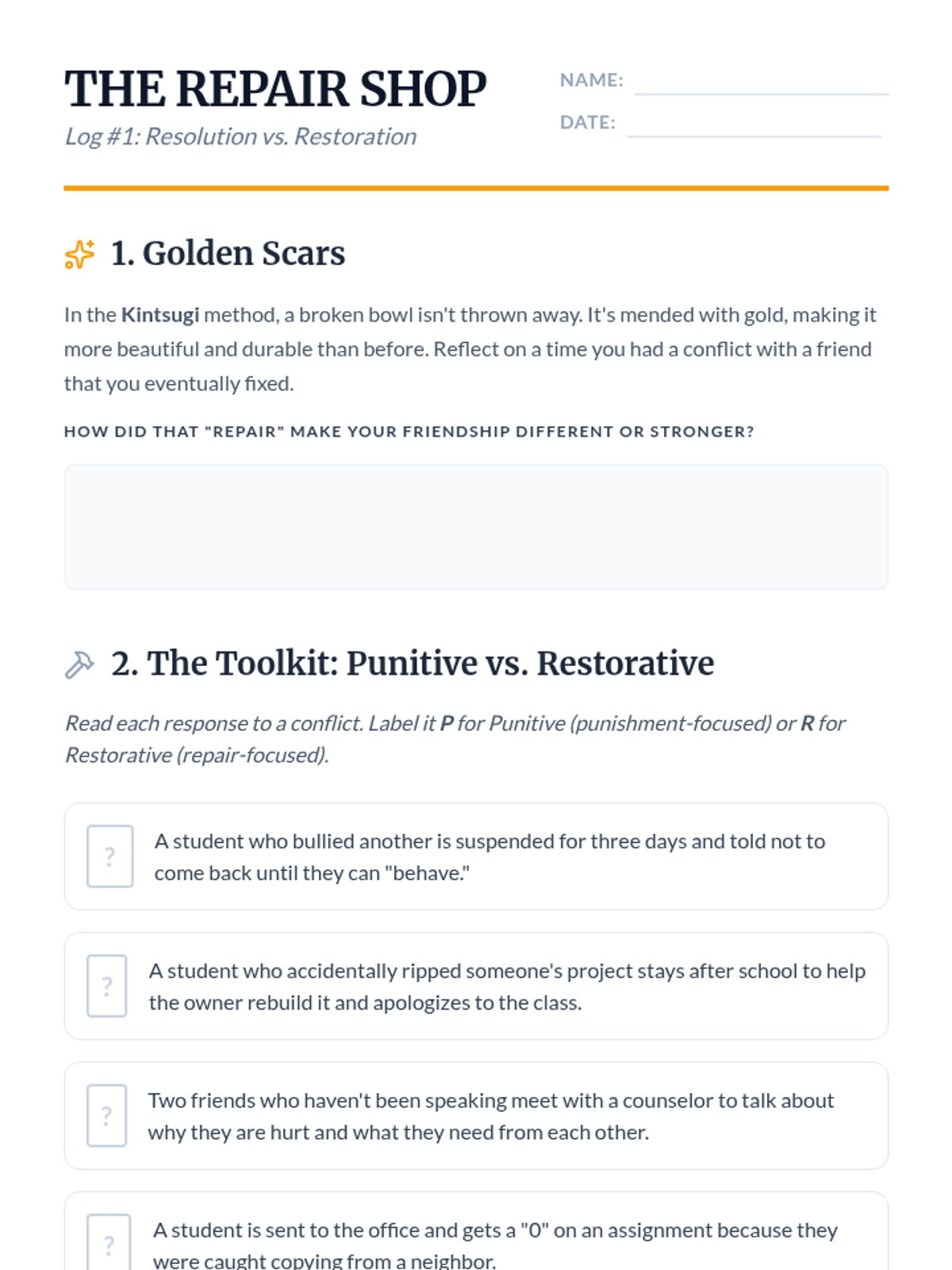A 5-lesson sequence for 6th graders focusing on the aftermath of conflict: restoration, genuine apologies, sustainable agreements, and rebuilding trust. Students move beyond just 'stopping a fight' to actively repairing relationships and creating long-term peace.