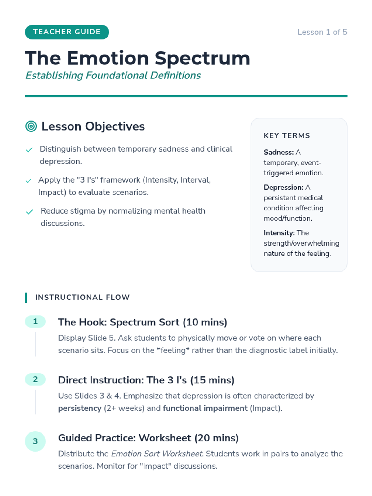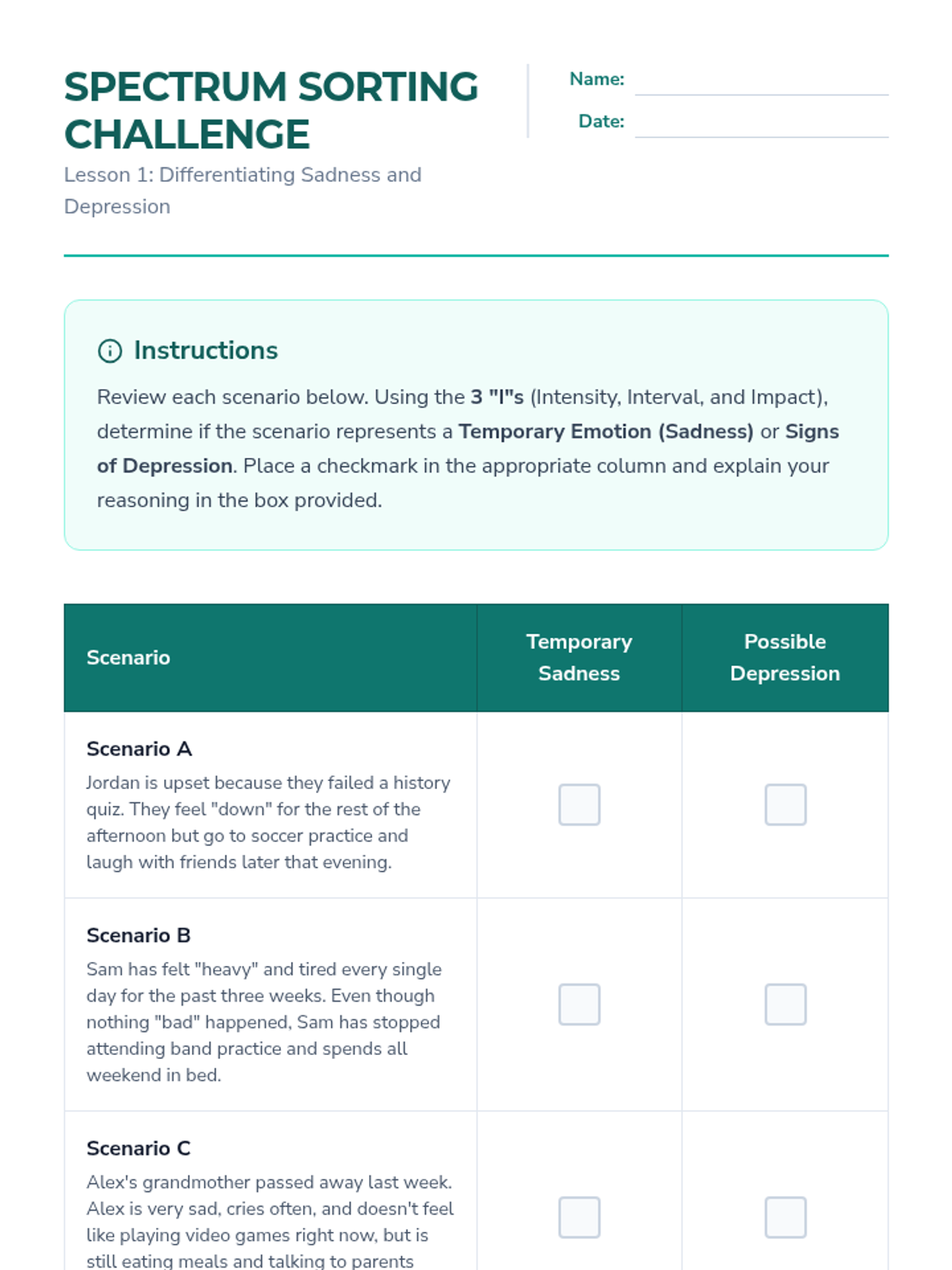 This sequence helps 8th-grade students distinguish between temporary sadness and clinical depression by analyzing behavioral, physical, and emotional indicators. It culminates in learning the ACT (Acknowledge, Care, Tell) strategy for seeking help from trusted adults.