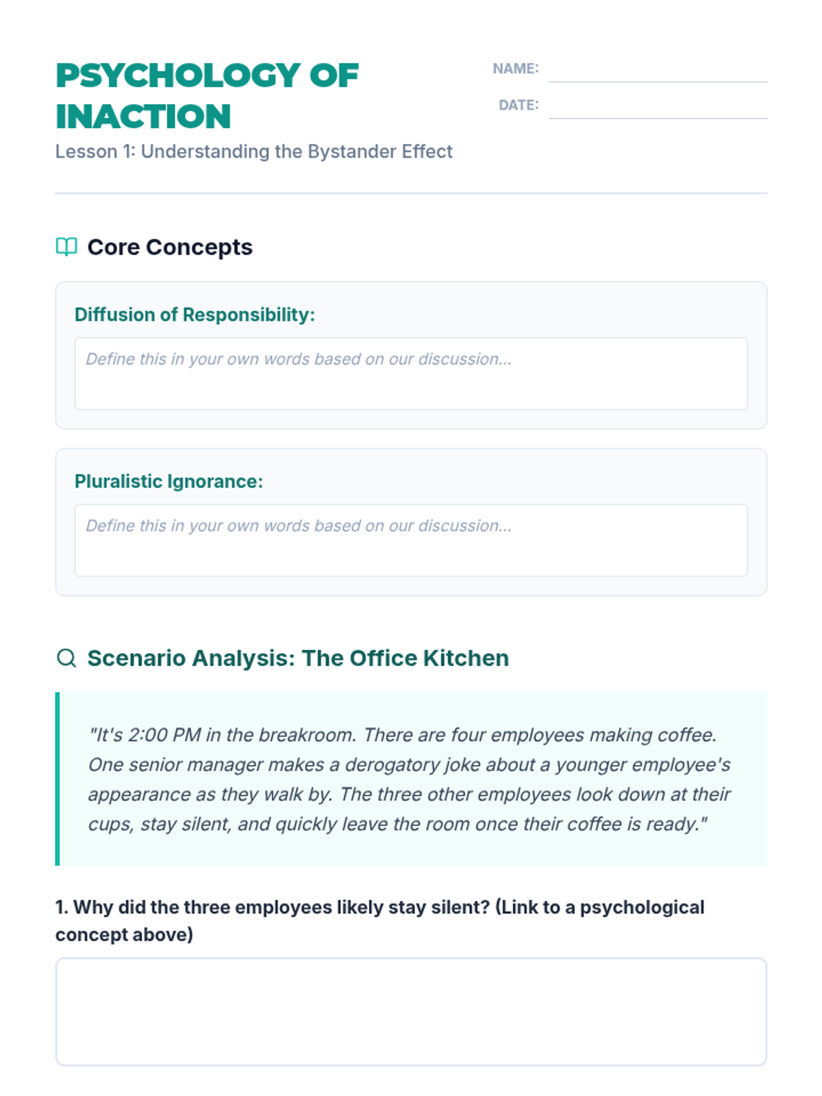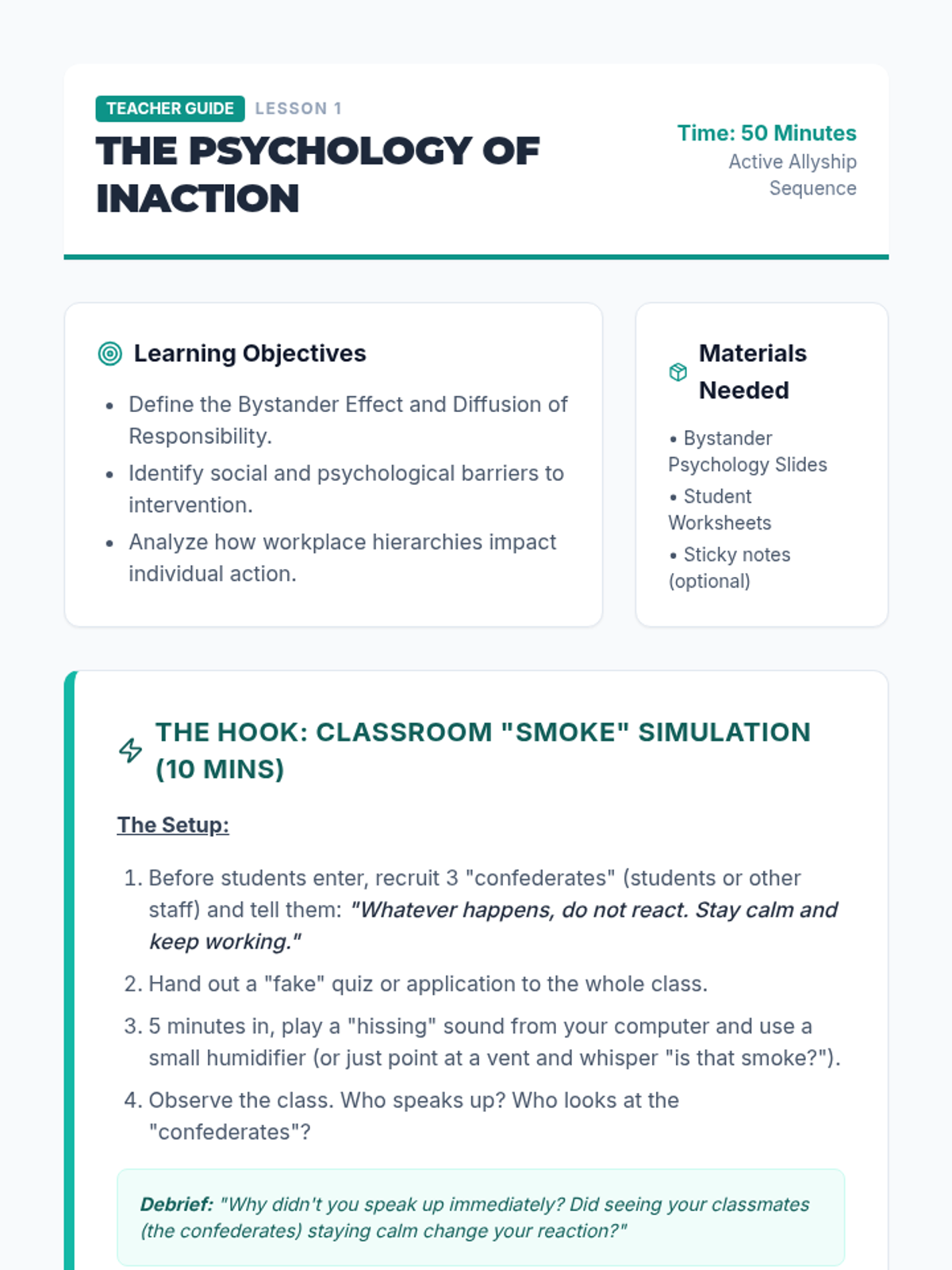 This sequence trains 9th-grade students in bystander intervention techniques and active allyship within a workplace context. Students explore the psychological barriers to action (the bystander effect) and master the '4 Ds'—Direct, Distract, Delegate, and Delay—to safely interrupt harassment and support colleagues.