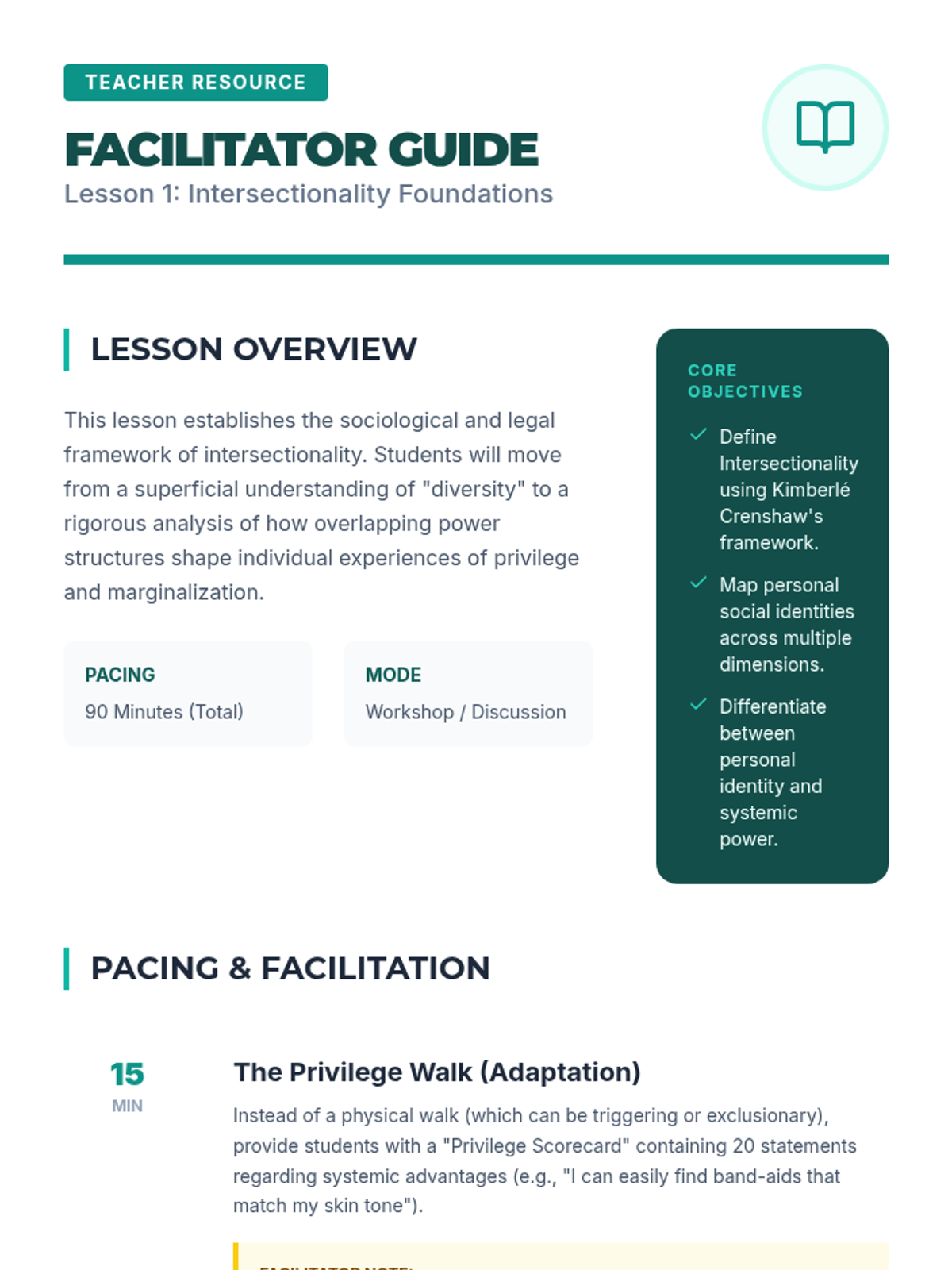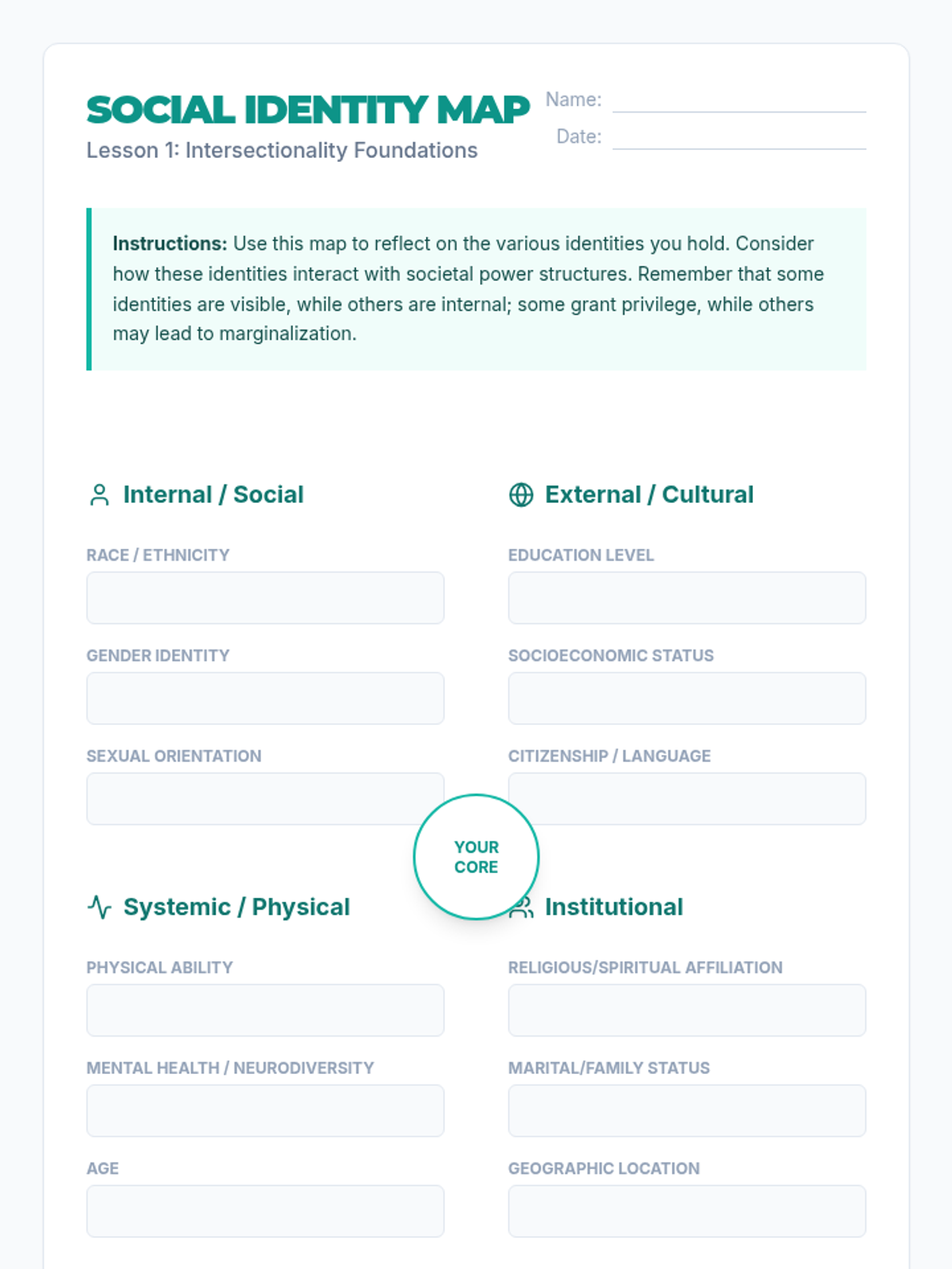 A comprehensive exploration of intersectionality and cultural humility for undergraduate students. This sequence moves from personal identity mapping to institutional accountability, emphasizing lifelong self-reflection and the recognition of power dynamics in professional and community settings.