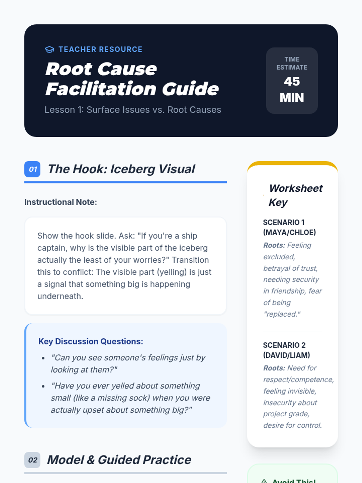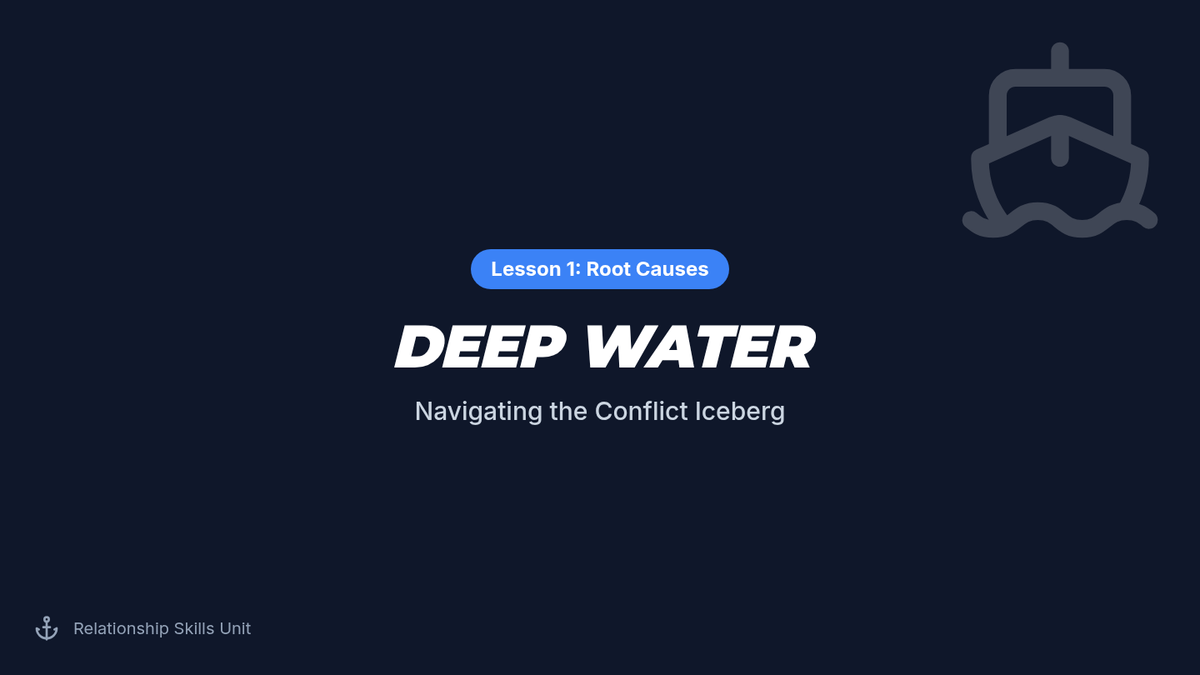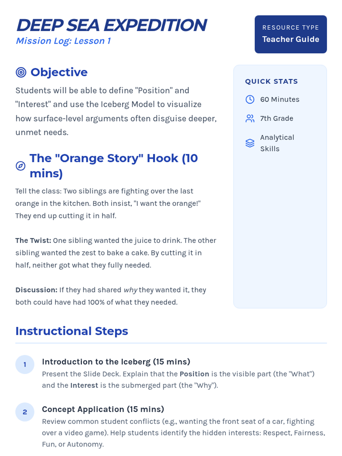 This sequence teaches 7th-grade students to navigate complex conflicts using the Iceberg Model. Students learn to look beneath surface-level arguments ('positions') to identify underlying human needs ('interests') through techniques like the Five Whys, core needs analysis, and multi-party mapping.
