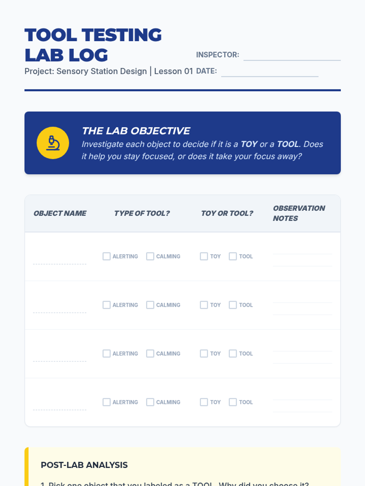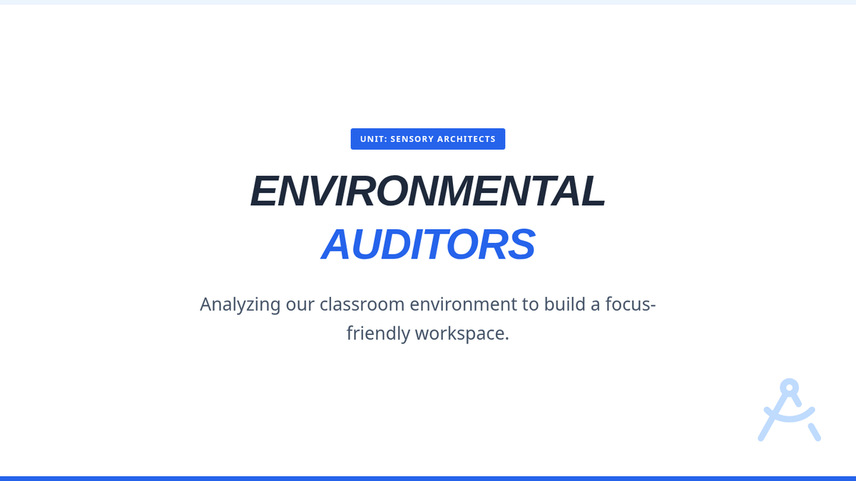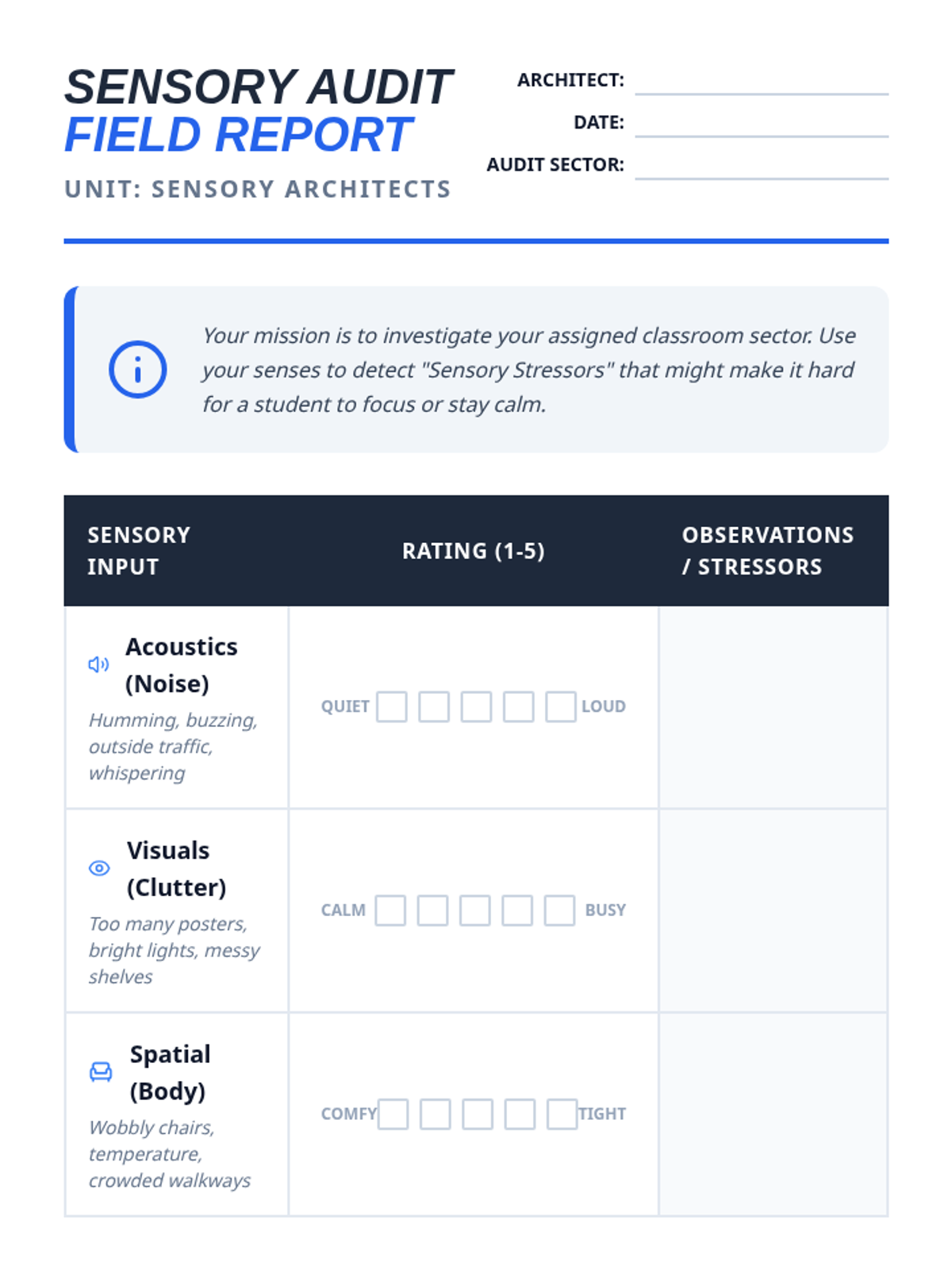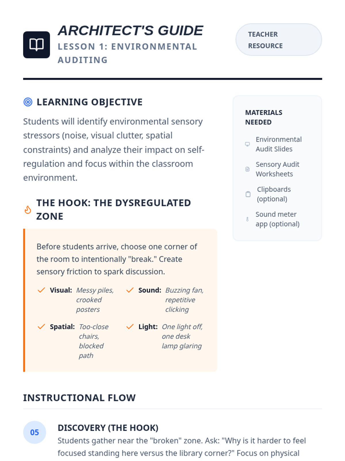 A 5th-grade sequence where students act as 'Sensory Architects' to analyze, design, and implement proactive sensory routines in their classroom. Students focus on environmental audits, schedule analysis, and peer-led interventions to support collective focus and regulation.