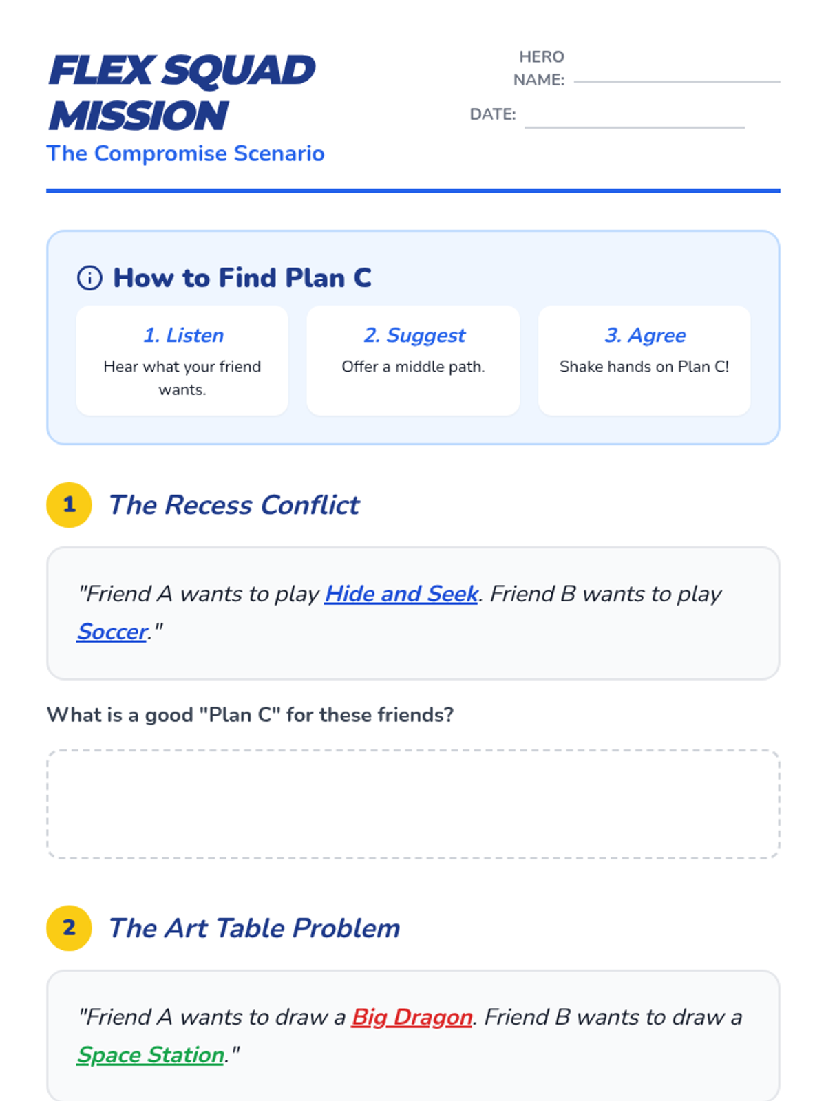 This sequence teaches 2nd-grade students how to adapt to social plan changes and peer conflicts using flexibility strategies. Students learn to negotiate compromises, handle absent partners, solve resource problems, and support peers experiencing change-related distress.