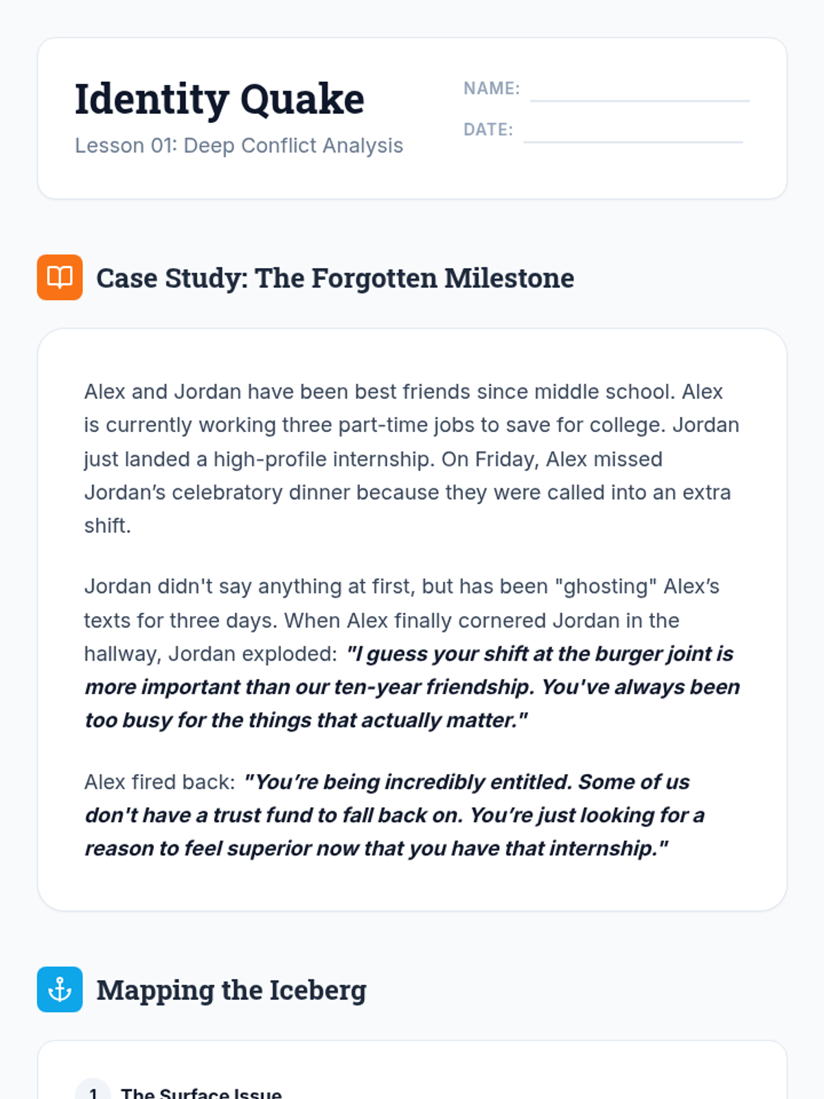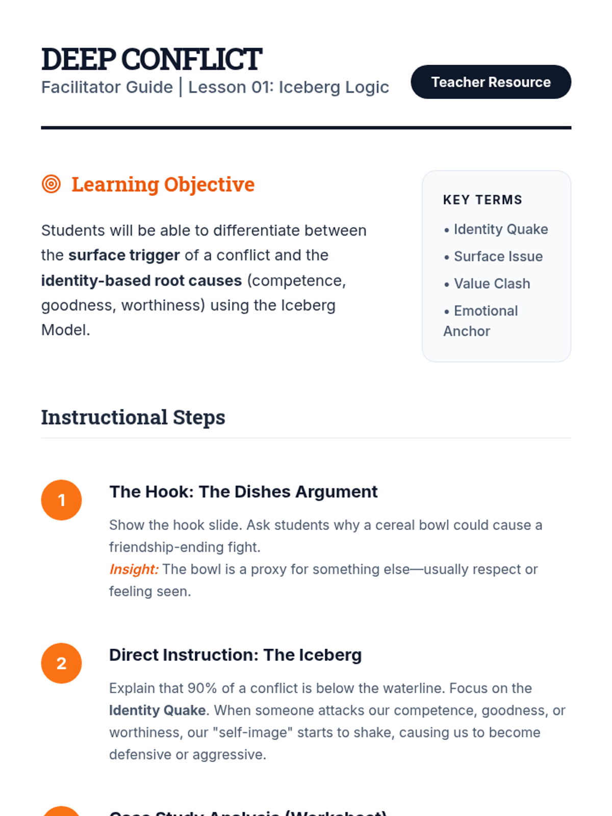 A comprehensive 9th-grade sequence exploring the psychological and biological roots of conflict. Students learn to distinguish visible behaviors from hidden needs, understand the neuroscience of emotional escalation, and develop practical self-regulation strategies to navigate complex interpersonal disputes.