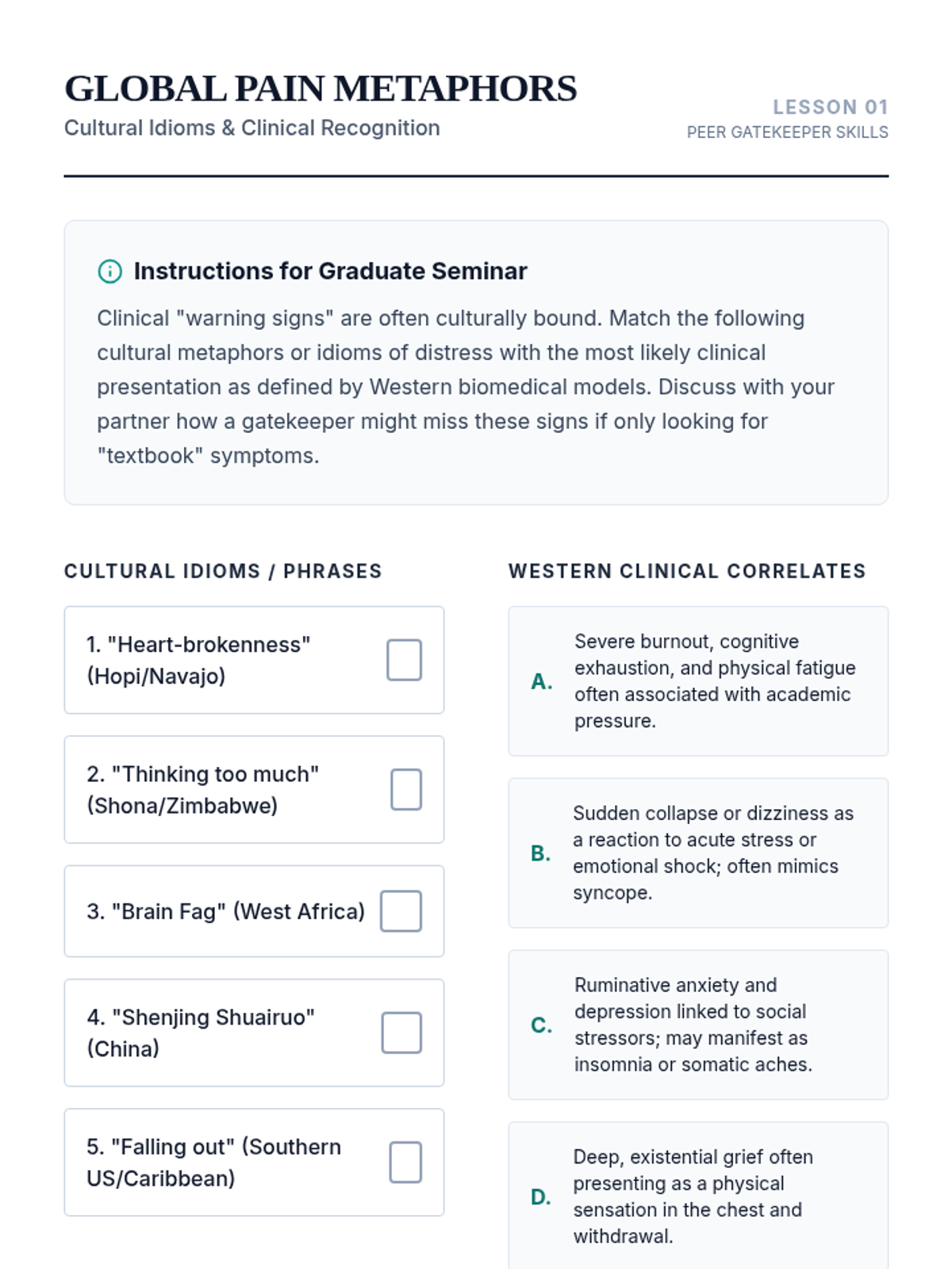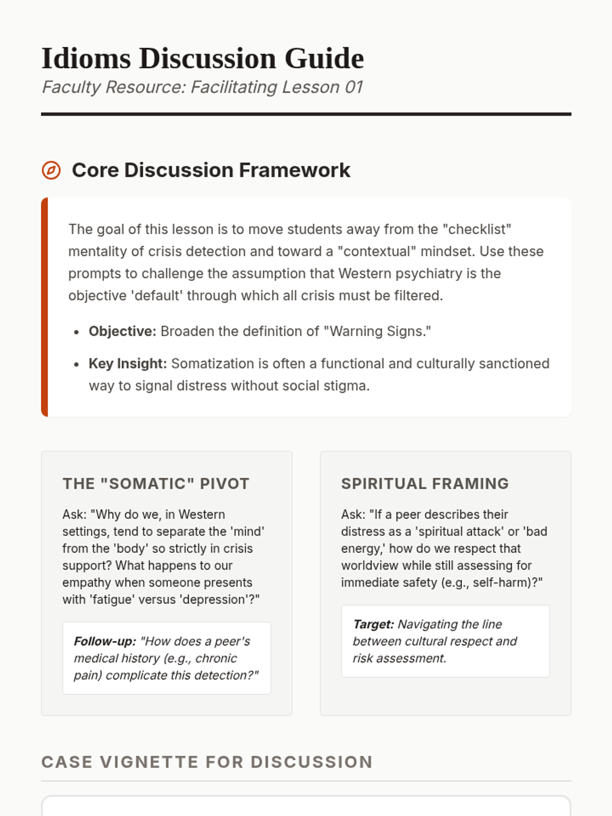 A comprehensive graduate-level training sequence exploring how cultural identity, systemic barriers, and implicit bias influence crisis presentation and peer support. Students move from understanding diverse cultural idioms of distress to developing culturally responsive safety plans that challenge traditional Western medical models.