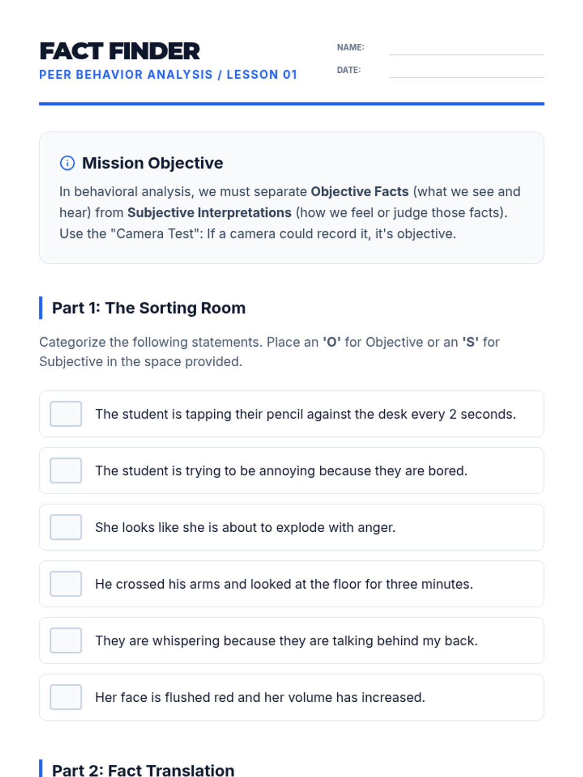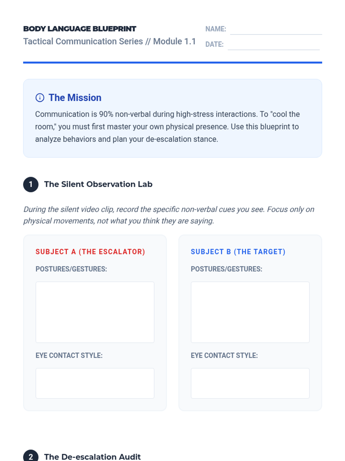 This sequence teaches 11th-grade students how to observe and document behavioral baselines and non-verbal escalation cues. Students move from identifying neutral behaviors to recognizing subtle kinetic and facial indicators of stress to prevent conflict through early observation.