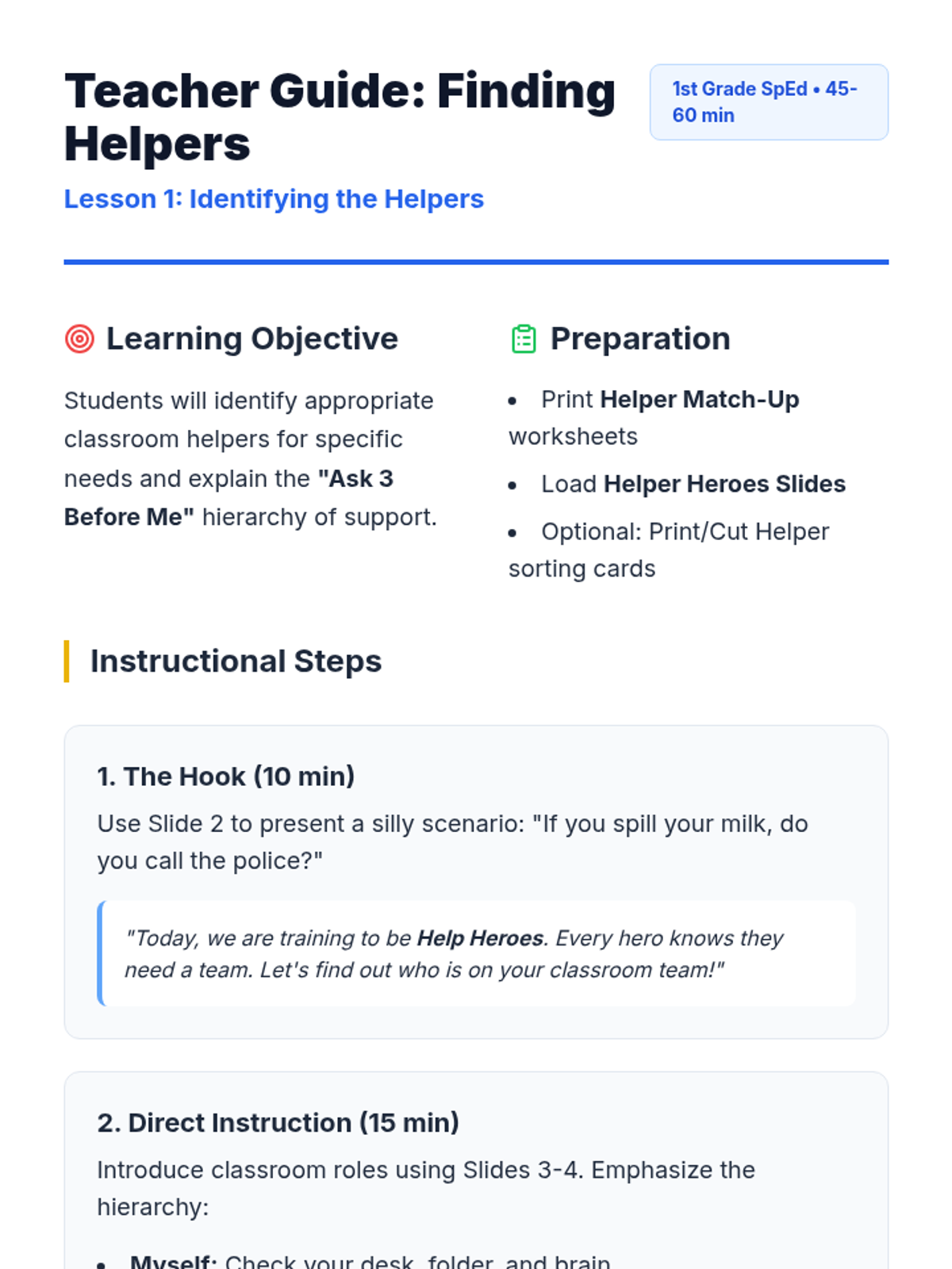 A 5-lesson sequence for 1st Grade students on identifying classroom helpers, getting attention appropriately, phrasing requests, and managing wait time. This program empowers students to advocate for their needs independently and politely.