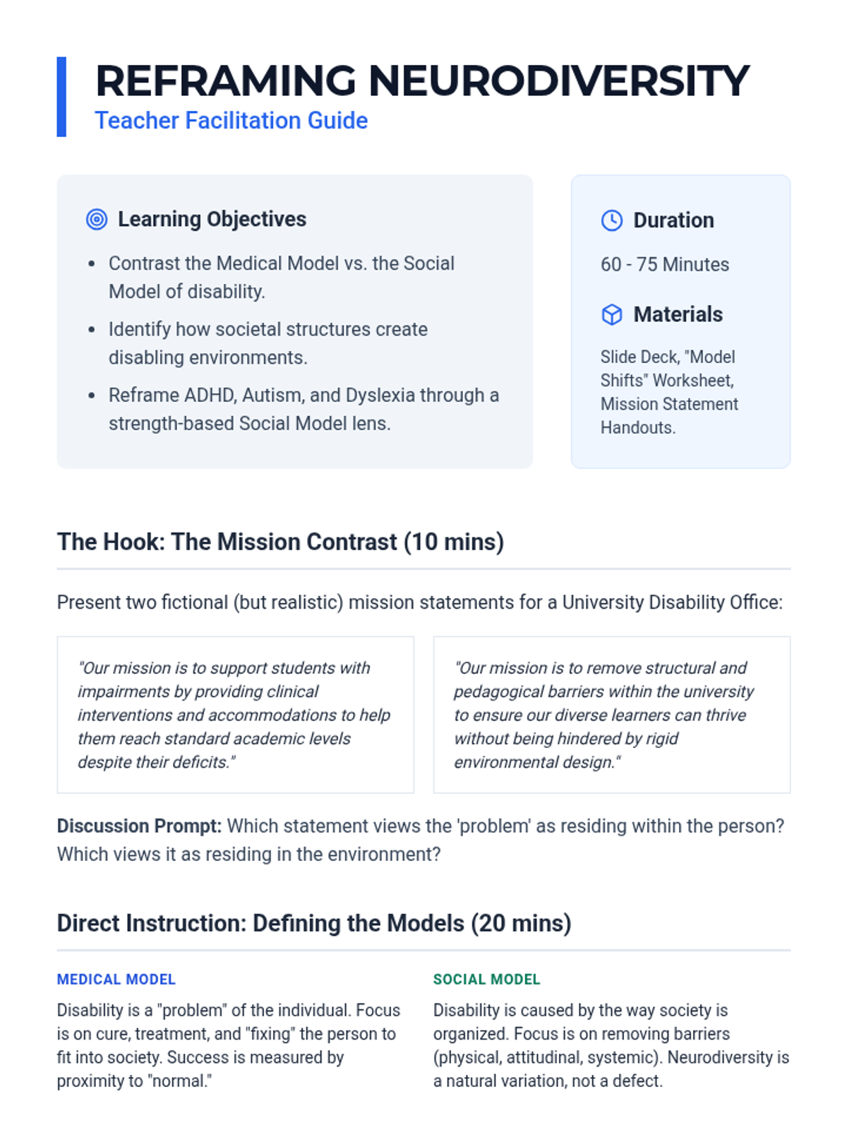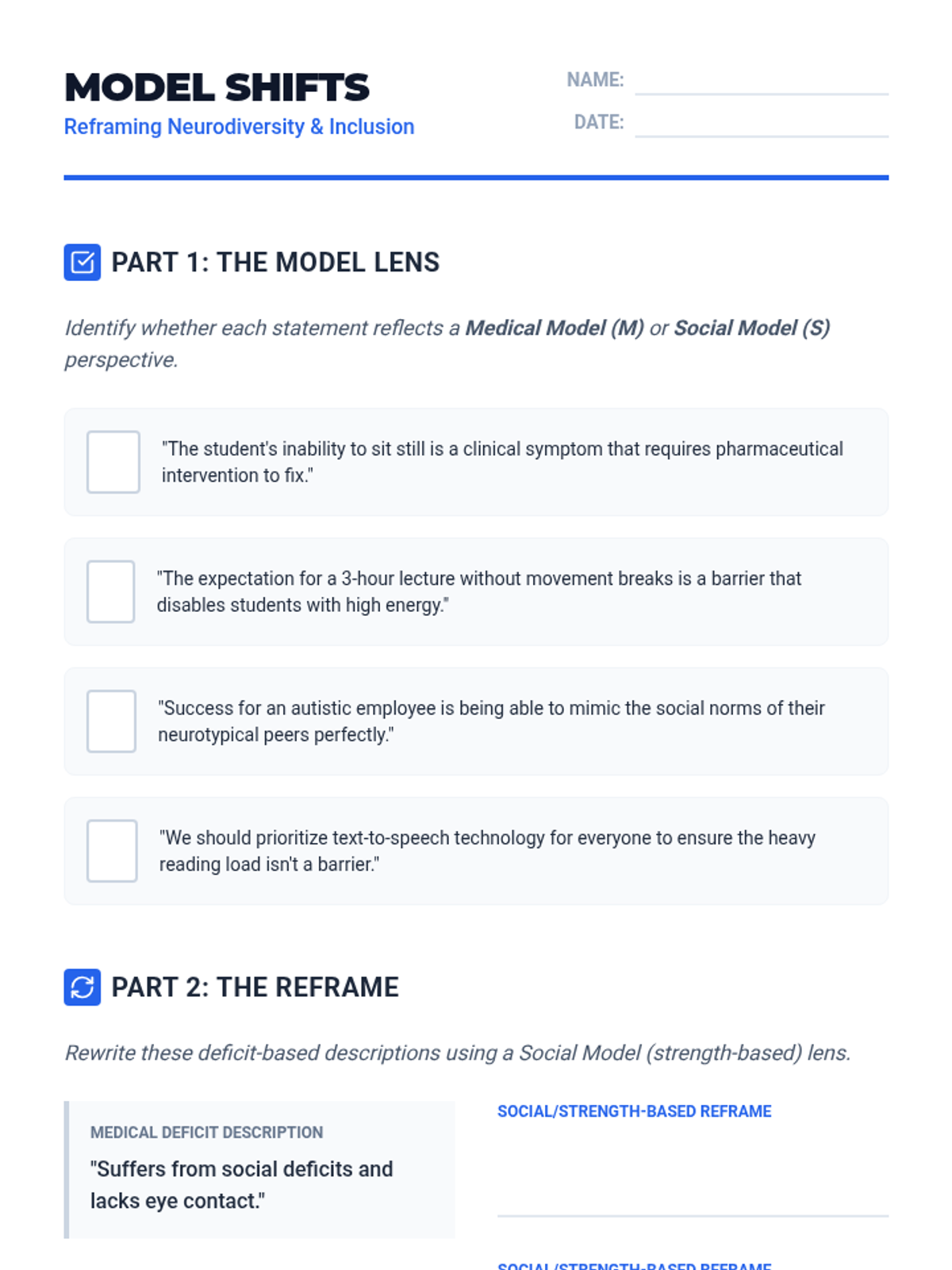 This sequence explores neurodiversity through the Social Model of disability, challenging traditional norms of professionalism and designing inclusive environments. Students will move from theoretical understanding to practical application in organizational policy and advocacy.