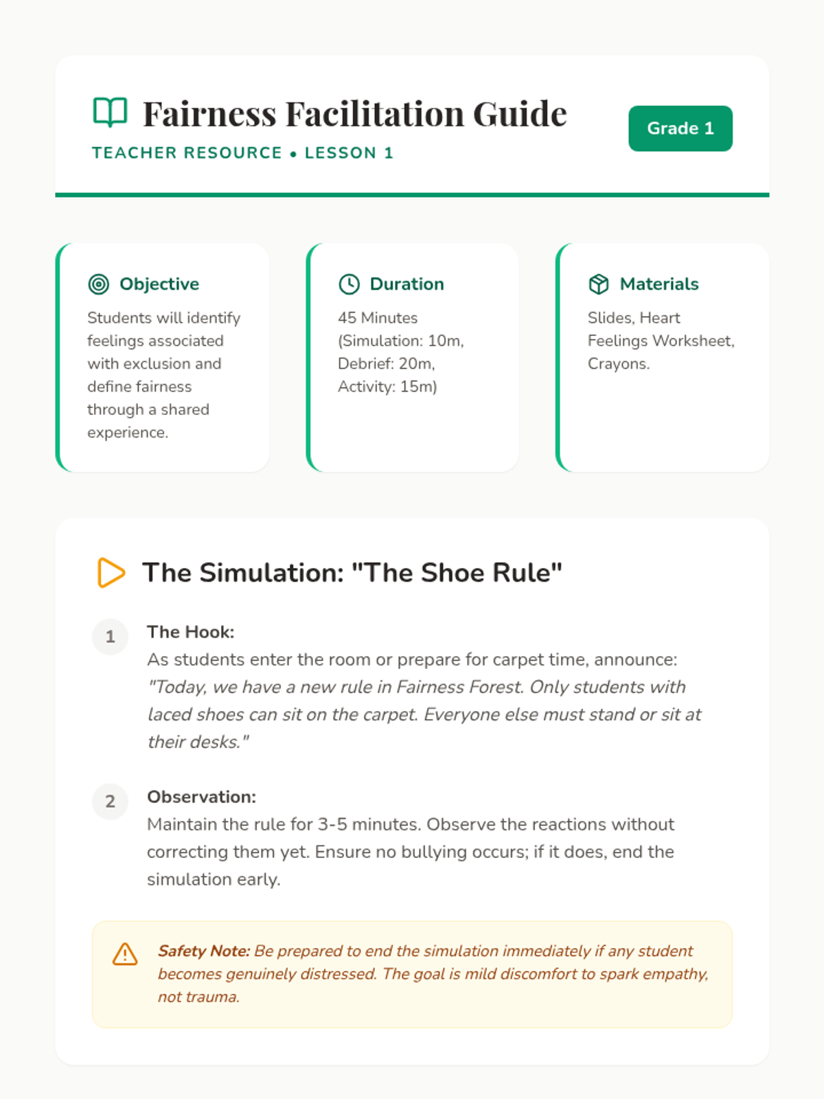 A social-emotional learning sequence for 1st graders focused on empathy, perspective-taking, and challenging exclusion. Students experience simulations, role-play, and creative projects to build an inclusive classroom community.