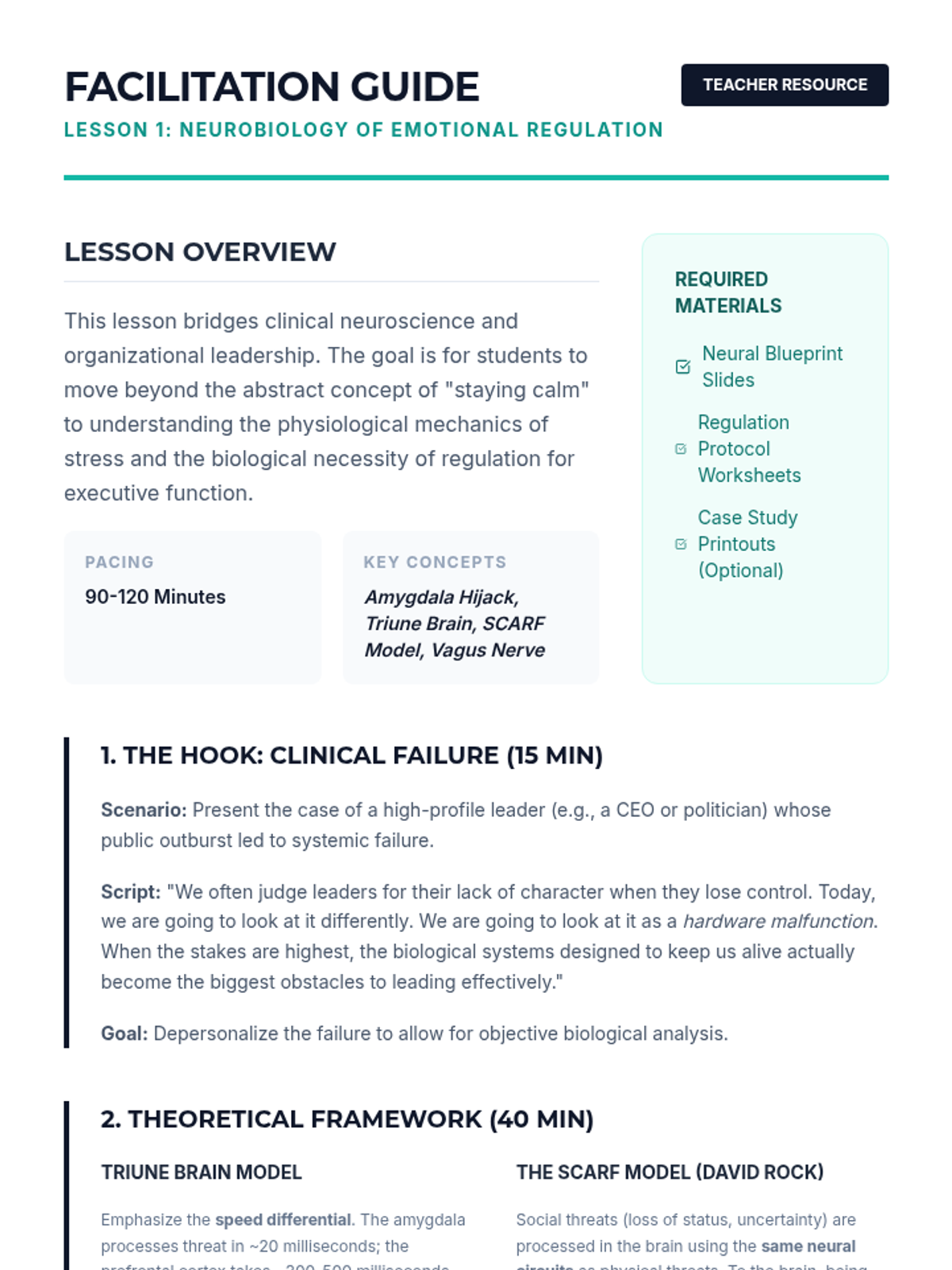 An advanced course for graduate students exploring the intersection of neurobiology, psychological theory, and organizational leadership. Students develop high-level social and emotional competencies to navigate complex professional environments and foster psychological safety.