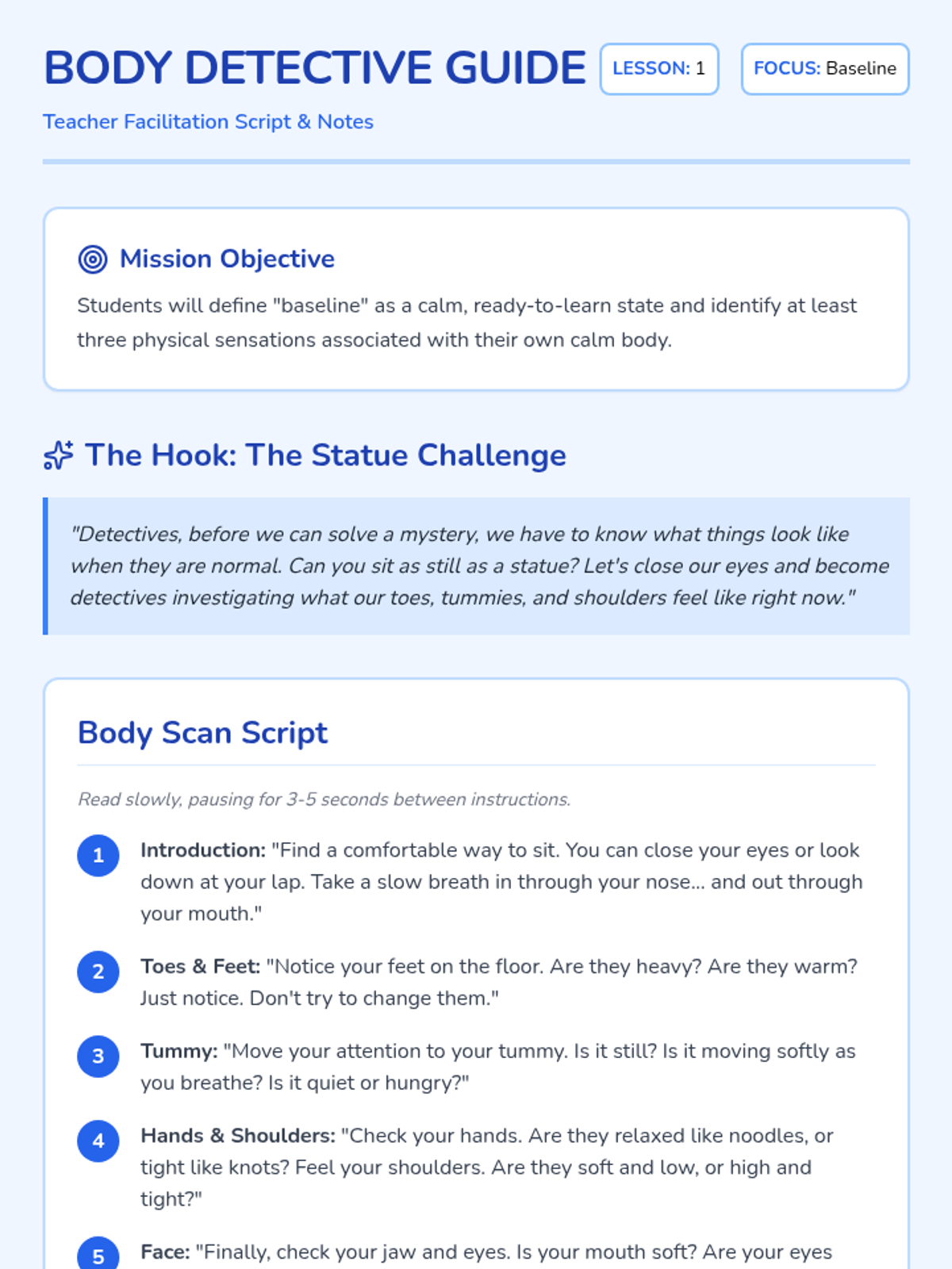 A comprehensive 5-lesson unit for 2nd graders to build somatic awareness, identifying physiological and behavioral signs of emotional escalation before they reach a crisis point. Students learn to recognize their 'baseline' calm state, map sensations to emotions, use an emotional thermometer, and identify personal warning signals.