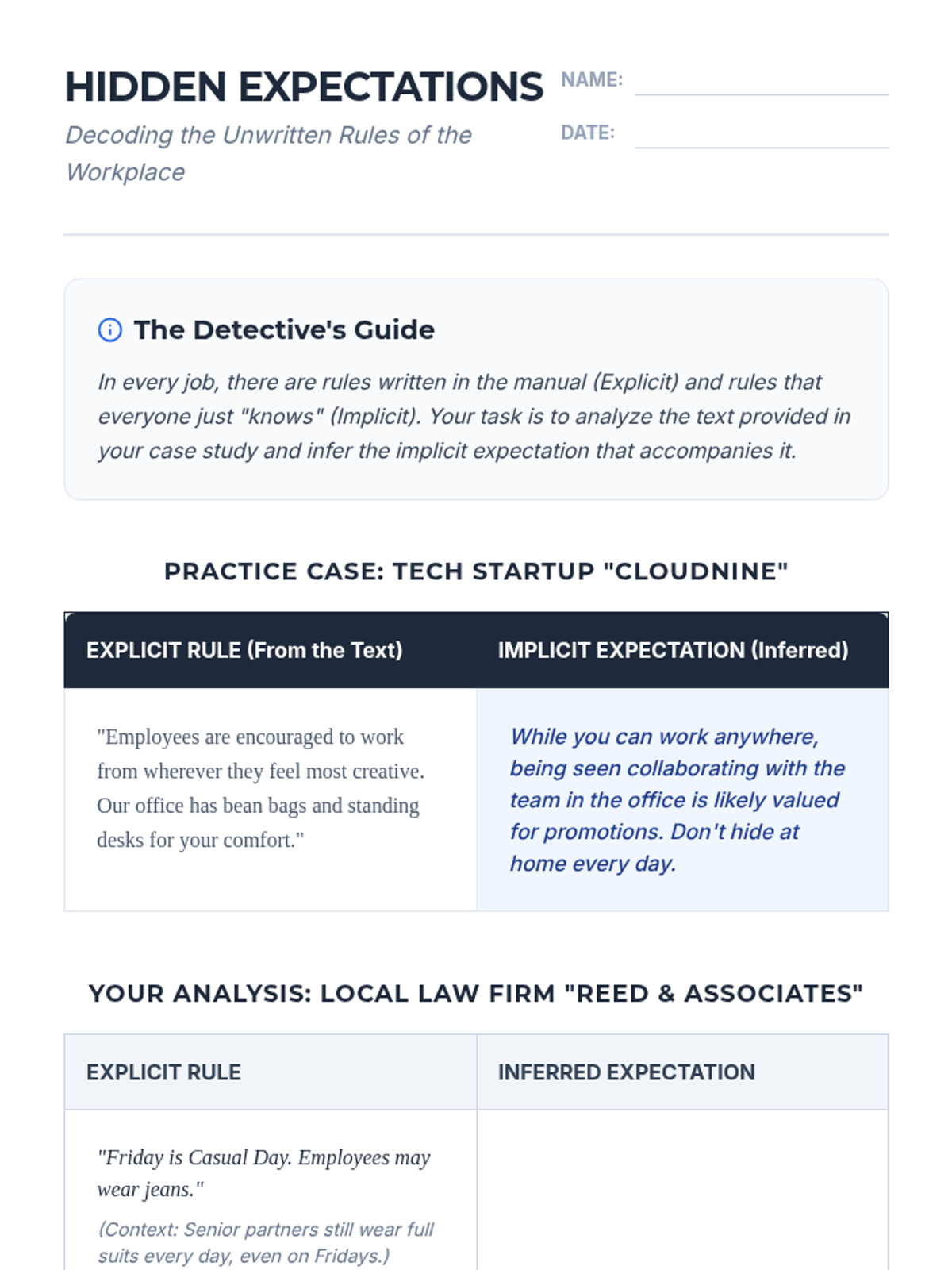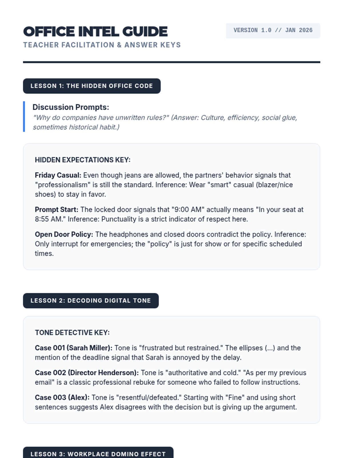 A workplace-readiness sequence for 12th-grade students focusing on inference and prediction within professional contexts. Students learn to navigate 'unwritten rules,' decode professional tone, and predict outcomes of workplace conflicts.
