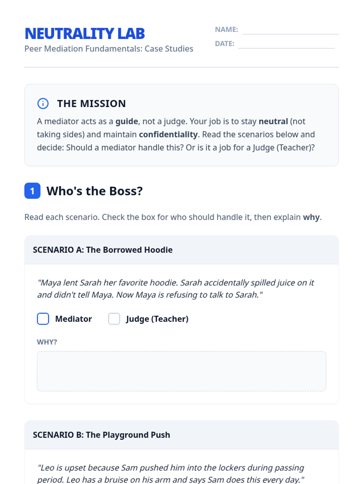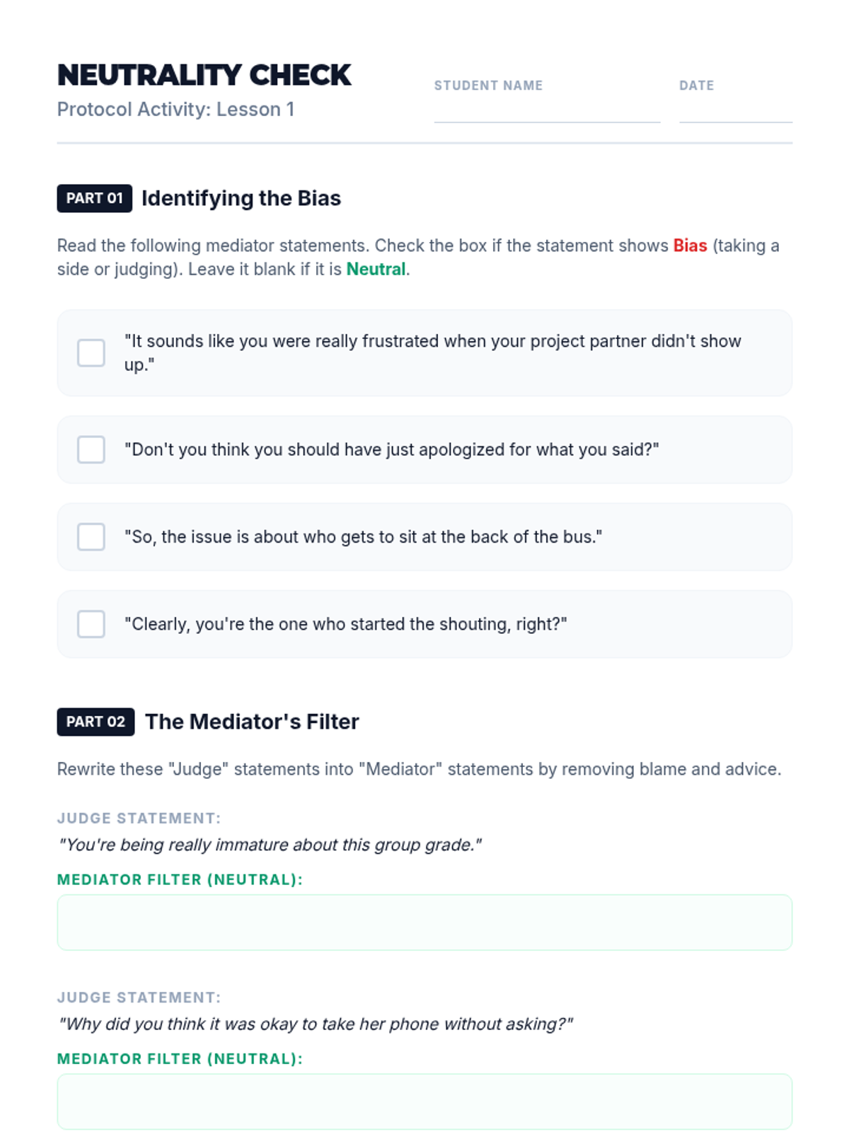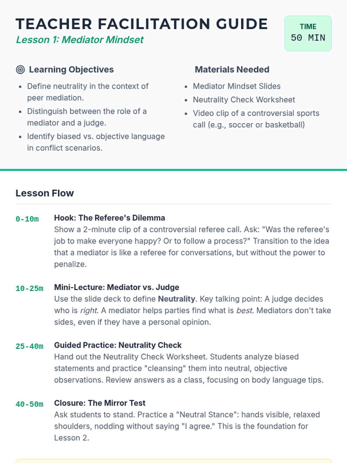 This sequence empowers students to act as third-party neutrals, introducing the specific structure and skills of Peer Mediation. Students learn the distinct phases of a mediation session, the importance of neutrality, and how to facilitate dialogue without taking sides.