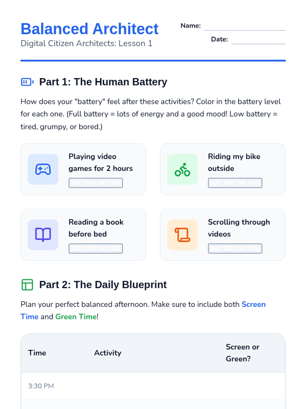 A 5-lesson sequence for 3rd graders on digital citizenship, focusing on screen time balance, intellectual property, safety rules, and family media planning. Students transition from learners to 'Digital Architects' who design their own healthy online habits.