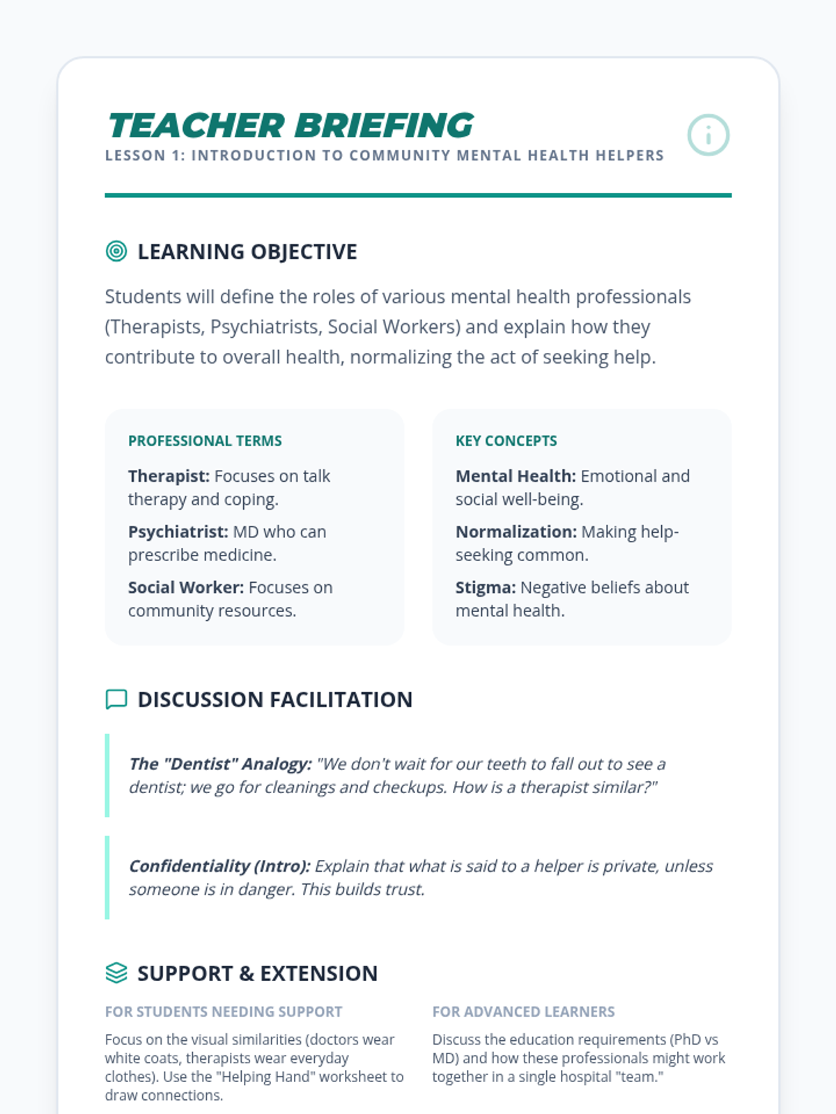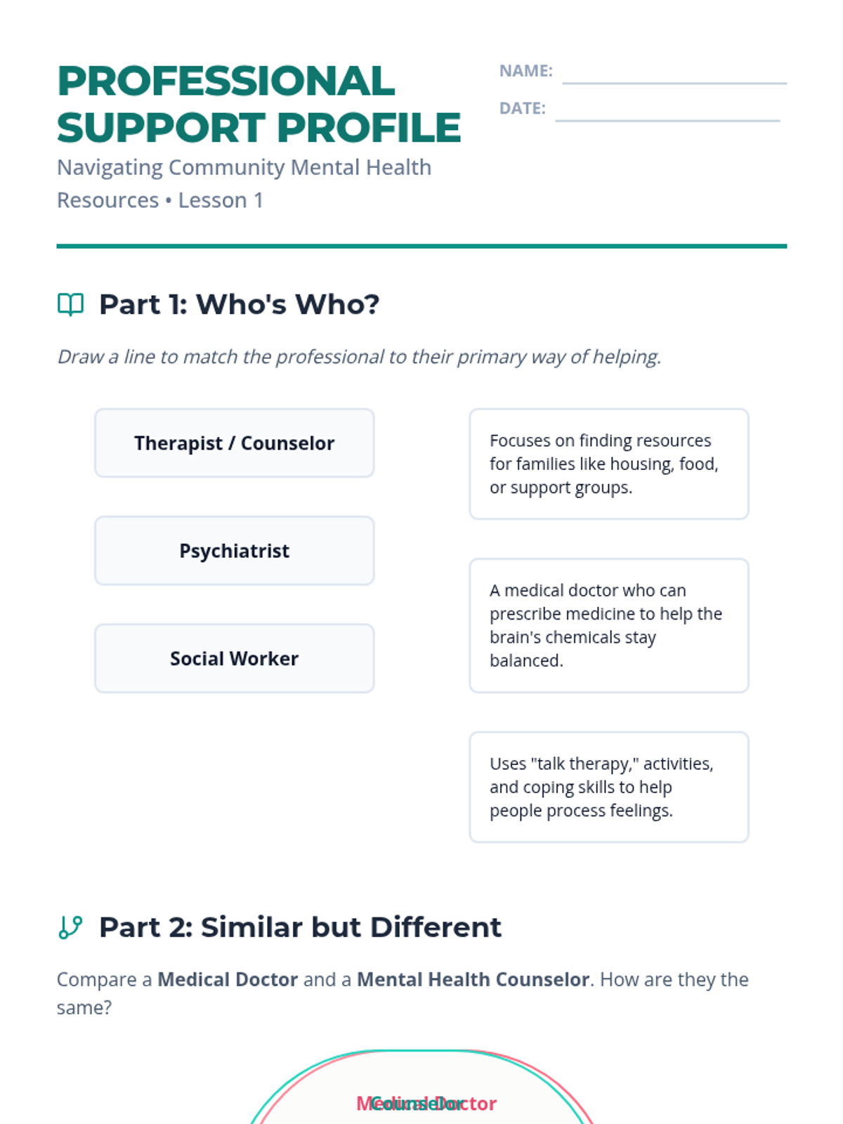 This sequence introduces 5th-grade students to community mental health resources, crisis hotlines like 988, and the different types of professionals available for support. Students learn to distinguish between emergency and non-emergency needs and practice navigating barriers to care.