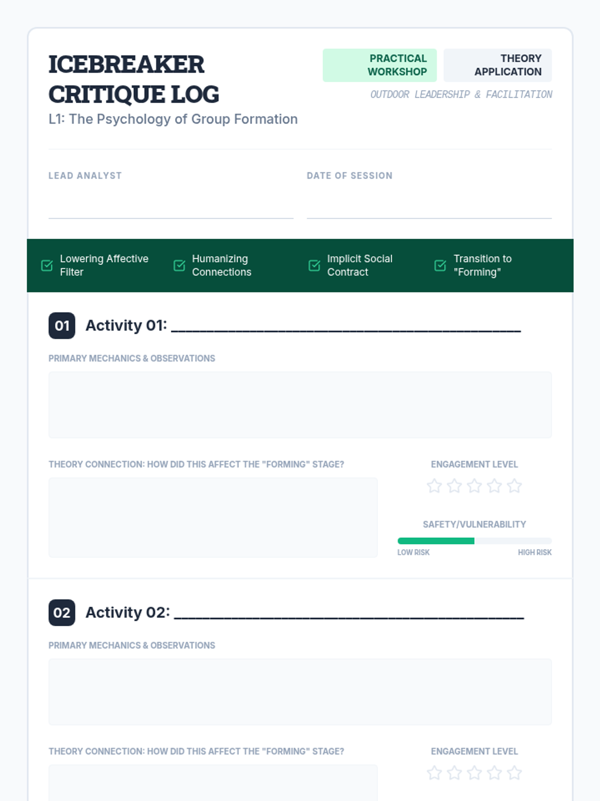 This sequence transitions undergraduate students from participants to facilitators of outdoor adventure activities. It explores group development theory, psychological safety, conflict mediation, universal design, and advanced debriefing techniques through a workshop-based approach.
