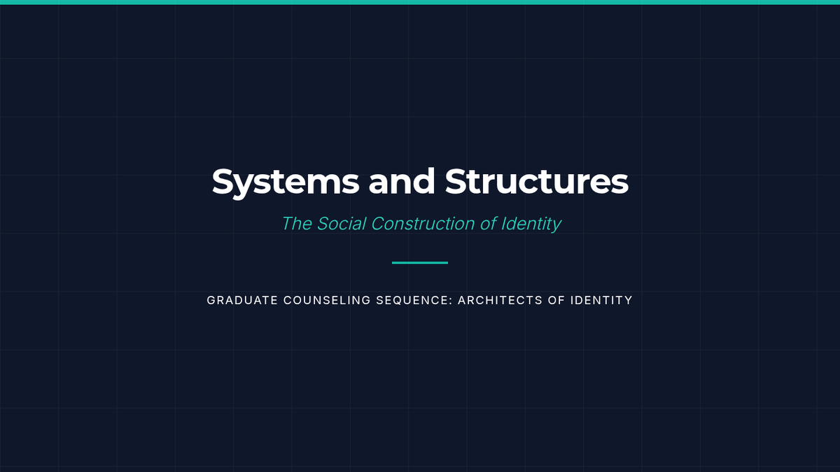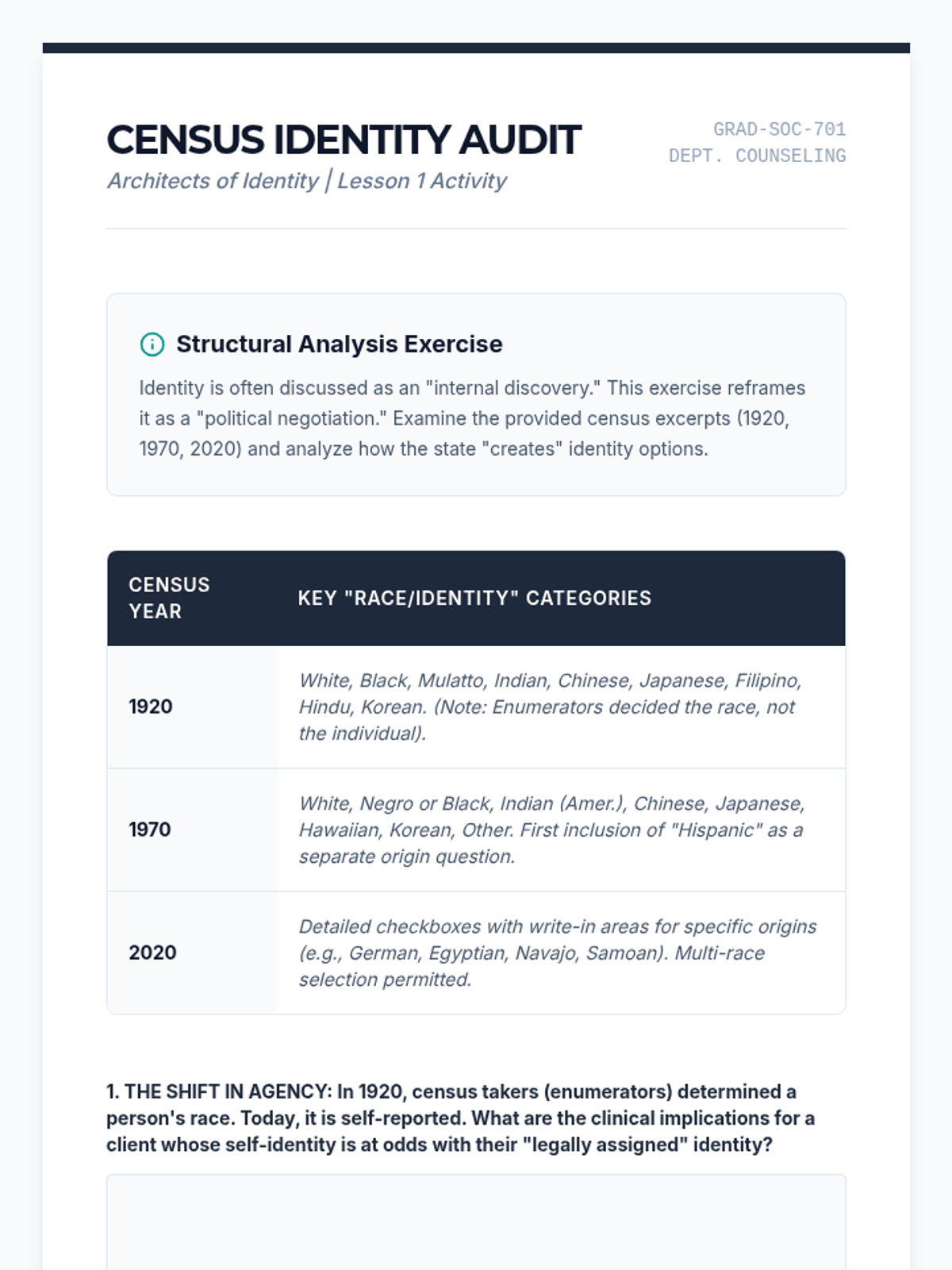 A graduate-level exploration of how social structures, laws, and algorithms construct identity, moving from sociological theory to clinical 'Structural Competency' and advocacy.