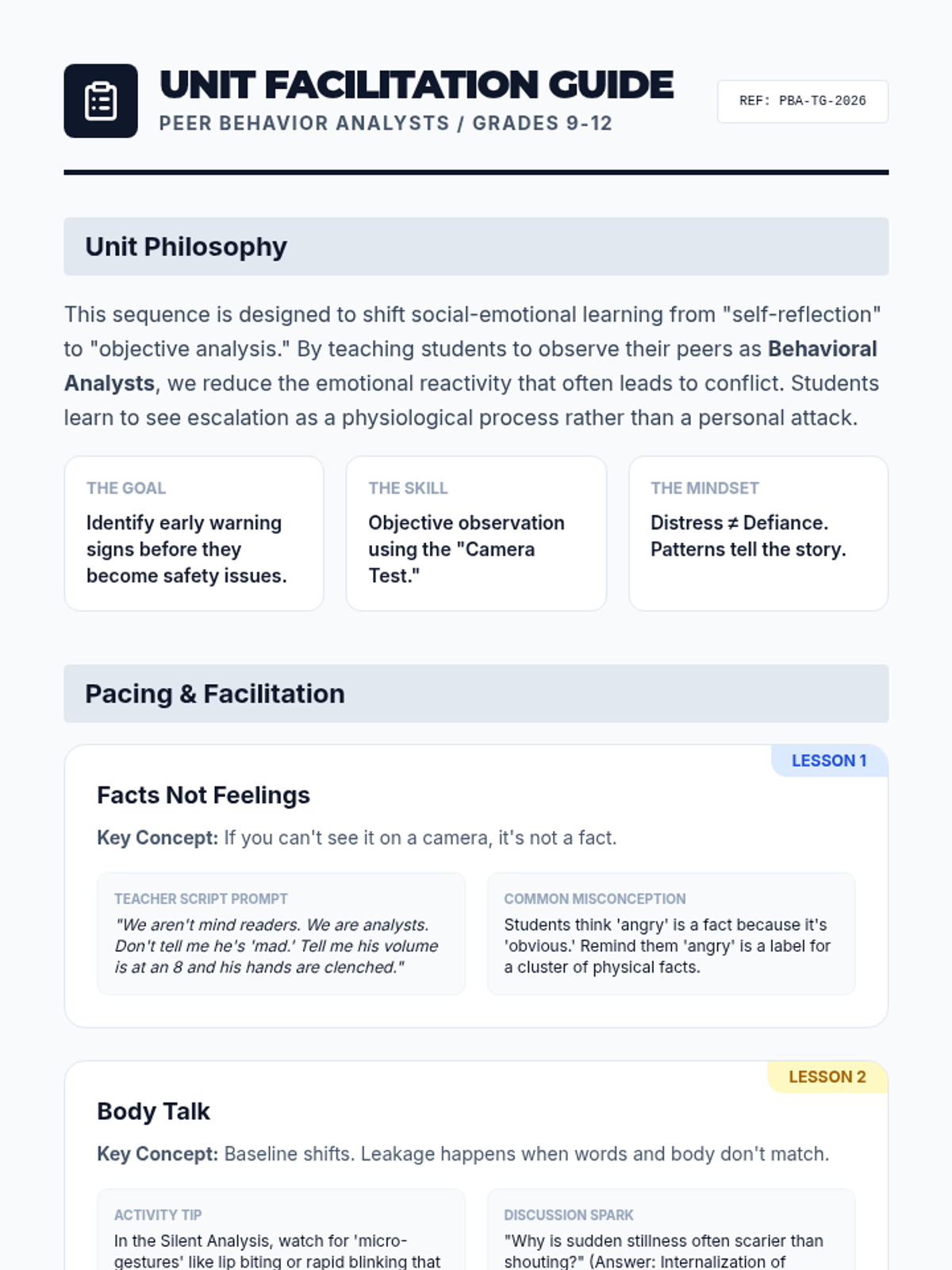 A comprehensive 5-lesson unit for 12th-grade students on identifying behavioral baselines and recognizing early warning signs of emotional escalation through analytical observation of verbal, para-verbal, and non-verbal cues.