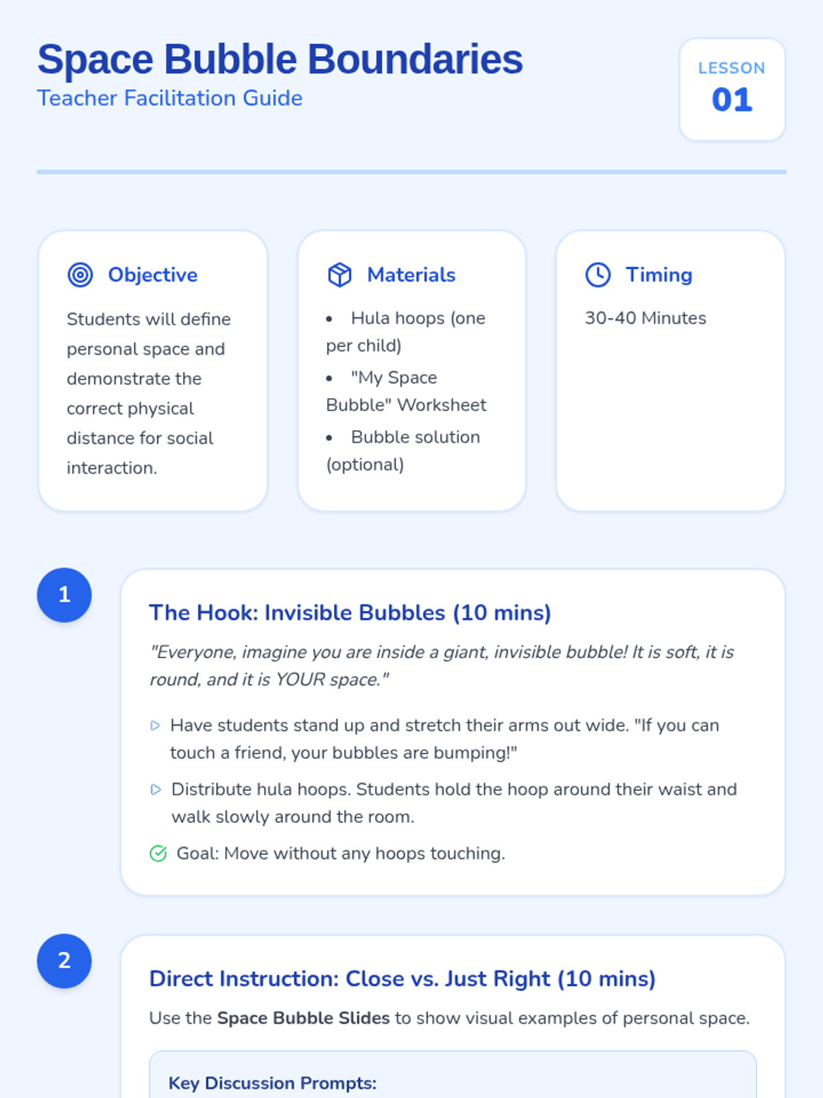 A Kindergarten social-emotional learning sequence focused on building positive peer interaction skills through social scripting, personal boundaries, and conflict resolution. Students use role-play and visual stories to internalize strategies for sharing, joining groups, and handling social rejection.