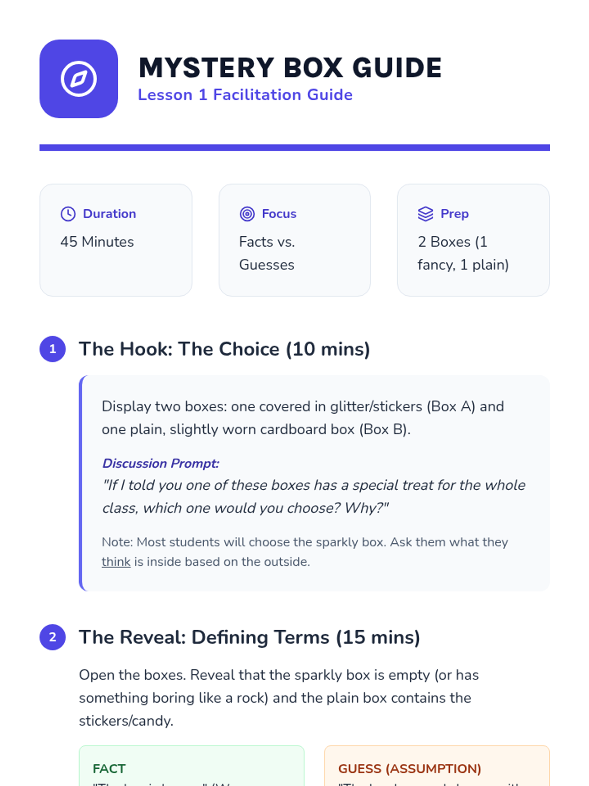 This simulation-heavy sequence trains 8th-grade students to act as neutral peer mediators. Students move from establishing ground rules and neutrality to mastering advanced communication skills like reframing and open-ended questioning, culminating in a full mock mediation of complex social conflicts.