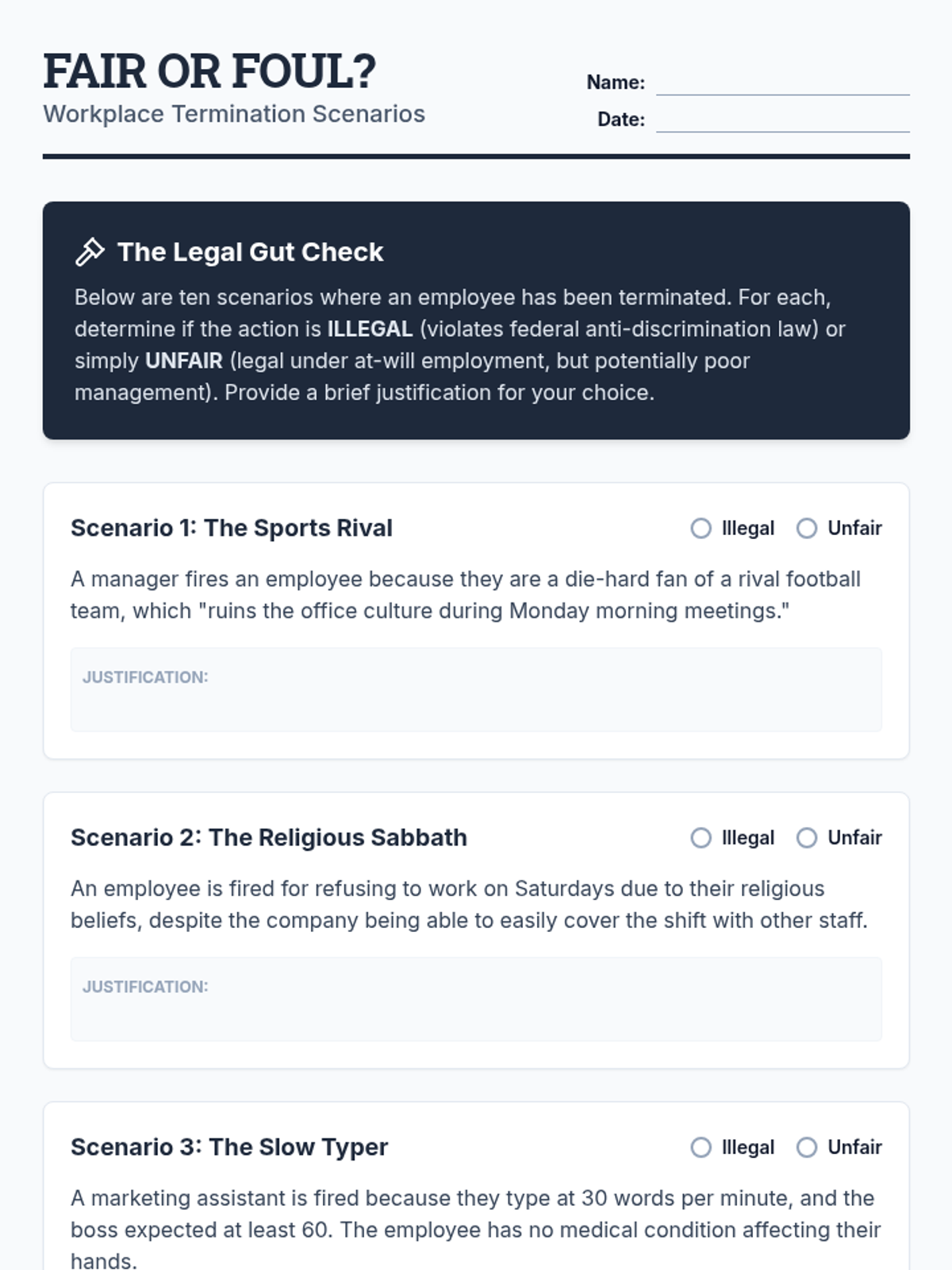 This sequence immerses undergraduate students in the federal legal frameworks of workplace discrimination and harassment, focusing on Title VII, the ADA, and the ADEA. Students learn to distinguish between general conflict and legally actionable harassment through case law analysis and real-world simulation.