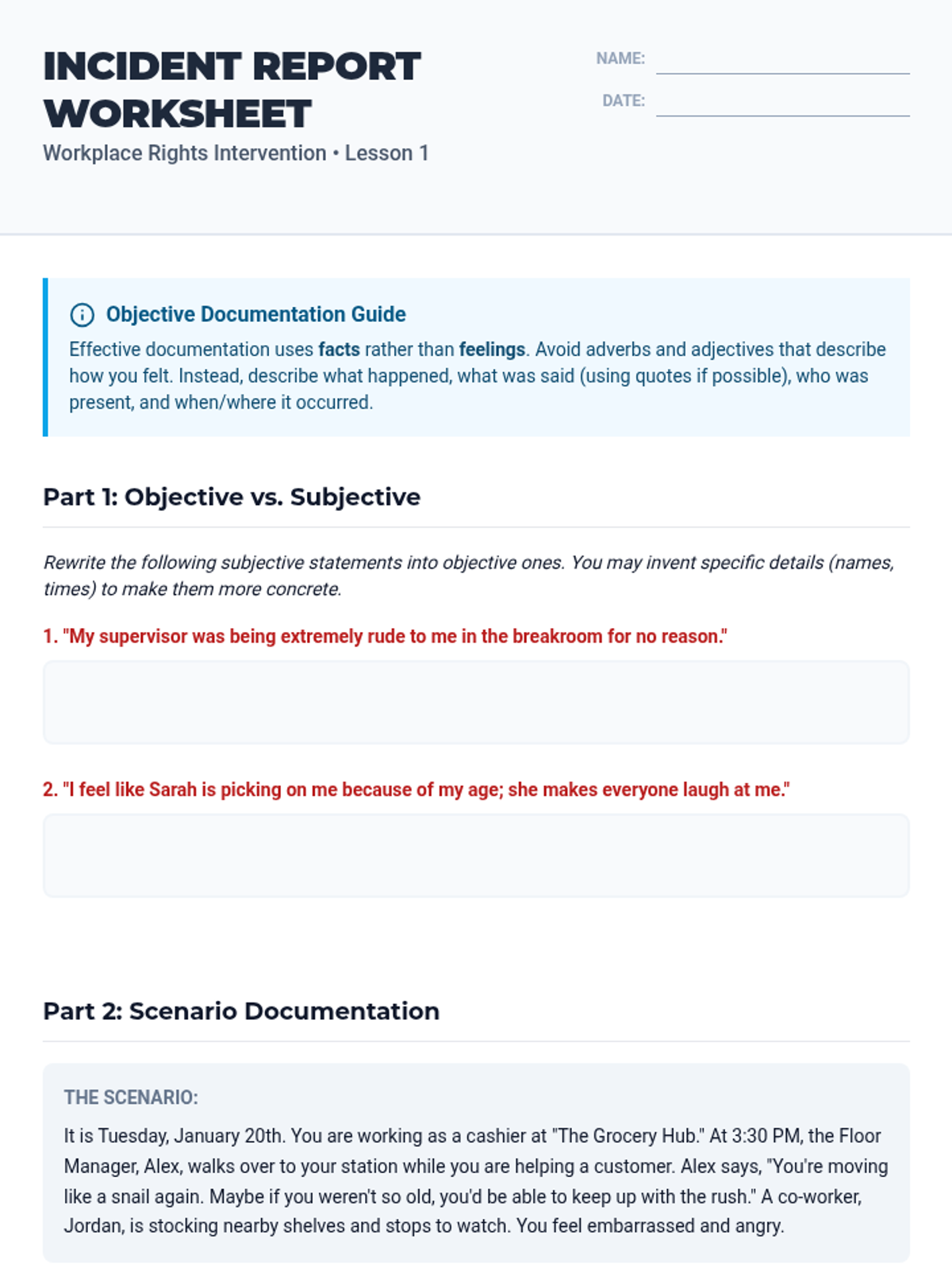 This sequence shifts from identification to action, equipping students with the tools to report misconduct and intervene safely. Students learn the formal mechanisms for reporting discrimination, protections against retaliation, and the '4 Ds' of bystander intervention.
