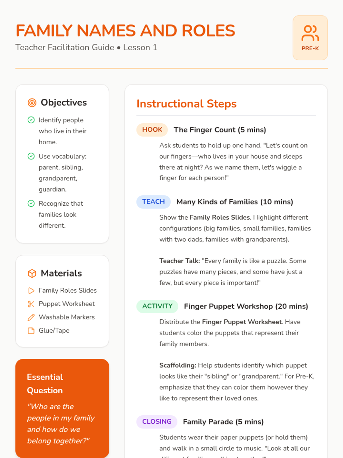 A Pre-K sequence focused on family identity, helping children recognize their roles, celebrate their home culture, and see their classroom as a supportive community.