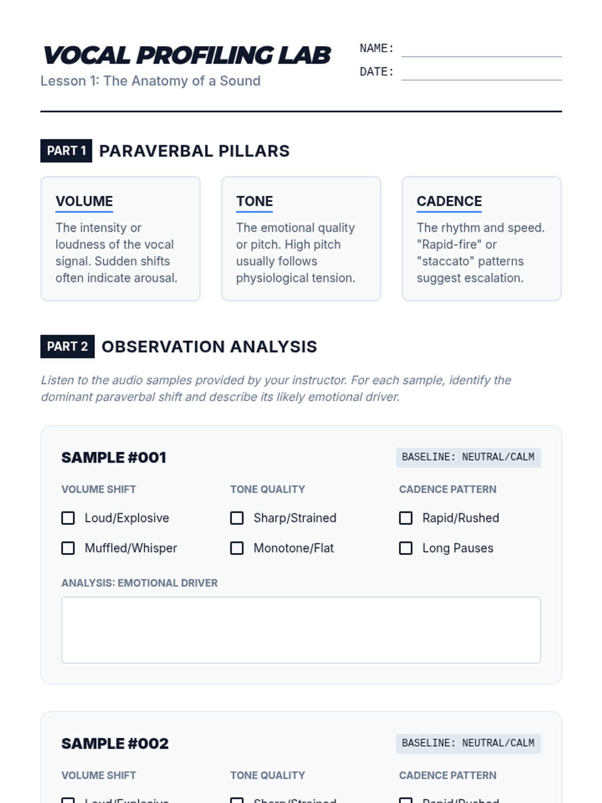 A comprehensive 11th-grade sequence focusing on auditory and paraverbal warning signs of behavioral escalation. Students learn to analyze tone, volume, cadence, and speech patterns to identify emotional states and prevent conflict.
