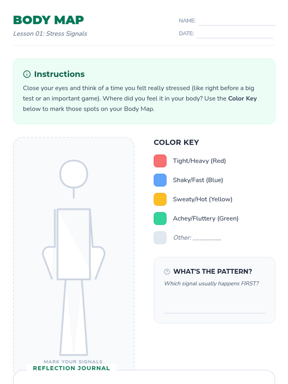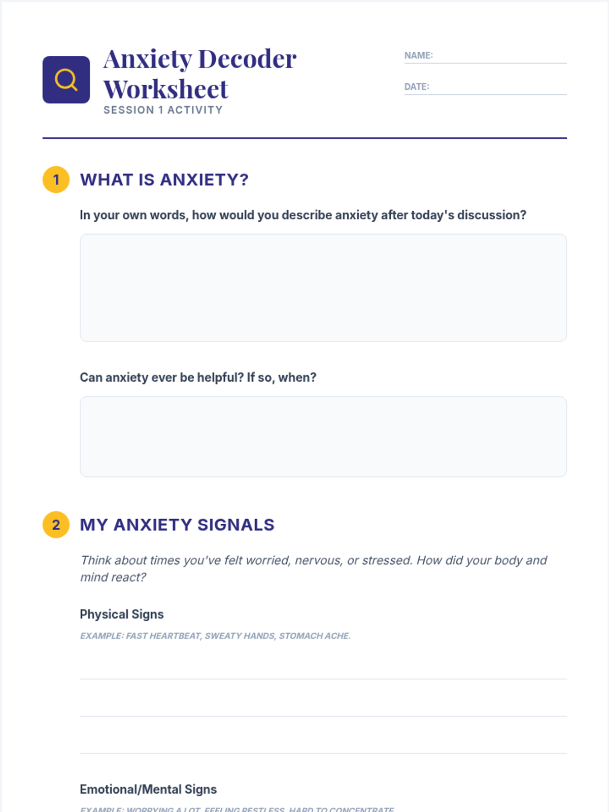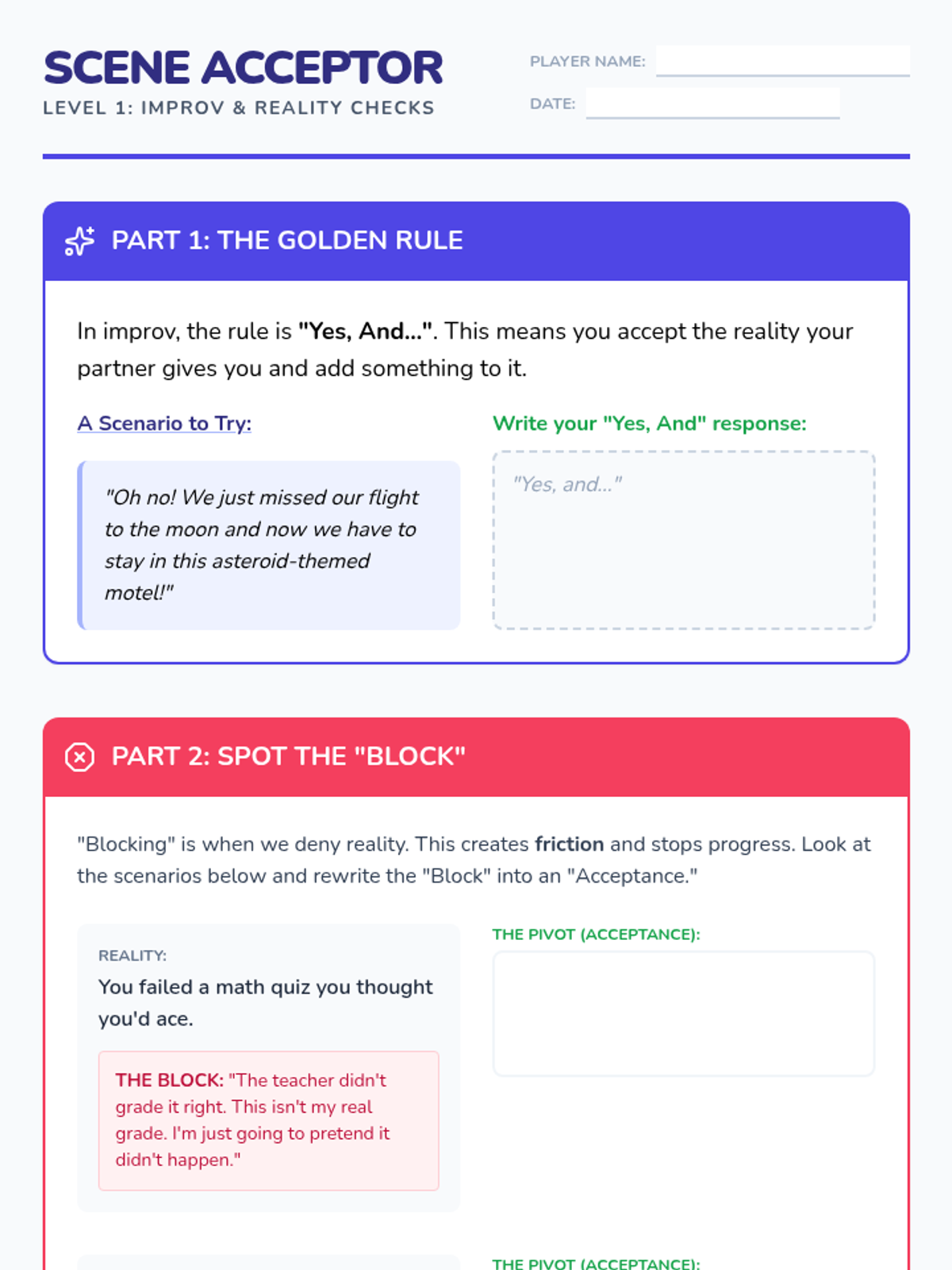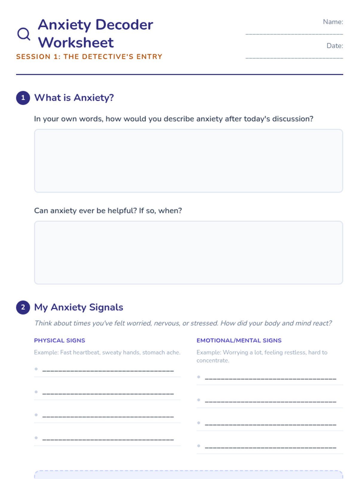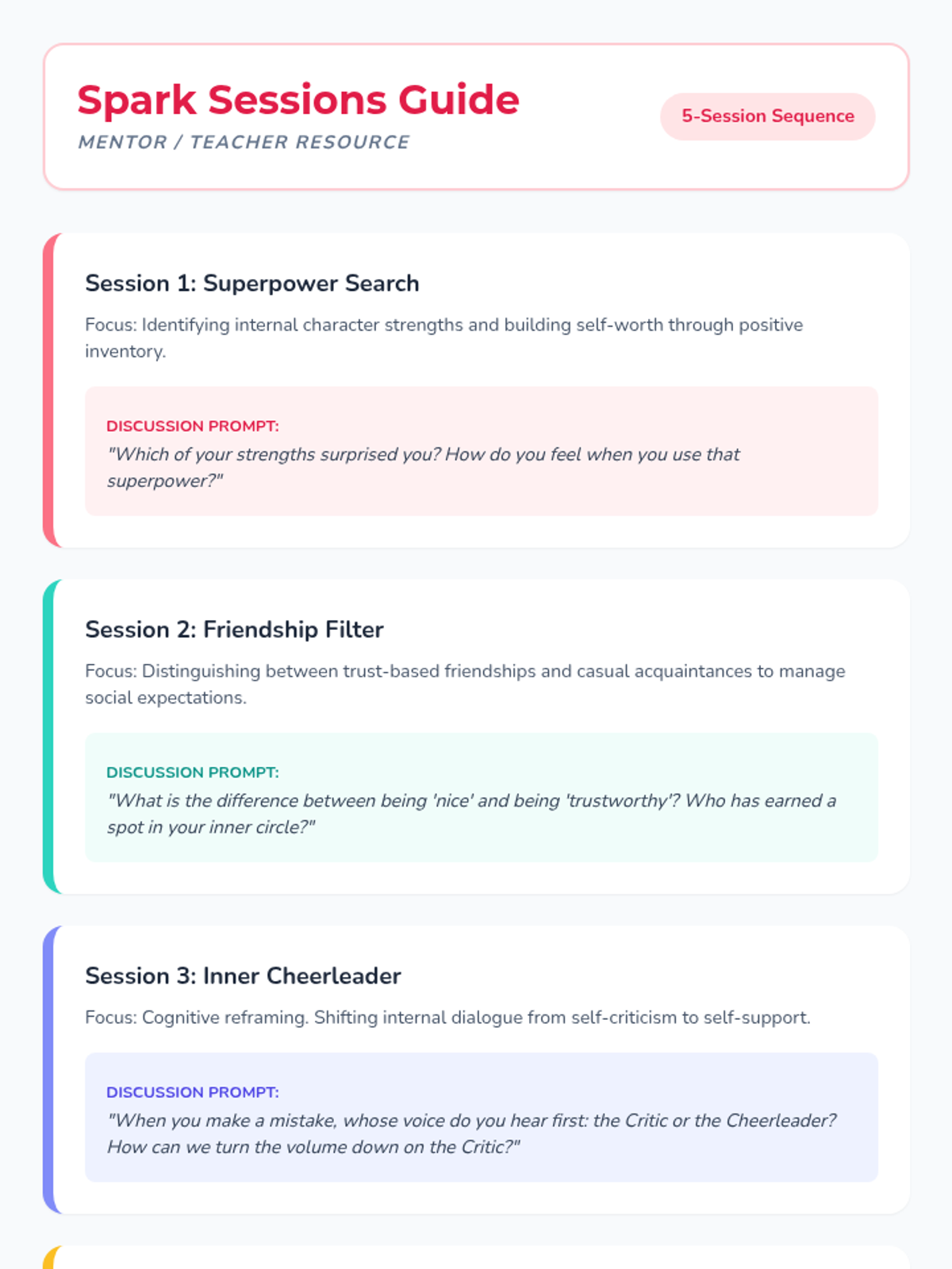 A high-energy, 35-minute workshop for a duo of middle school boys. Framed as a performance challenge, it gamifies identifying unhelpful thoughts, practicing positive self-talk, and mastering communication circuits.