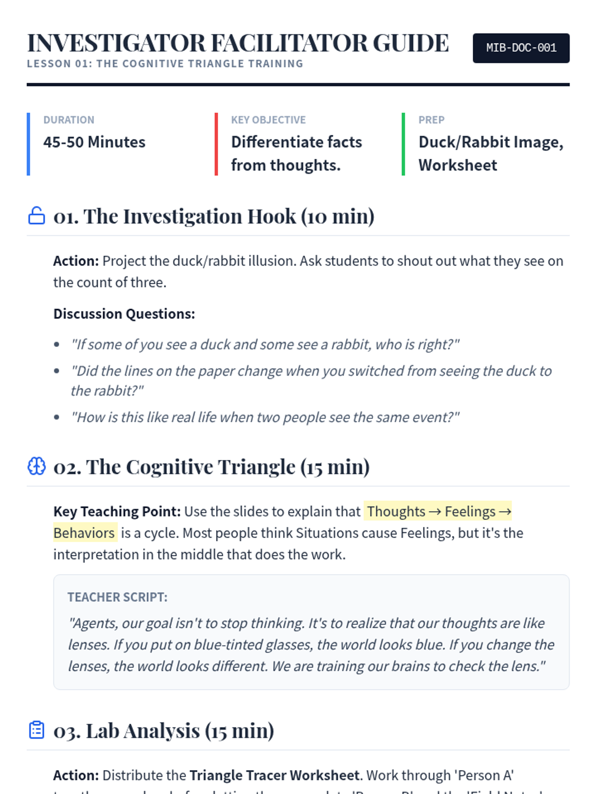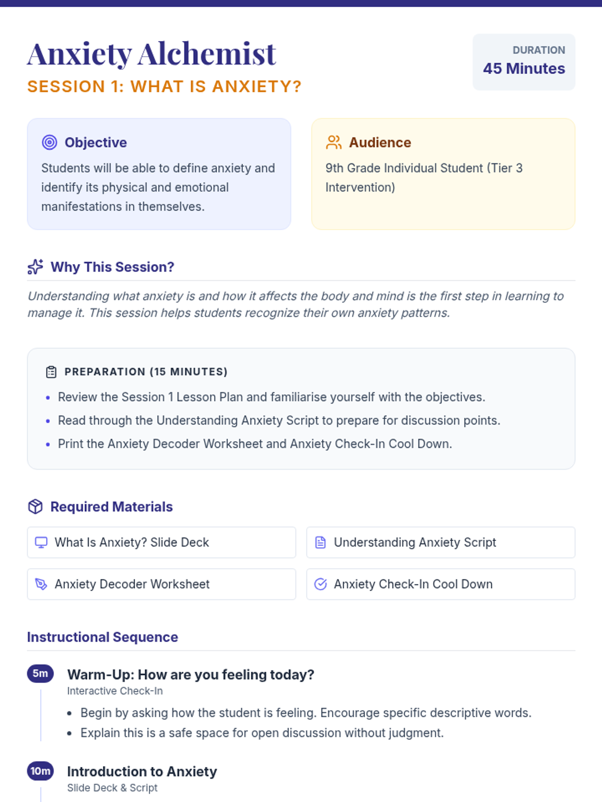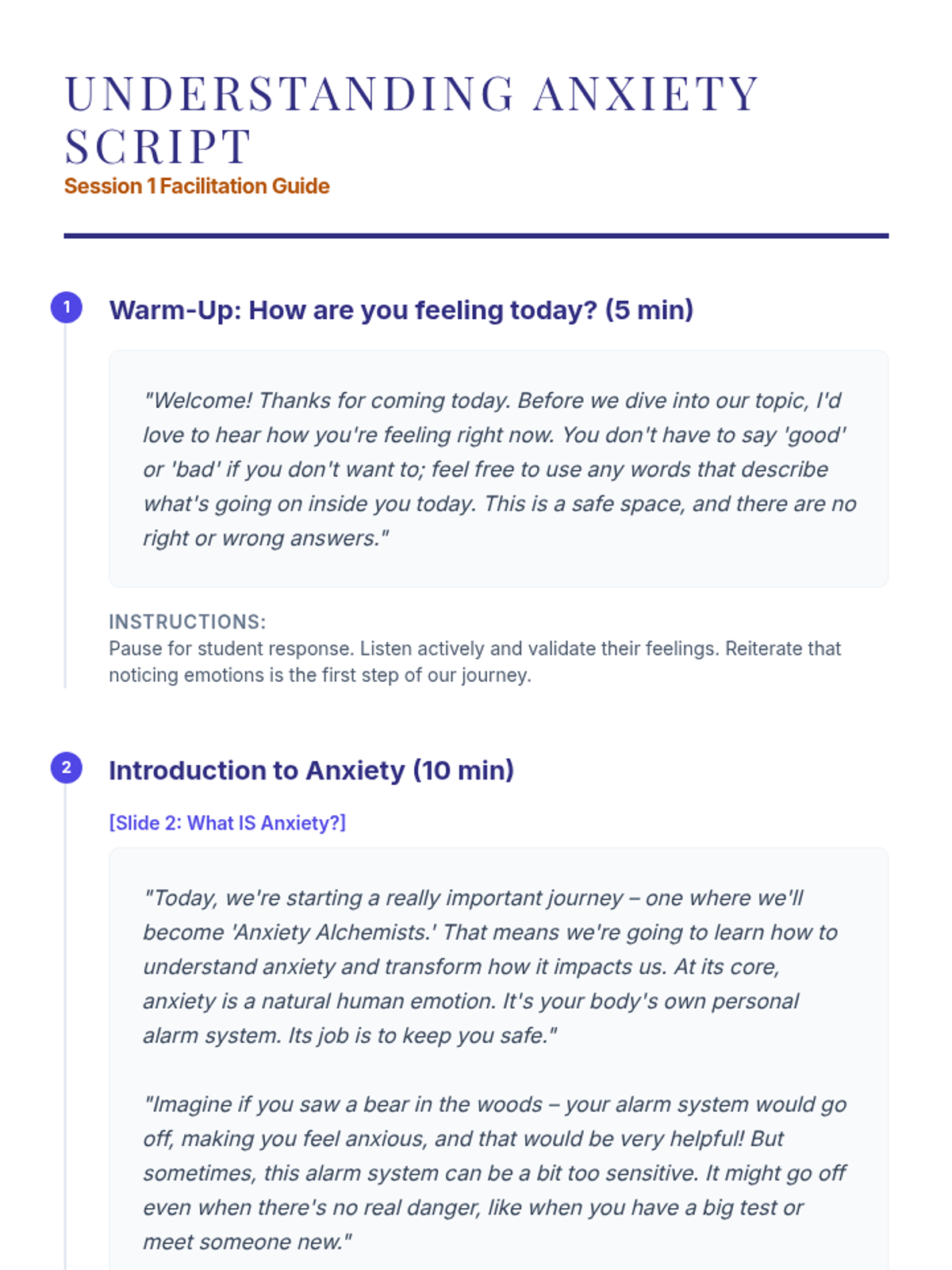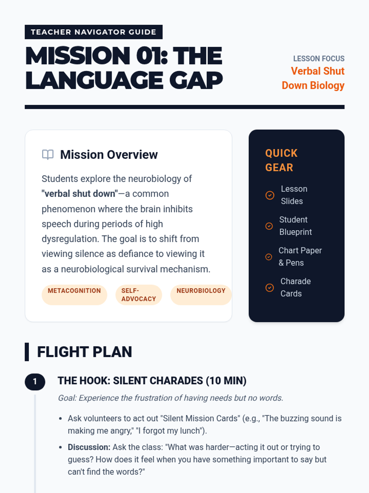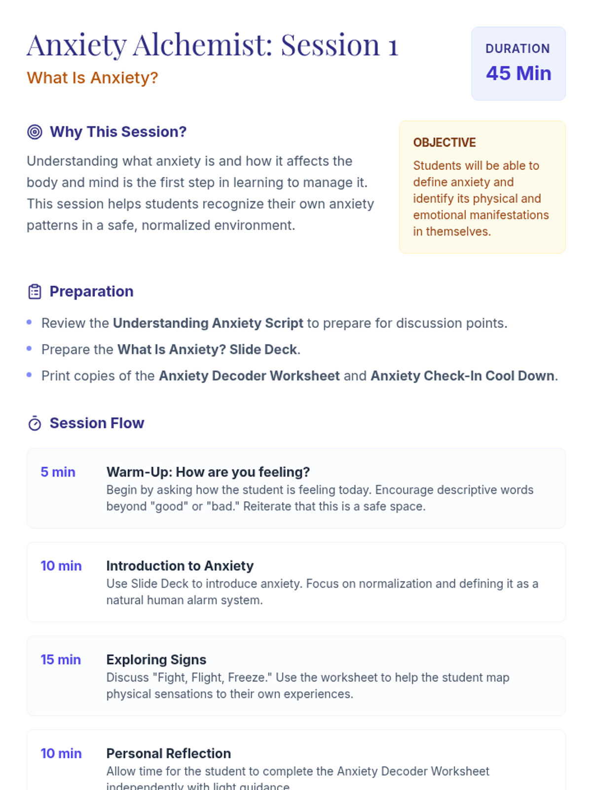 A high-energy, 35-minute workshop for a duo of middle school boys. Framed as a performance challenge, it gamifies identifying unhelpful thoughts, practicing positive self-talk, and mastering communication circuits.
