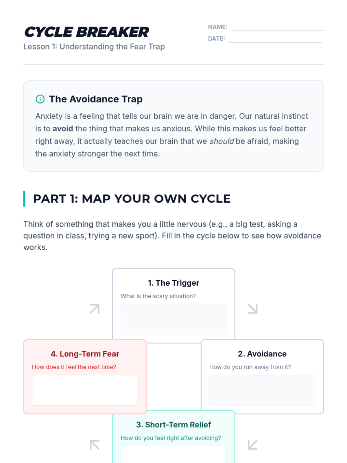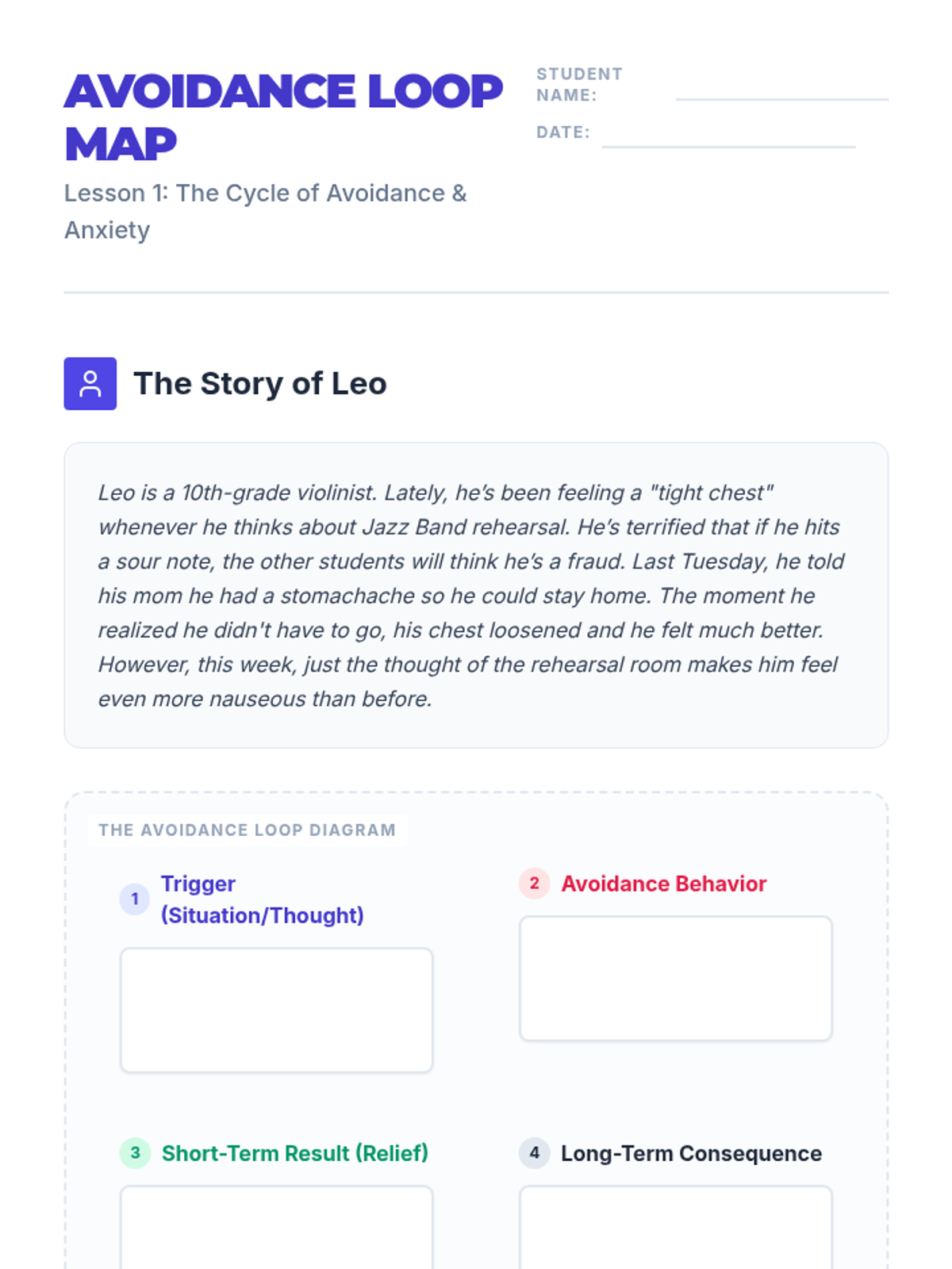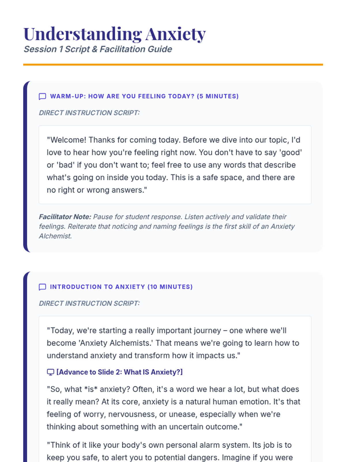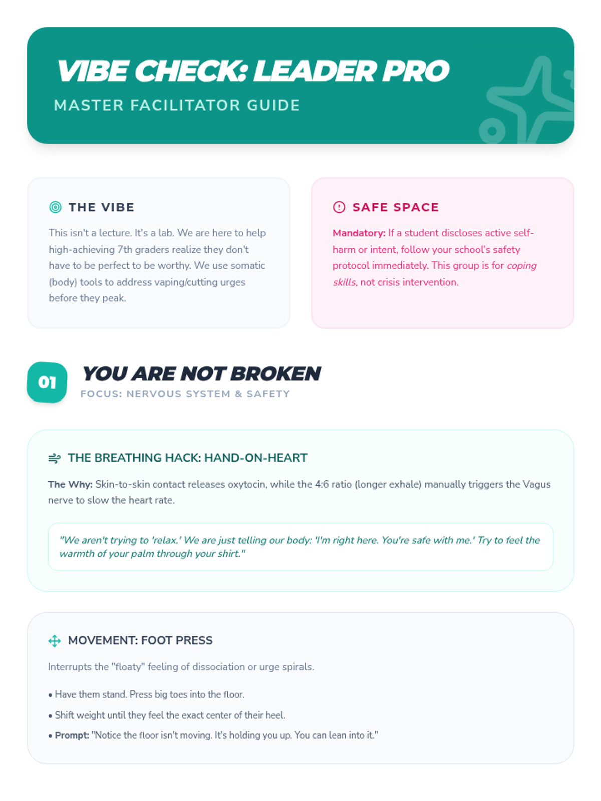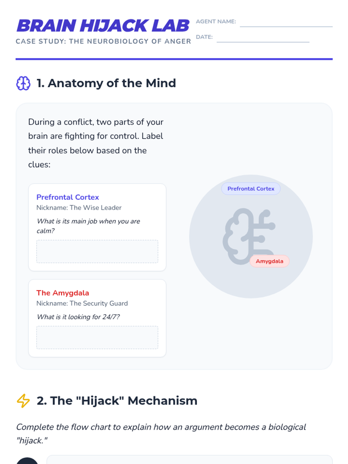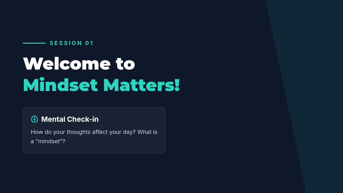 A high-energy, 35-minute workshop for a duo of middle school boys. Framed as a performance challenge, it gamifies identifying unhelpful thoughts, practicing positive self-talk, and mastering communication circuits.