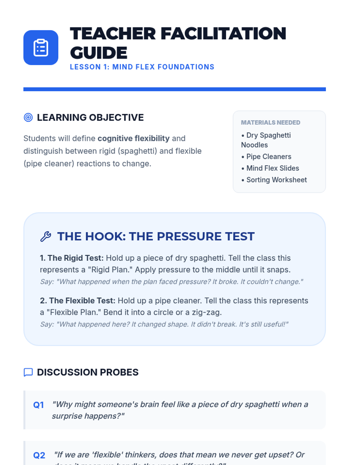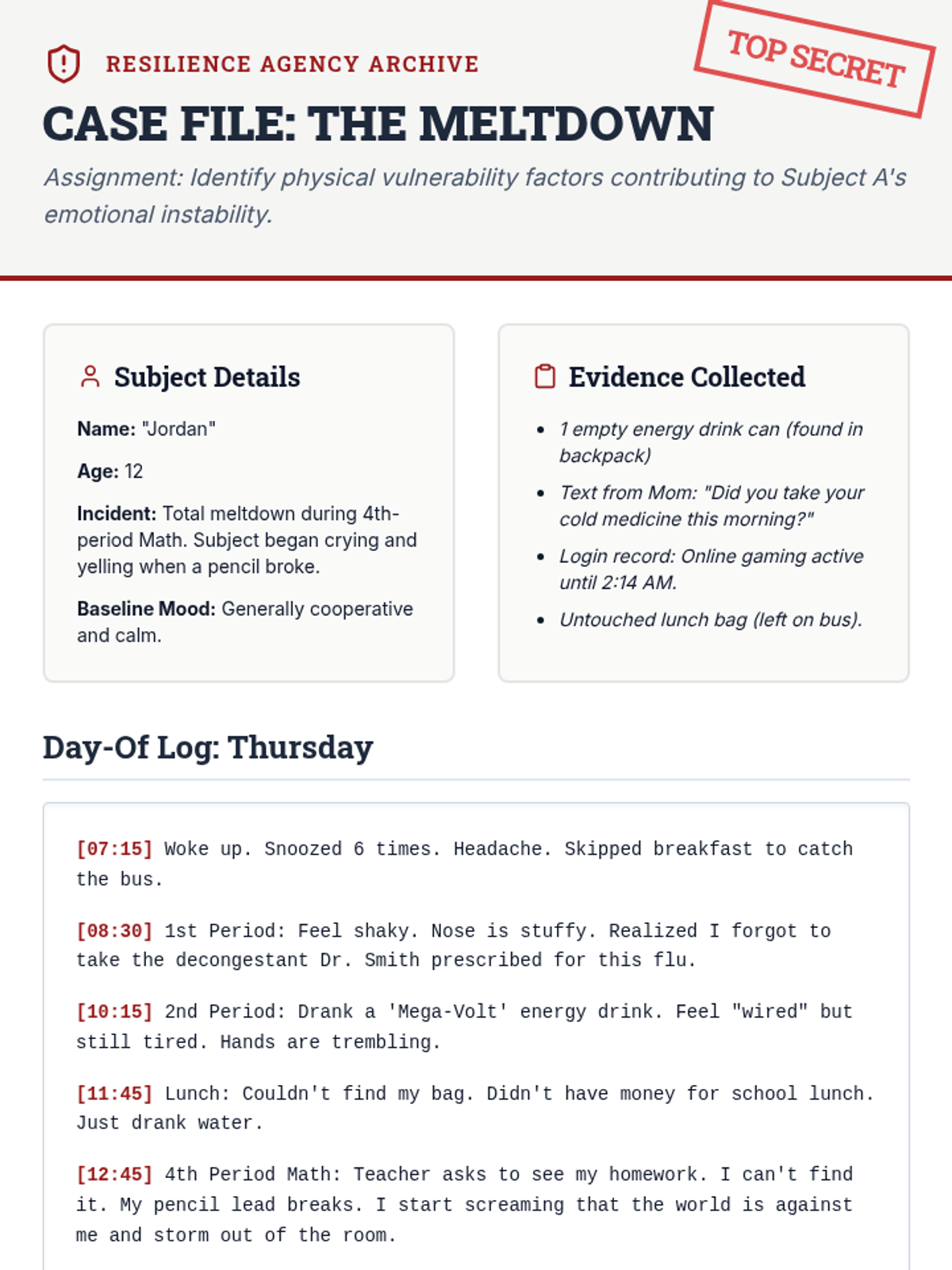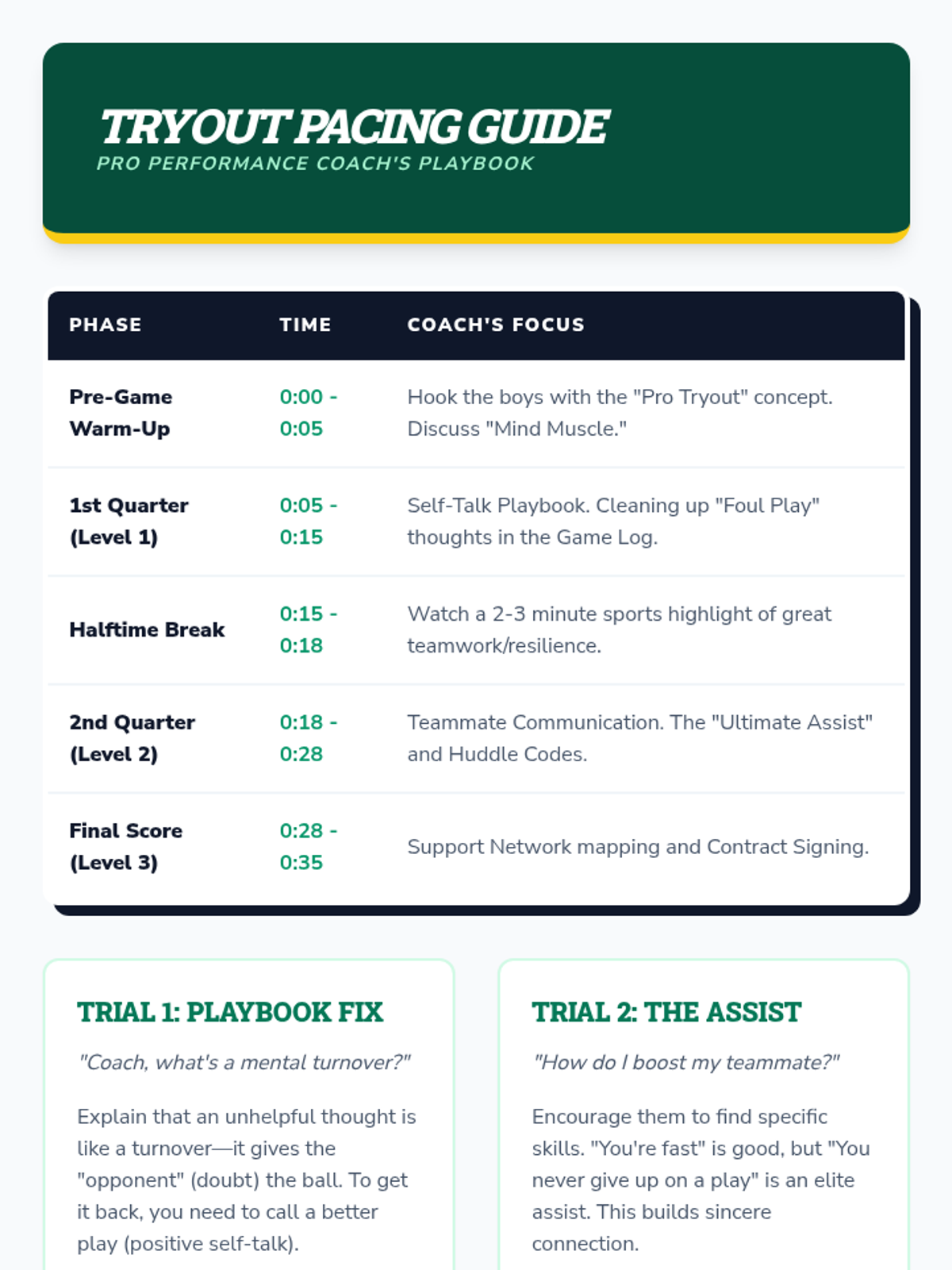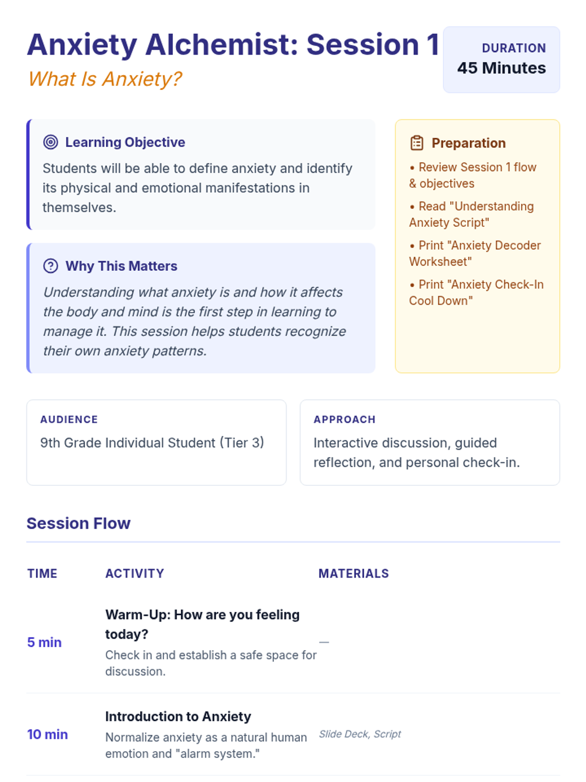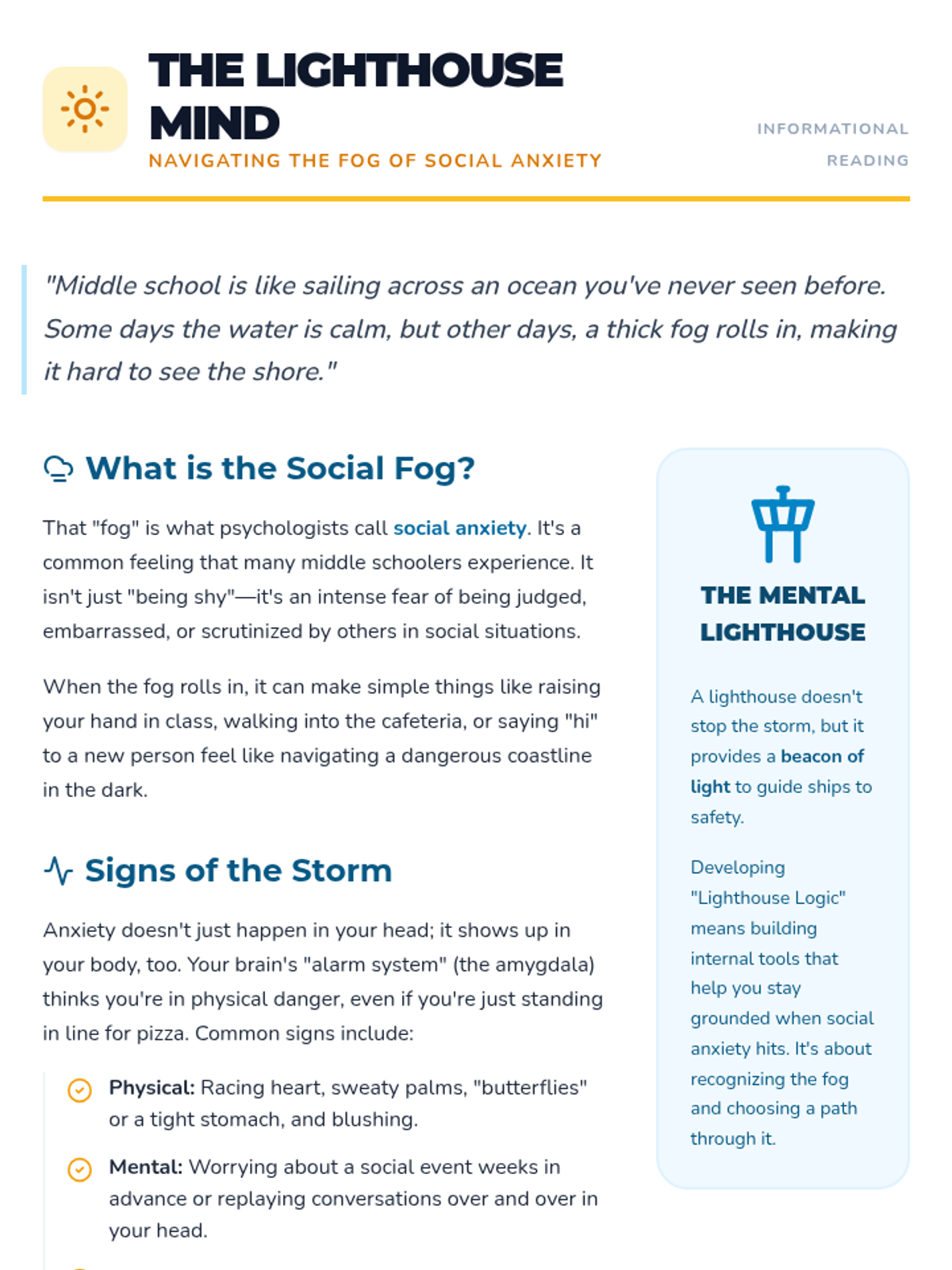 A high-energy, 35-minute workshop for a duo of middle school boys. Framed as a performance challenge, it gamifies identifying unhelpful thoughts, practicing positive self-talk, and mastering communication circuits.