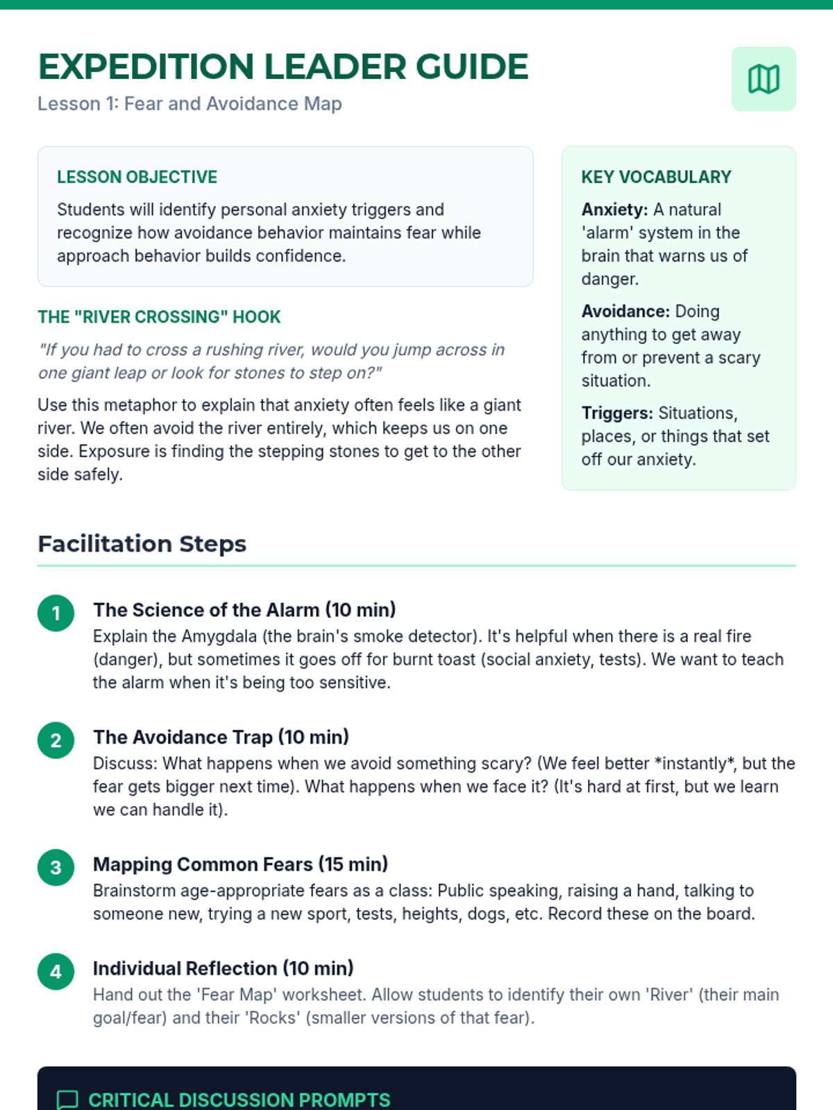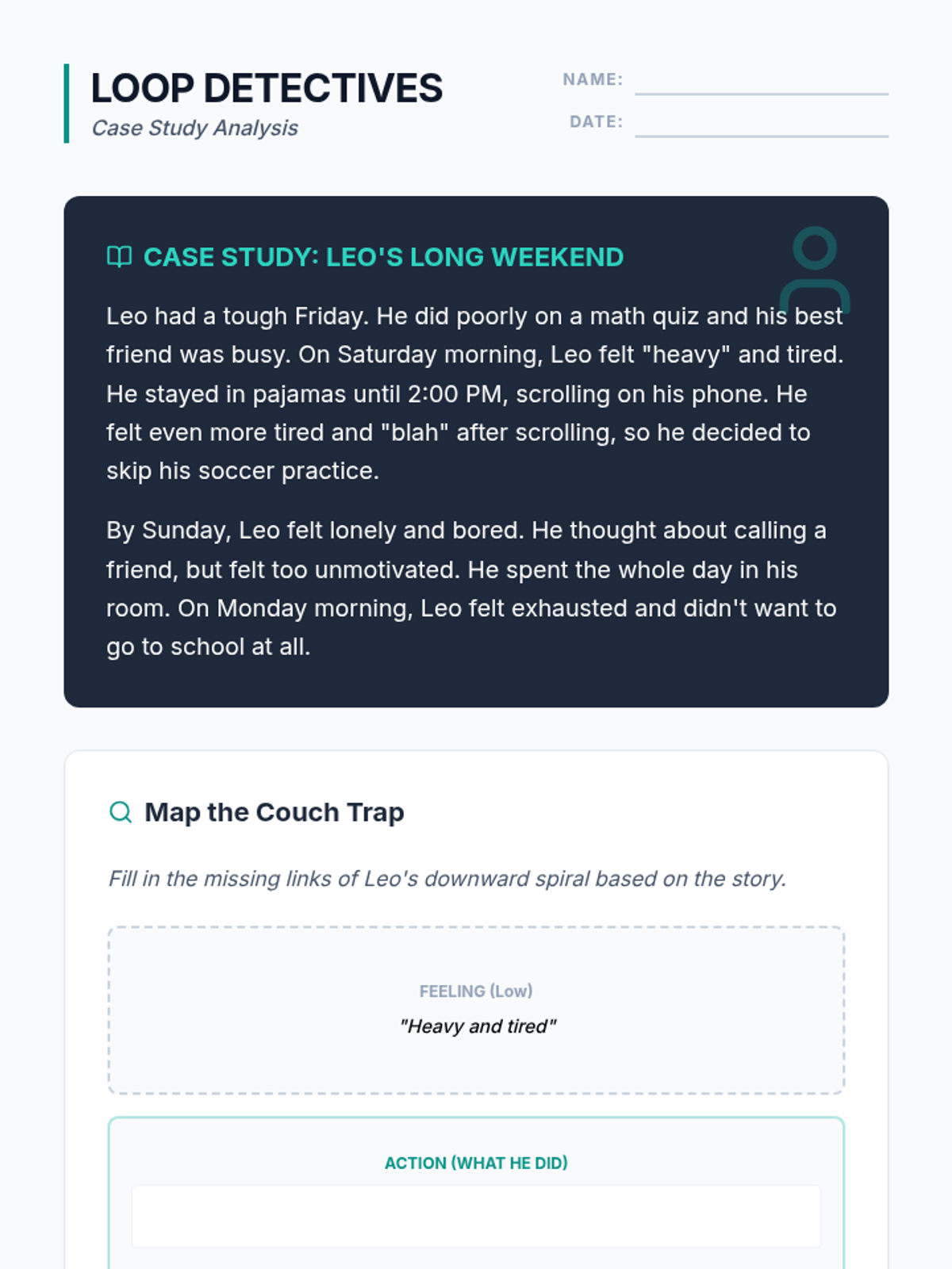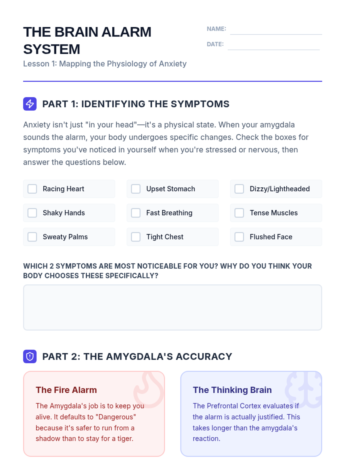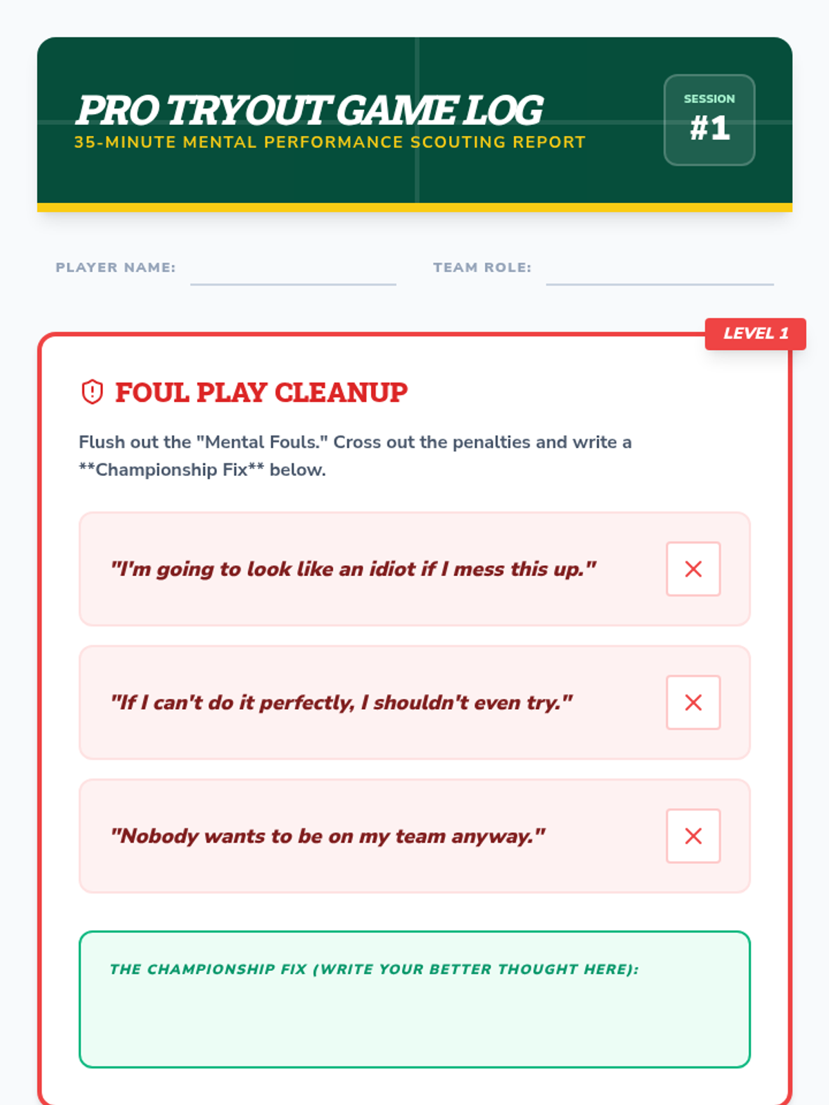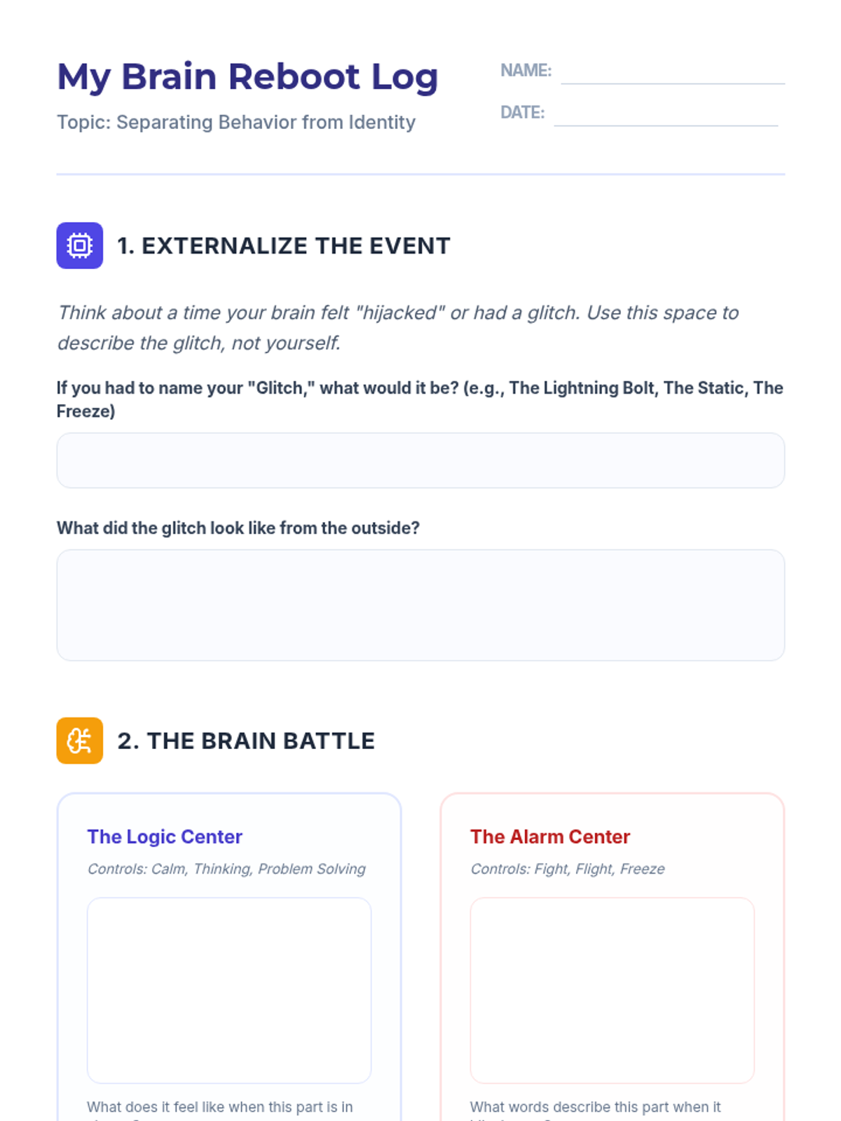A high-energy, 35-minute workshop for a duo of middle school boys. Framed as a performance challenge, it gamifies identifying unhelpful thoughts, practicing positive self-talk, and mastering communication circuits.