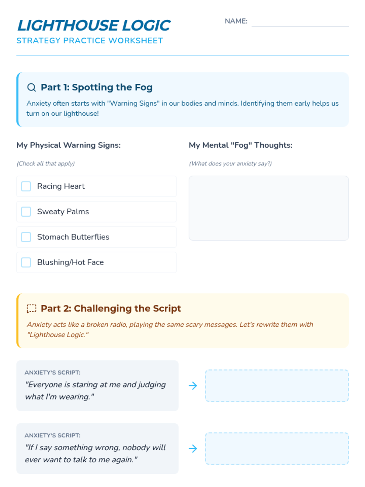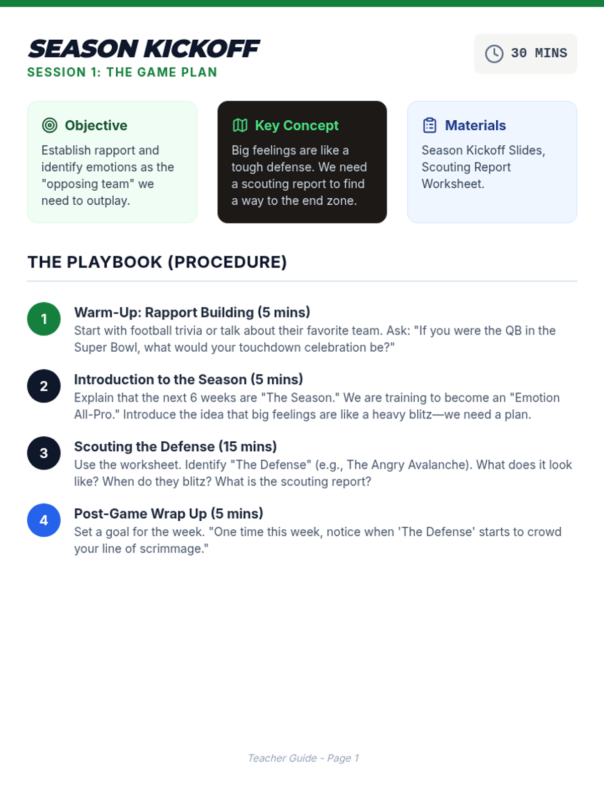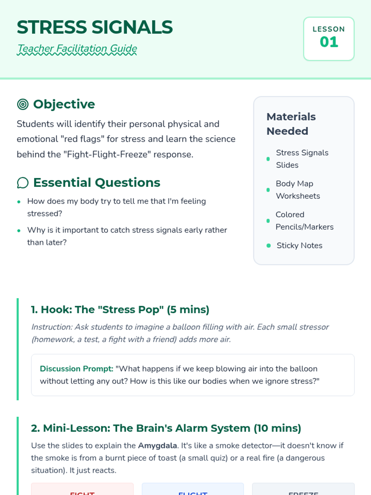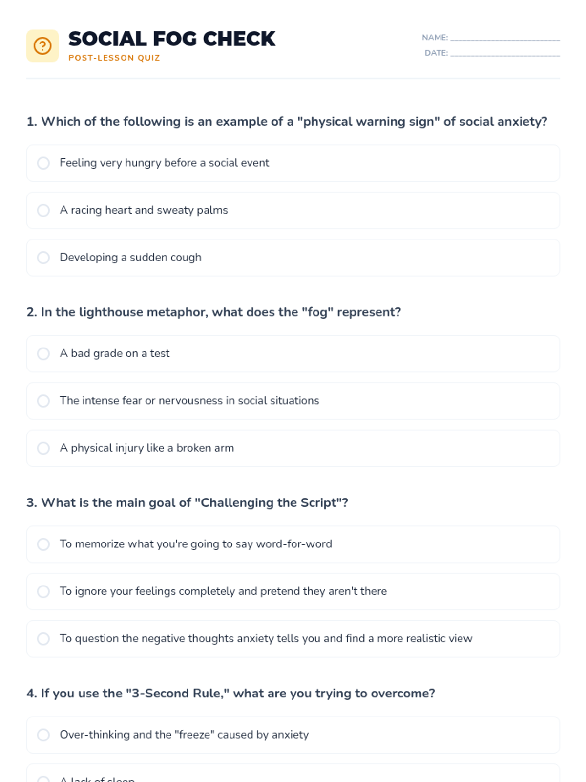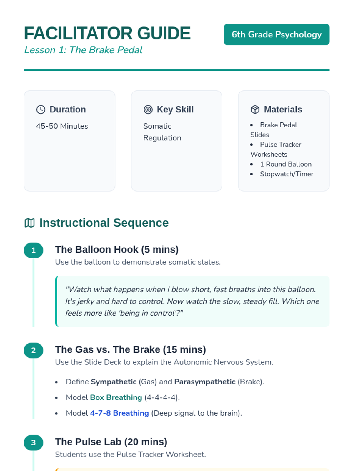 A high-energy, 35-minute workshop for a duo of middle school boys. Framed as a performance challenge, it gamifies identifying unhelpful thoughts, practicing positive self-talk, and mastering communication circuits.